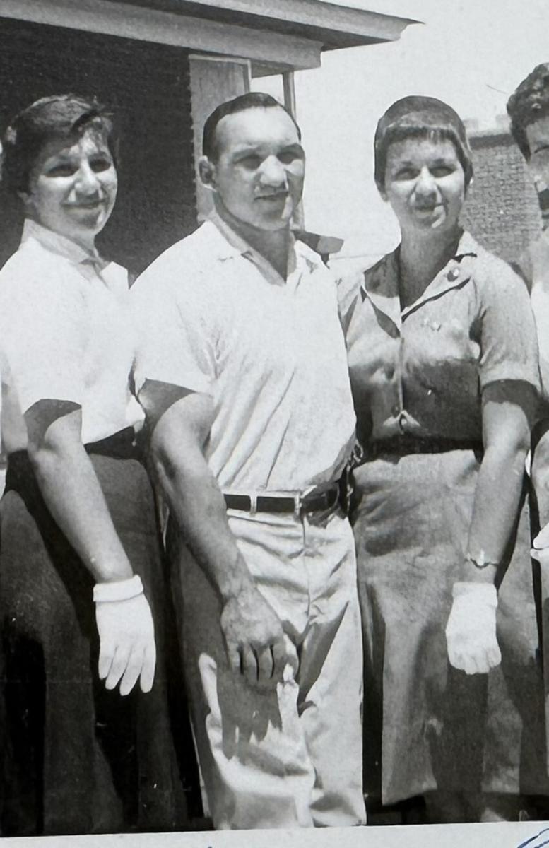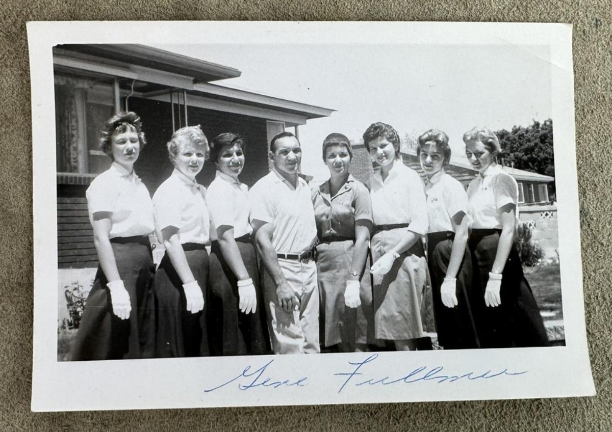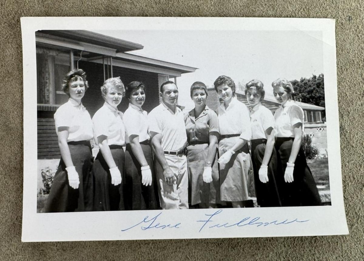 2- Vintage 5 x 3.5" b/w Polaroid hand signed by Gene Fullmer (1931-2015) professional boxer and World Middleweight champion....this photo was taken at the height of his career...Dated 1960..The ladies with him are listed on back...Troop 93 (volunteer group?) of Midvale, Utah...which was Fullmer's home state...This estate find is one of a pair pf photos from this event.