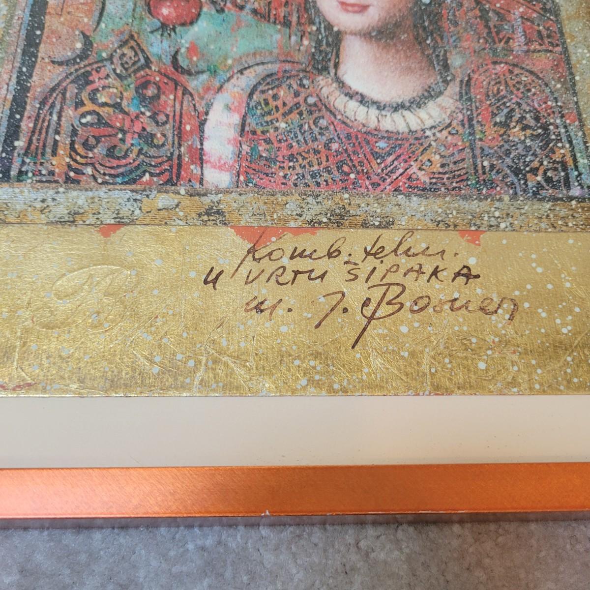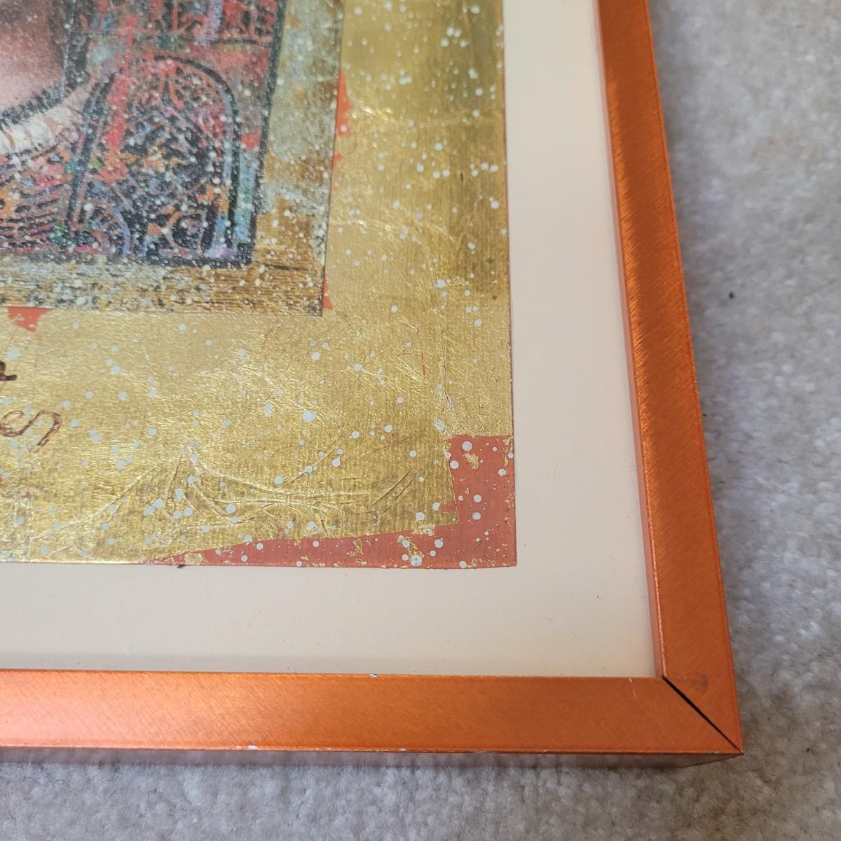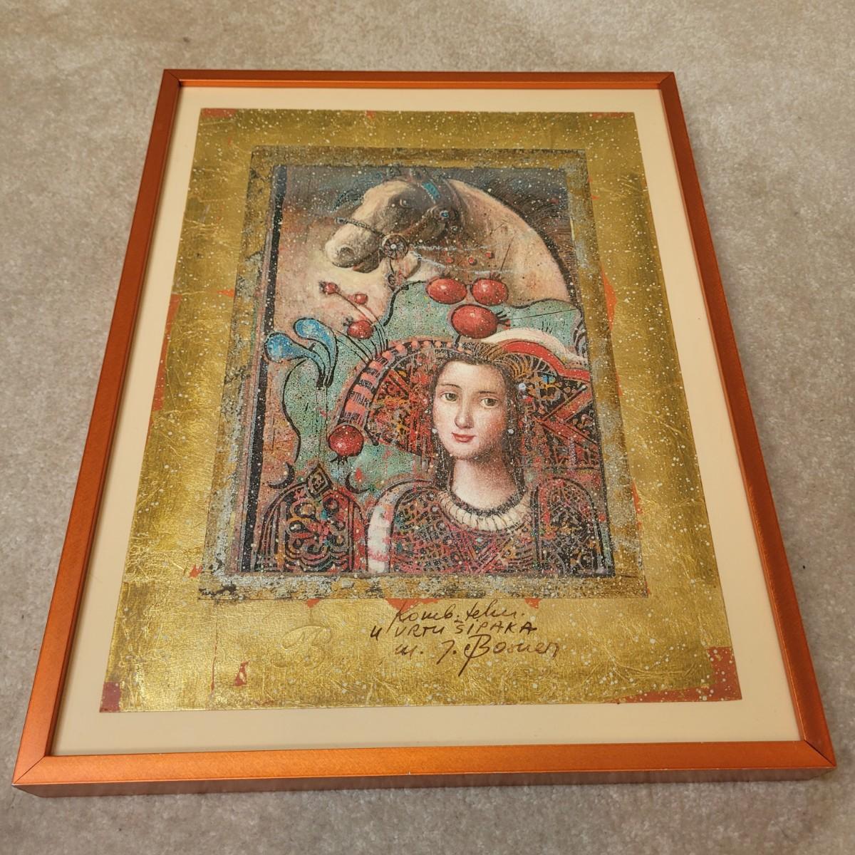 Framed art by the artist Midhat Jelkić Bolsner. It depicts a young woman and a white horse. Art is framed and under glass. It appears that the artist or another entity added layered collage over a print. It appears to be signed and stamped by the artist. The frame measures 17.5" x 13.5"H. Includes mounting hardware.