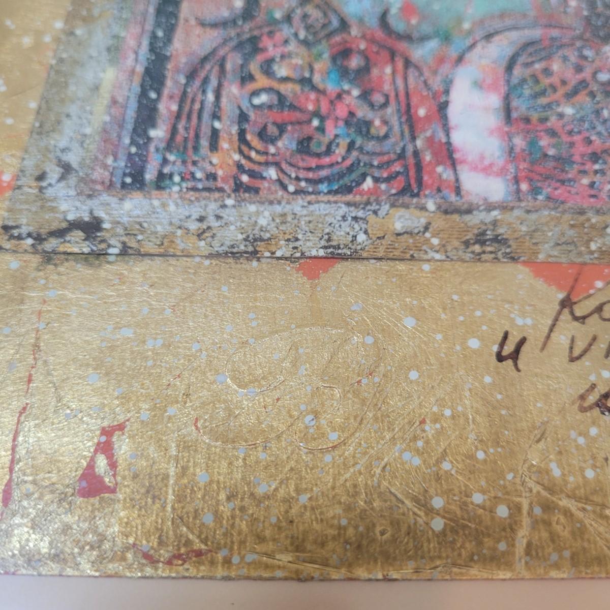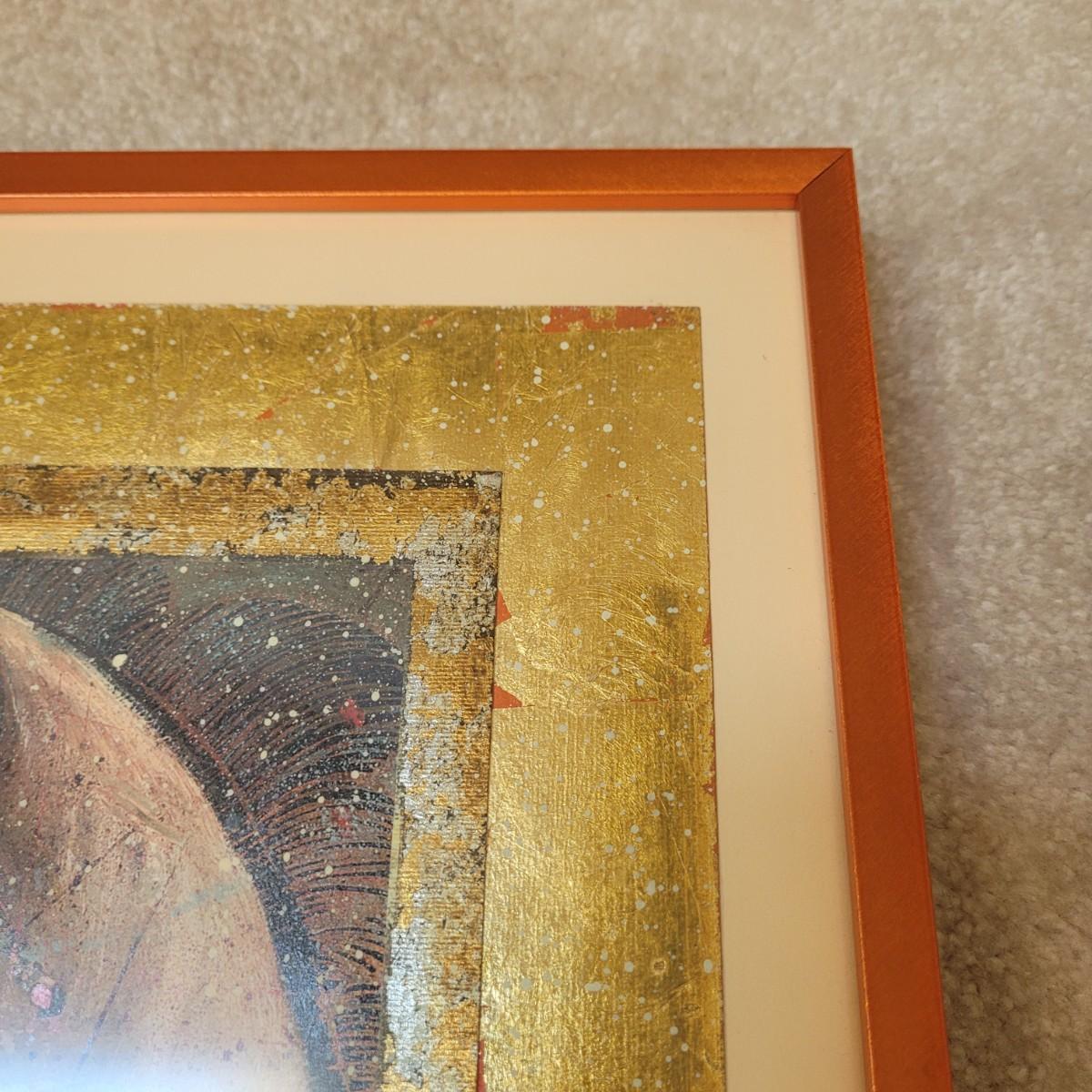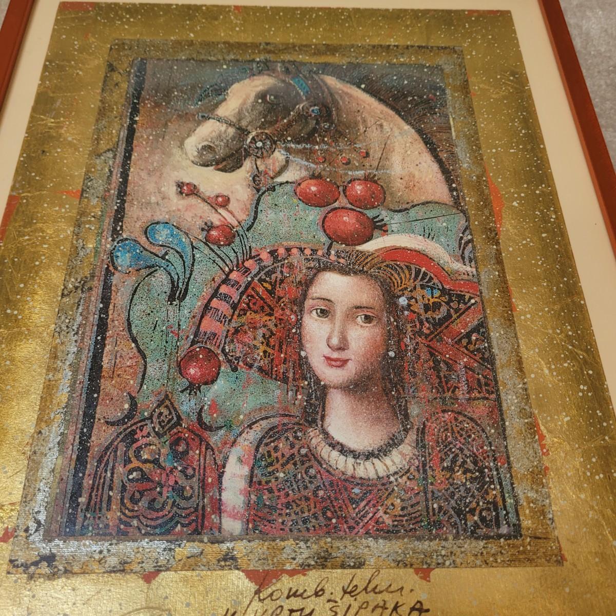 Framed art by the artist Midhat Jelkić Bolsner. It depicts a young woman and a white horse. Art is framed and under glass. It appears that the artist or another entity added layered collage over a print. It appears to be signed and stamped by the artist. The frame measures 17.5" x 13.5"H. Includes mounting hardware.