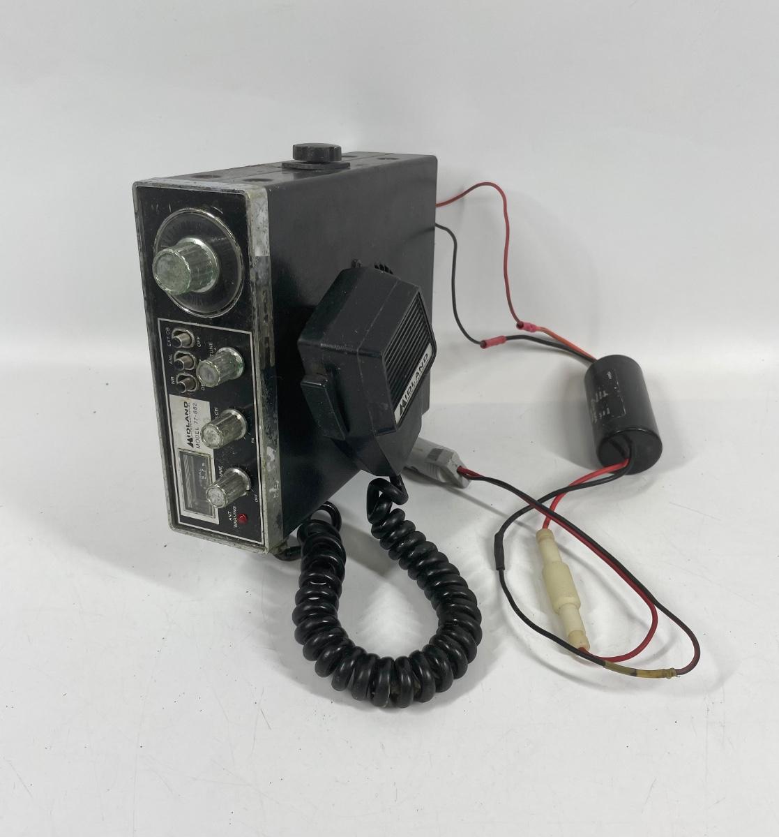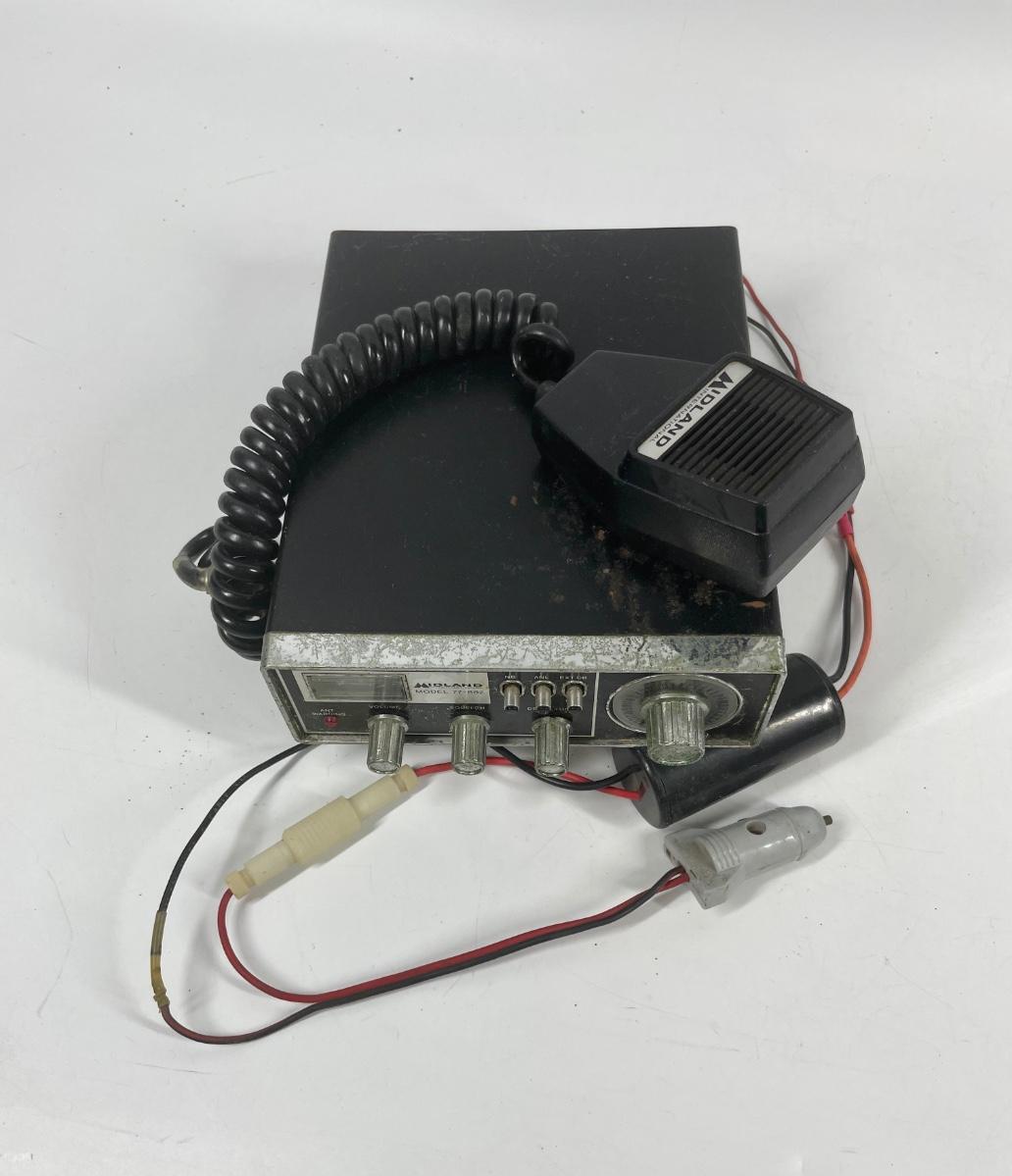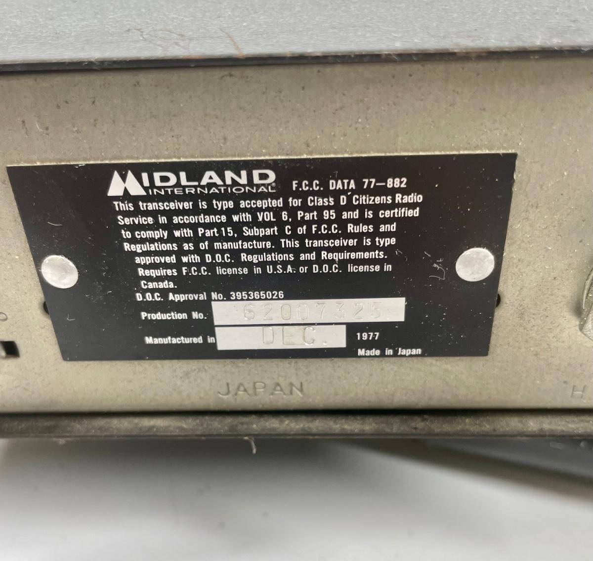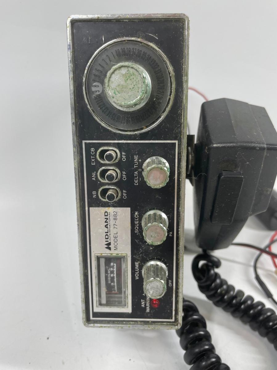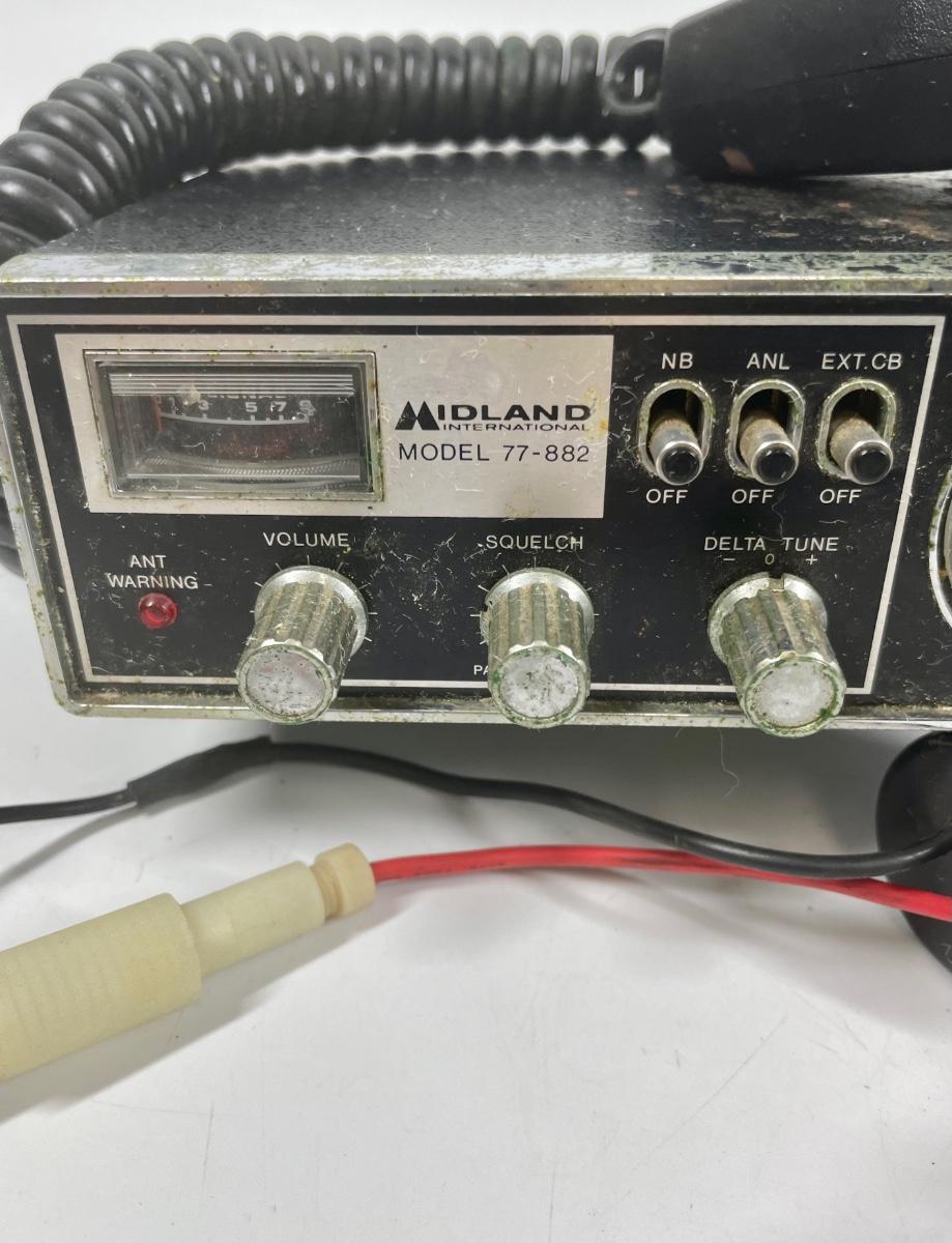 Midland 40 Channel CB Radio for Car. Model 77-882. Includes microphone and cigarette lighter power cord. No antenna. Untested. Made in Japan, 12/77.