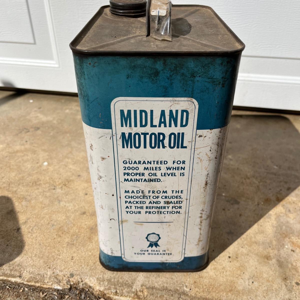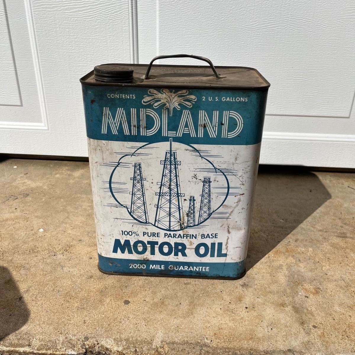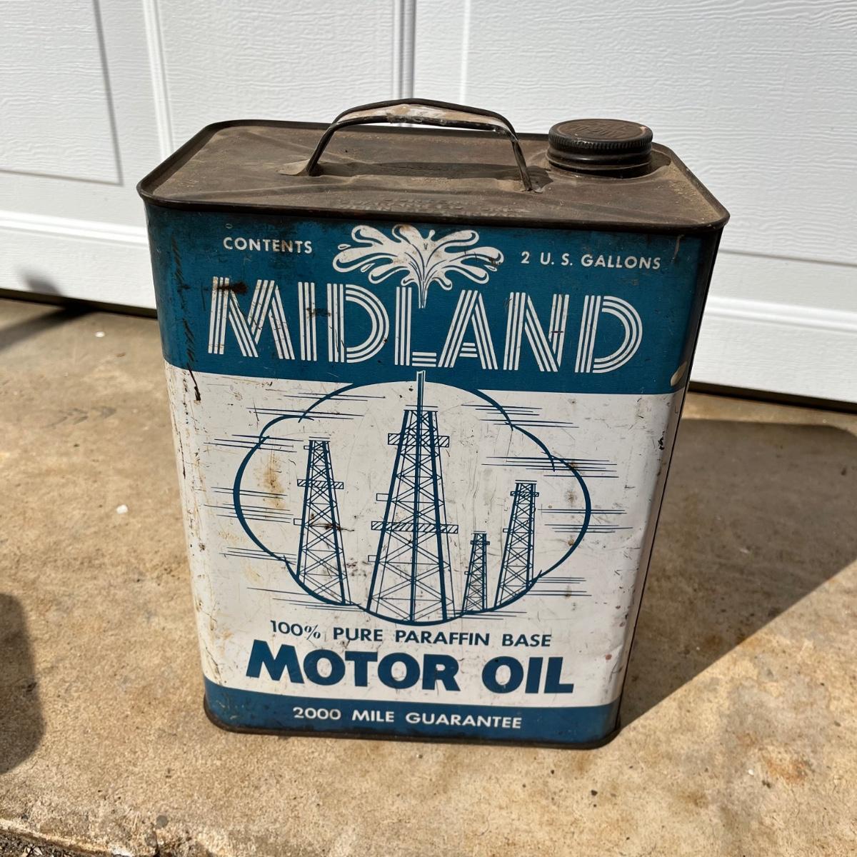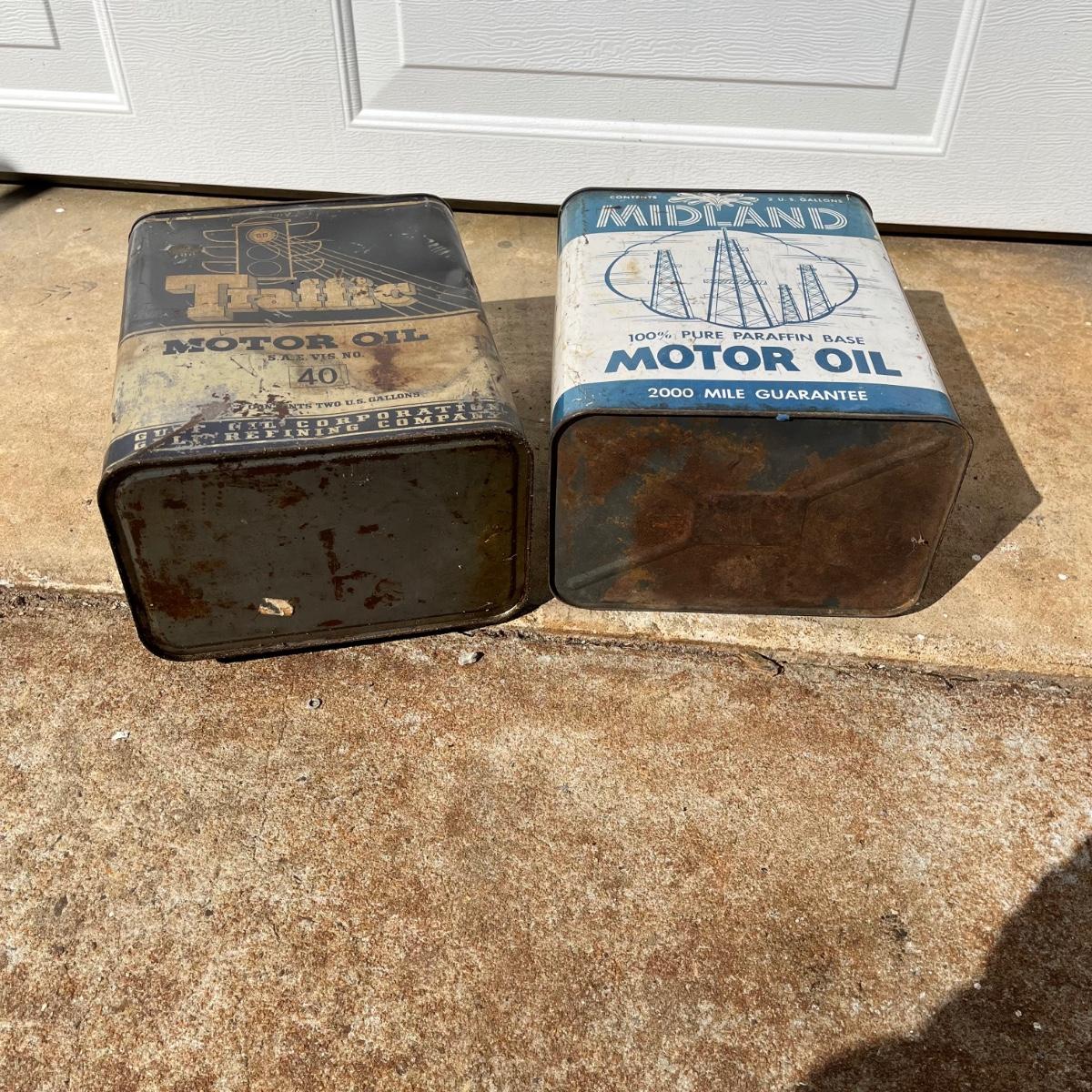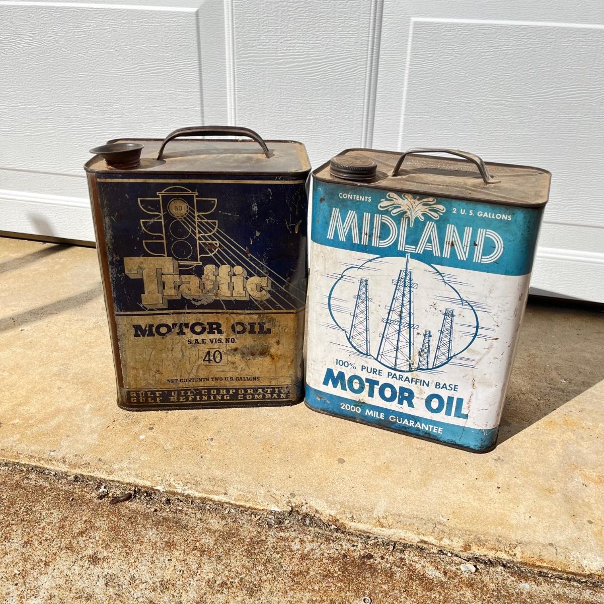Lot includes a Midland two gallon motor oil can and a Traffic two gallon motor oil can that is missing top. Cans have dents and scratches.