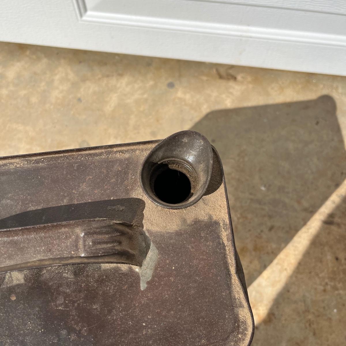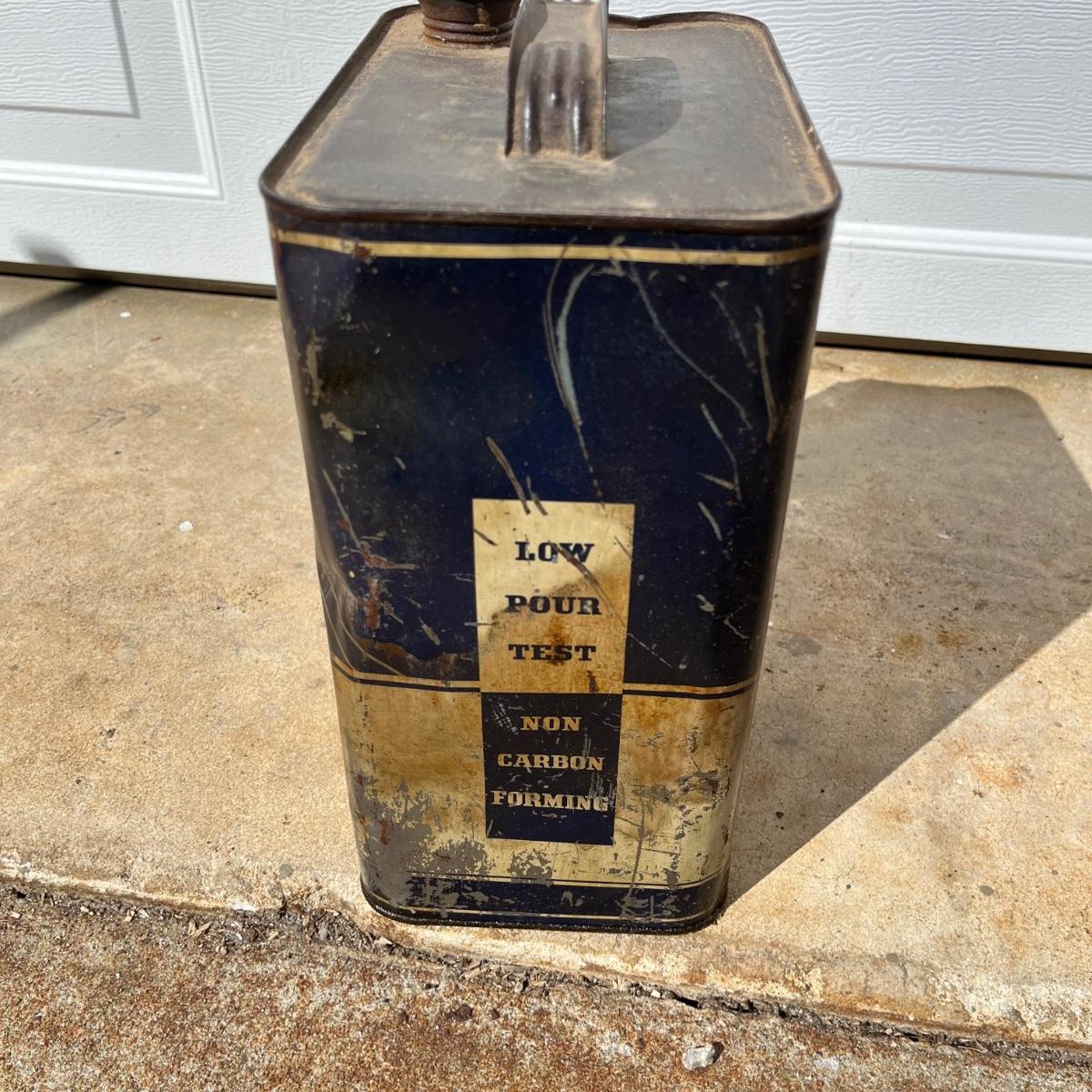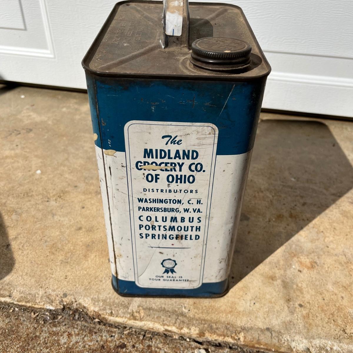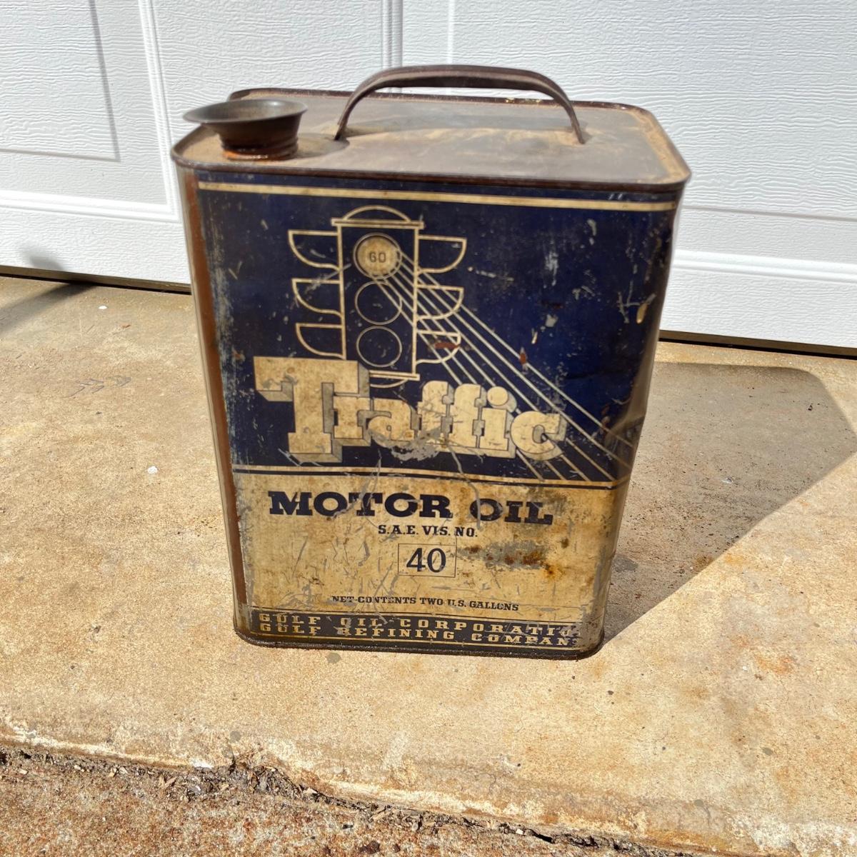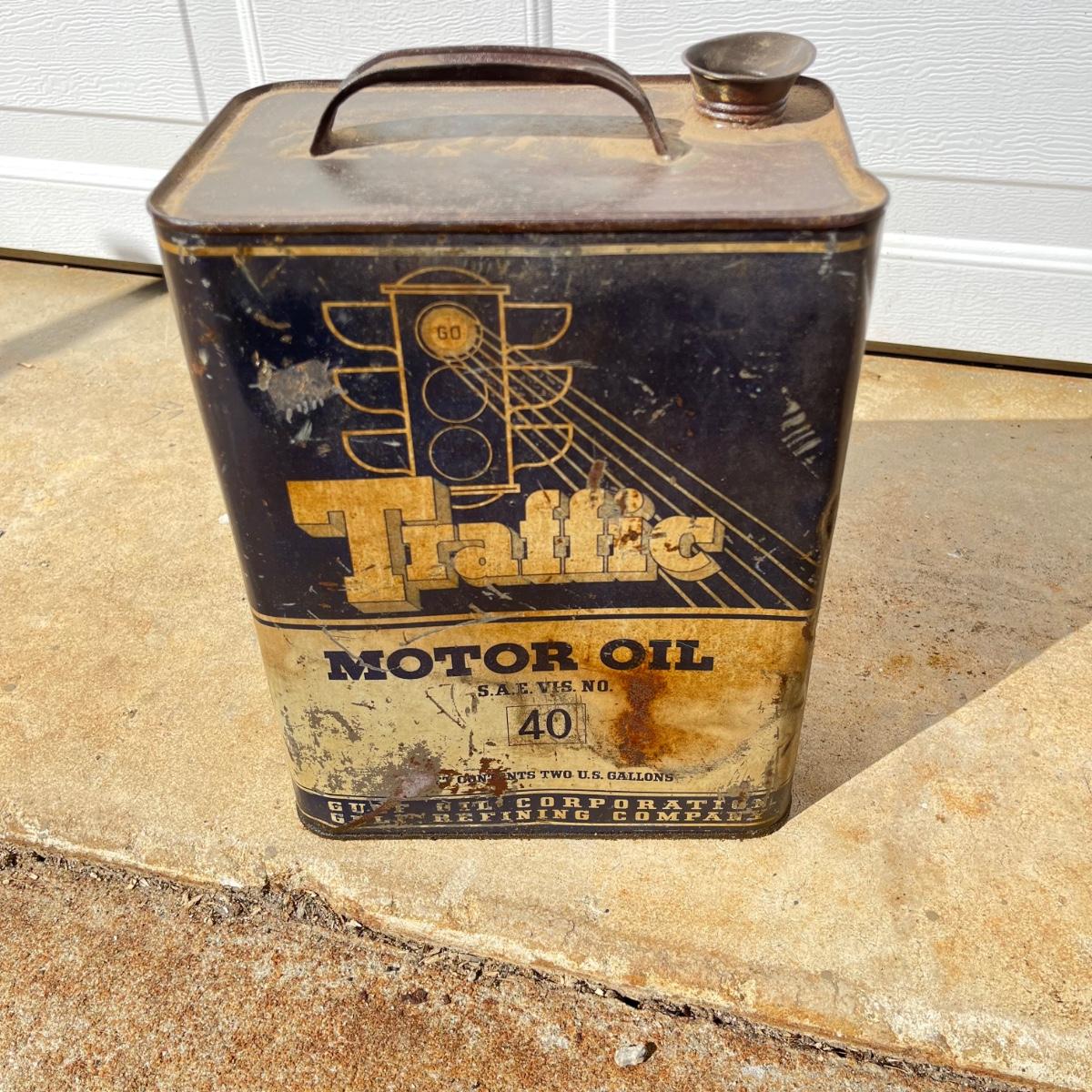 Lot includes a Midland two gallon motor oil can and a Traffic two gallon motor oil can that is missing top. Cans have dents and scratches.