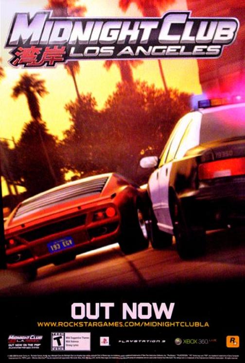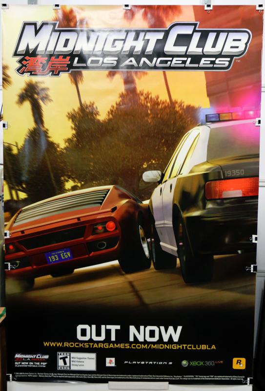 Authentic Advance Release AD Poster for the October 2008 release of the Game MIDNIGHT CLUB : Los Angeles. Printed in Beautiful Brilliant Razor-sharp 6 color production on thick advertising poster stock paper. Mint/New condition - RARE collector's item.