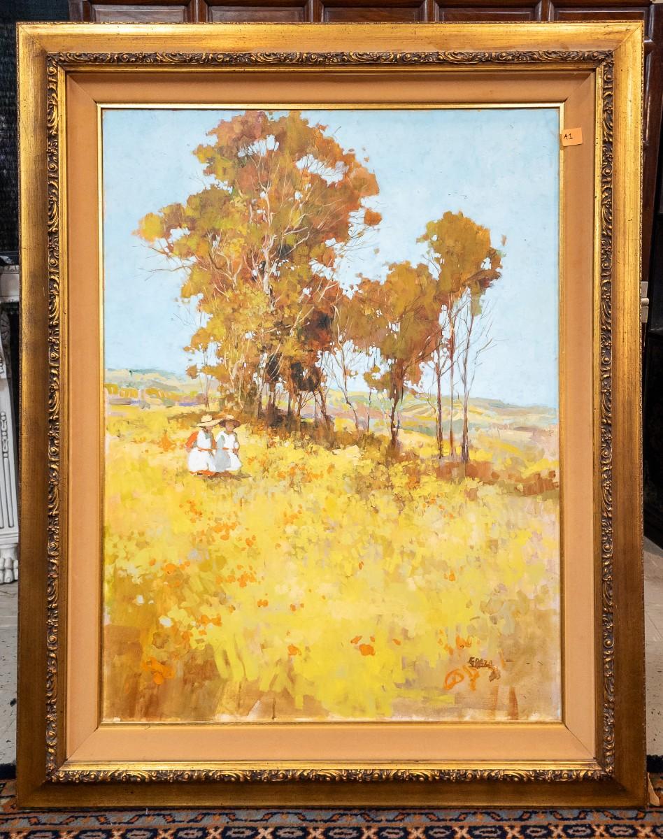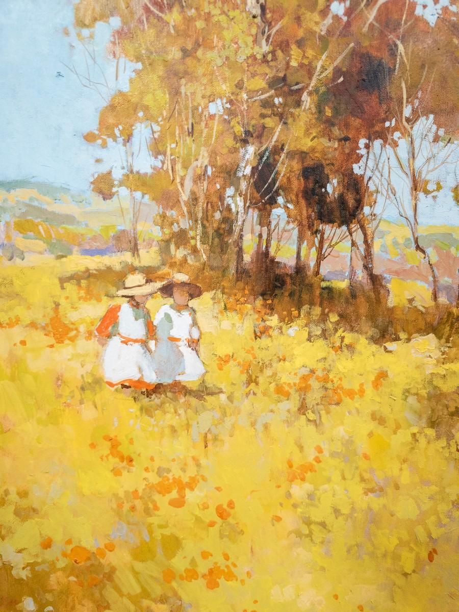 Signed oil on canvas, girls in landscape, 40-1/2"W x 51"H