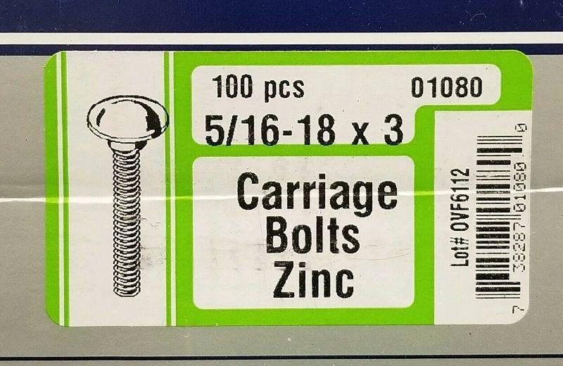 Qty 100 Midwest 01080 5/16-18 x 3 Zinc Carriage Bolts