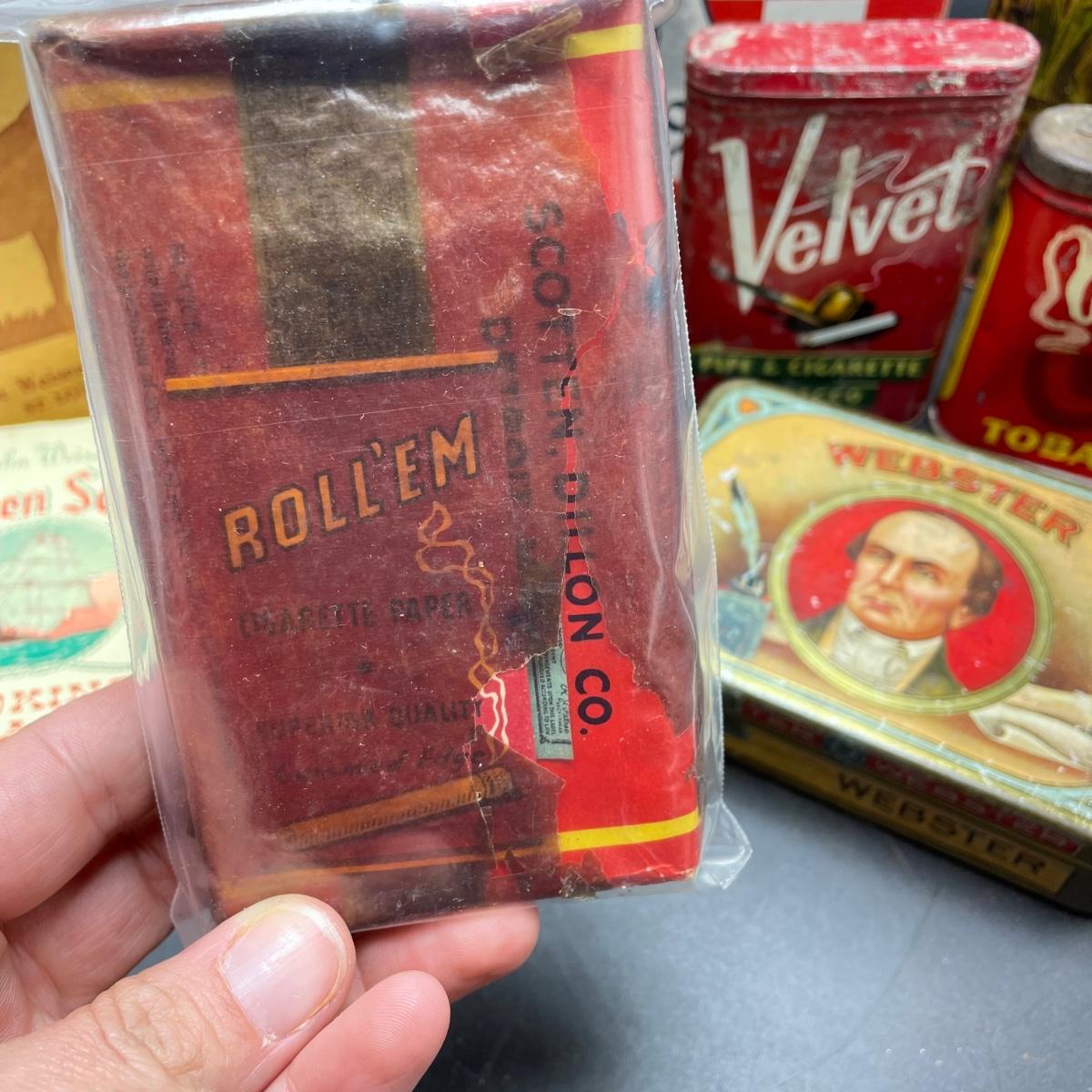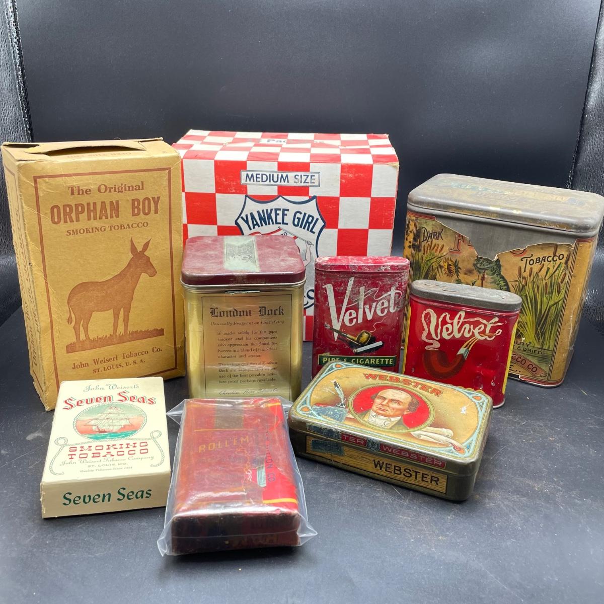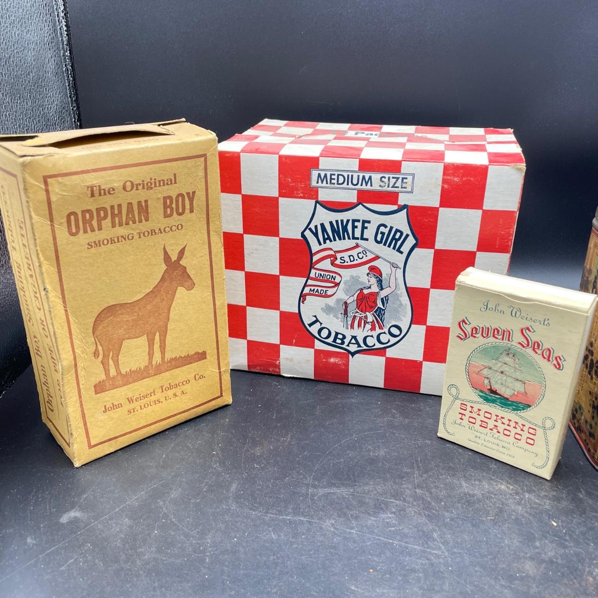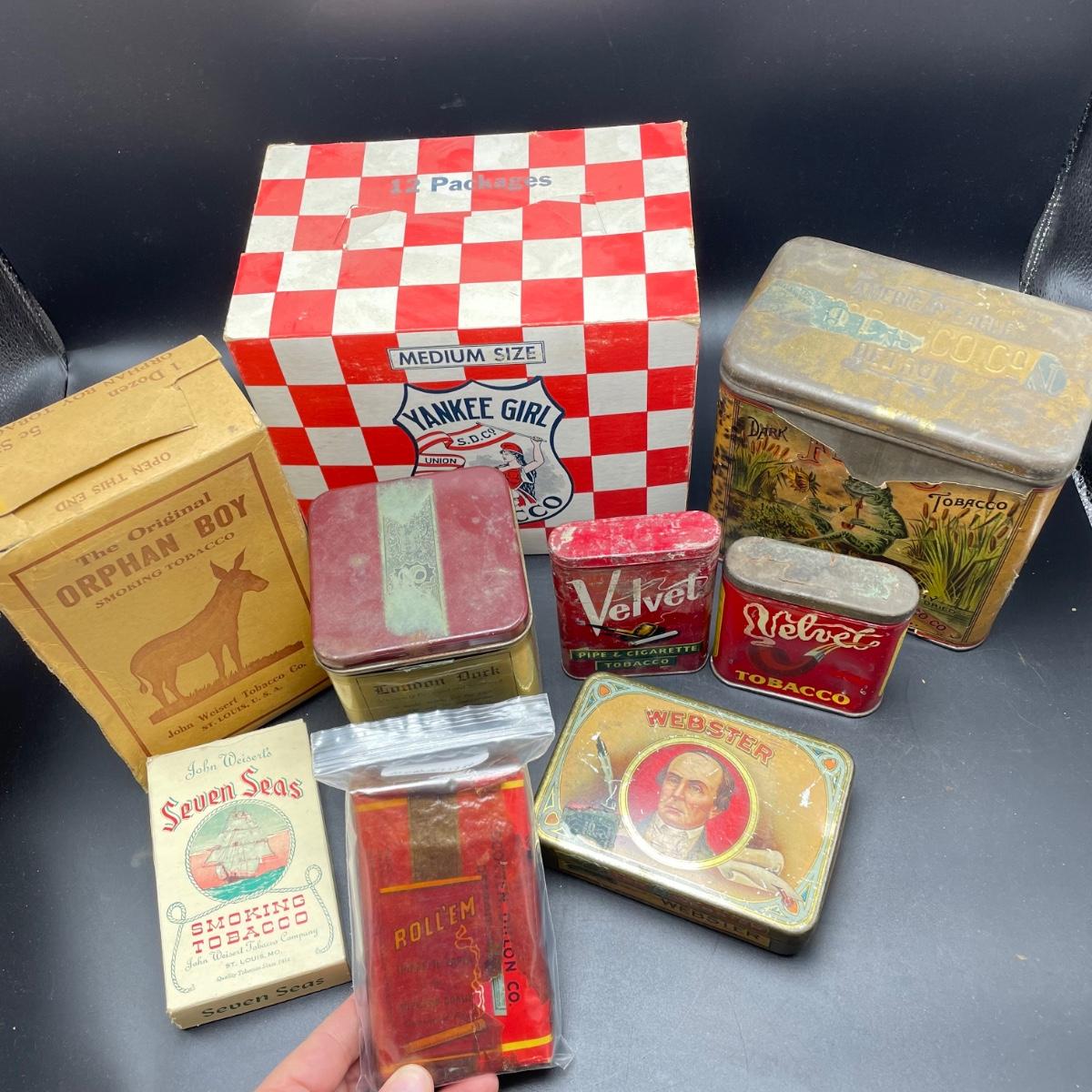 Vintage tobacco ads from Michigan, Illinois, and Missouri. Michigan tins include a large 6” x 4” x 6” hinged Frog Tobacco, Webster hinged tins, what appears to be a full paper pack of Ramrod cigarette tobacco with papers and finally a paper Yankee Girl carton. The two Velvet pocket tins have traveled from Illinois. Lastly, the paper Seven Seas and Orphan Boy paper boxes with a London Dock tin from Missouri. See images. The Yankee Girl box measures approximately 8” x 5.25” x 7”. See images. Shipping Available.