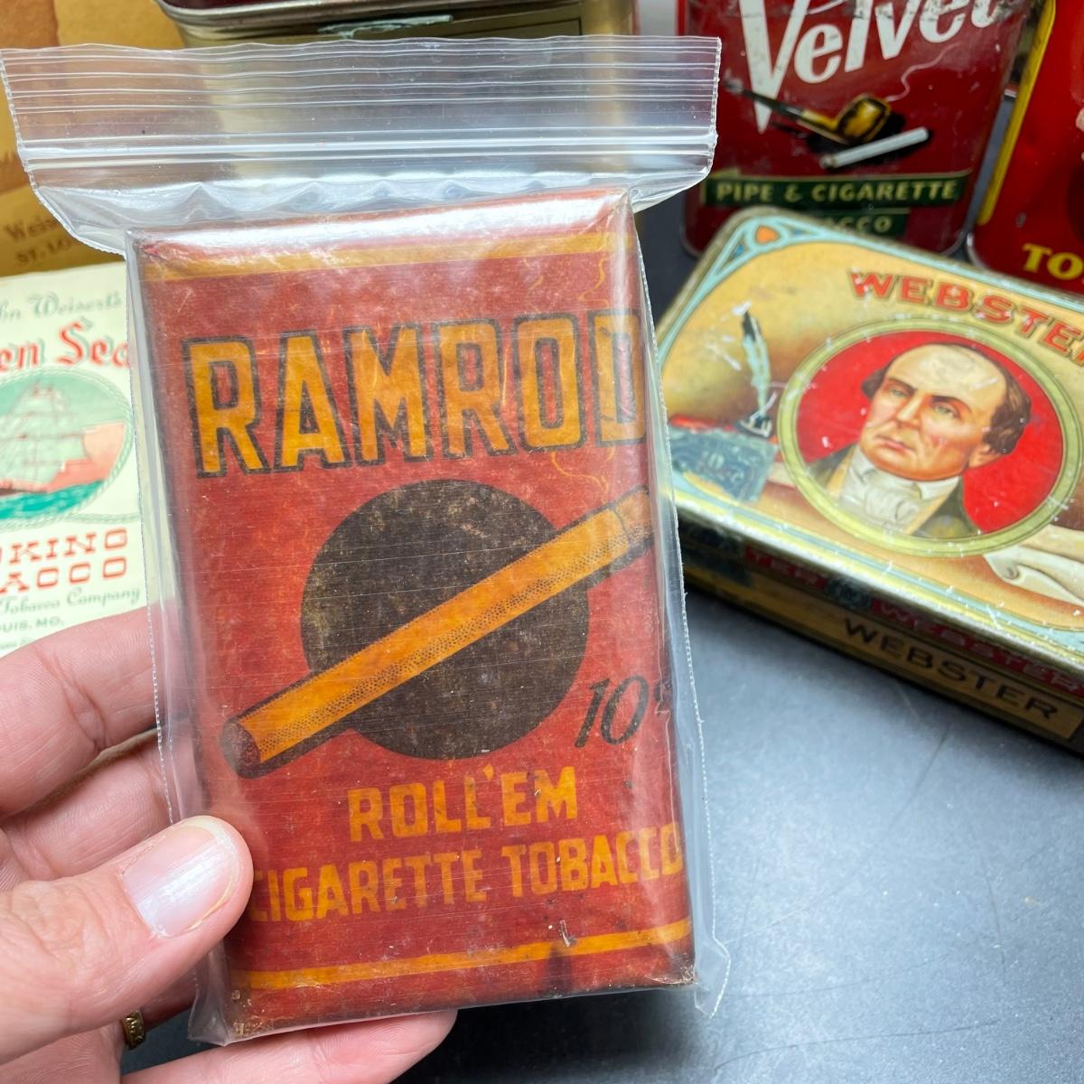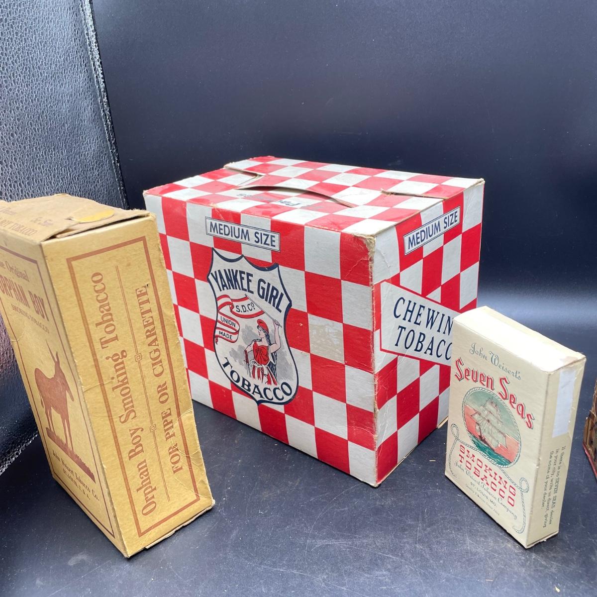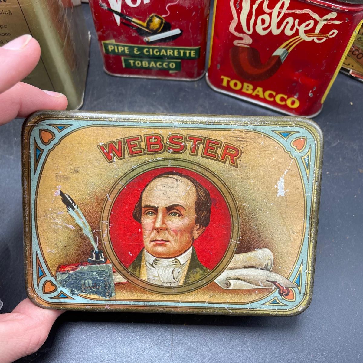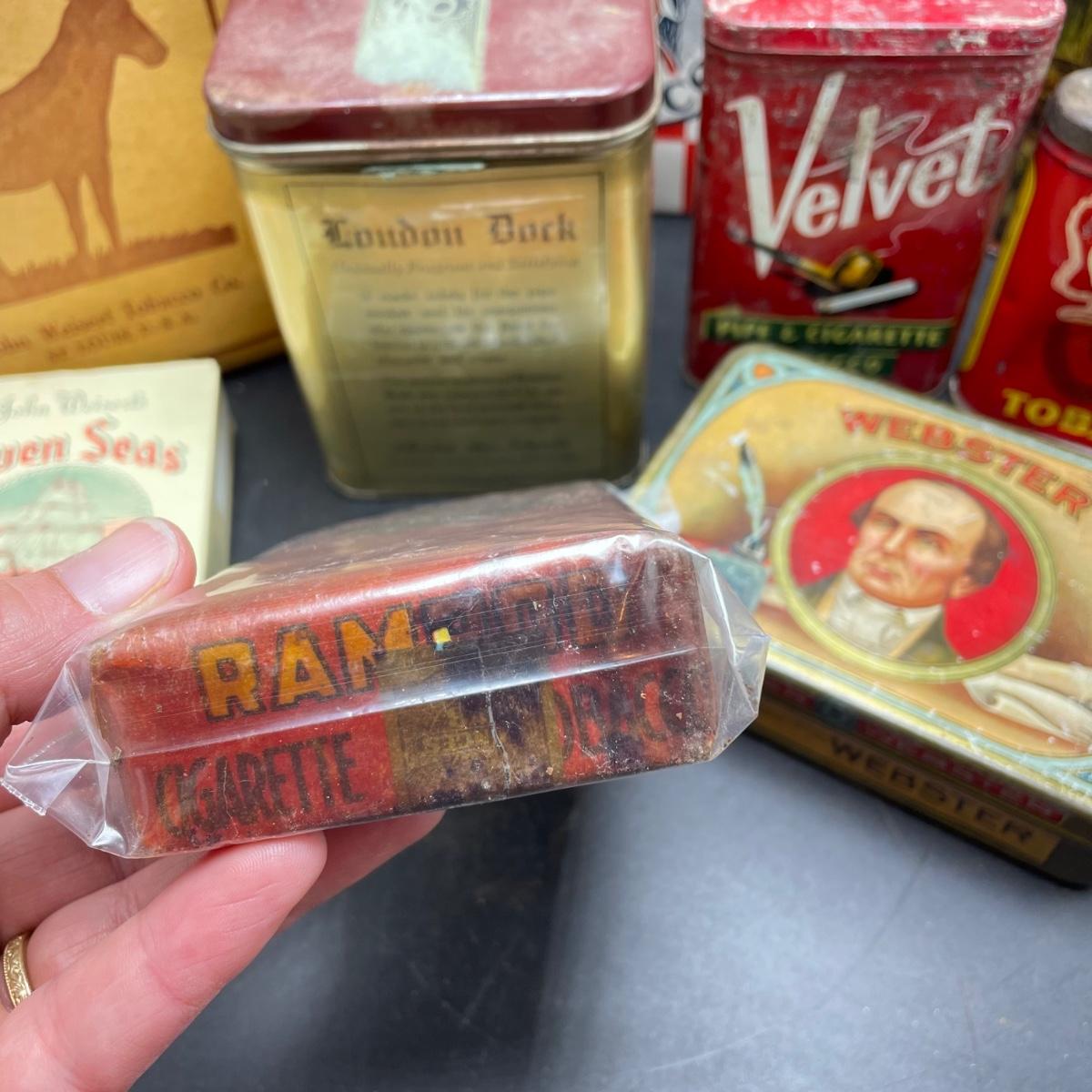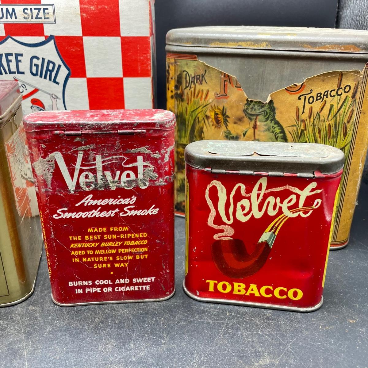 Vintage tobacco ads from Michigan, Illinois, and Missouri. Michigan tins include a large 6” x 4” x 6” hinged Frog Tobacco, Webster hinged tins, what appears to be a full paper pack of Ramrod cigarette tobacco with papers and finally a paper Yankee Girl carton. The two Velvet pocket tins have traveled from Illinois. Lastly, the paper Seven Seas and Orphan Boy paper boxes with a London Dock tin from Missouri. See images. The Yankee Girl box measures approximately 8” x 5.25” x 7”. See images. Shipping Available.