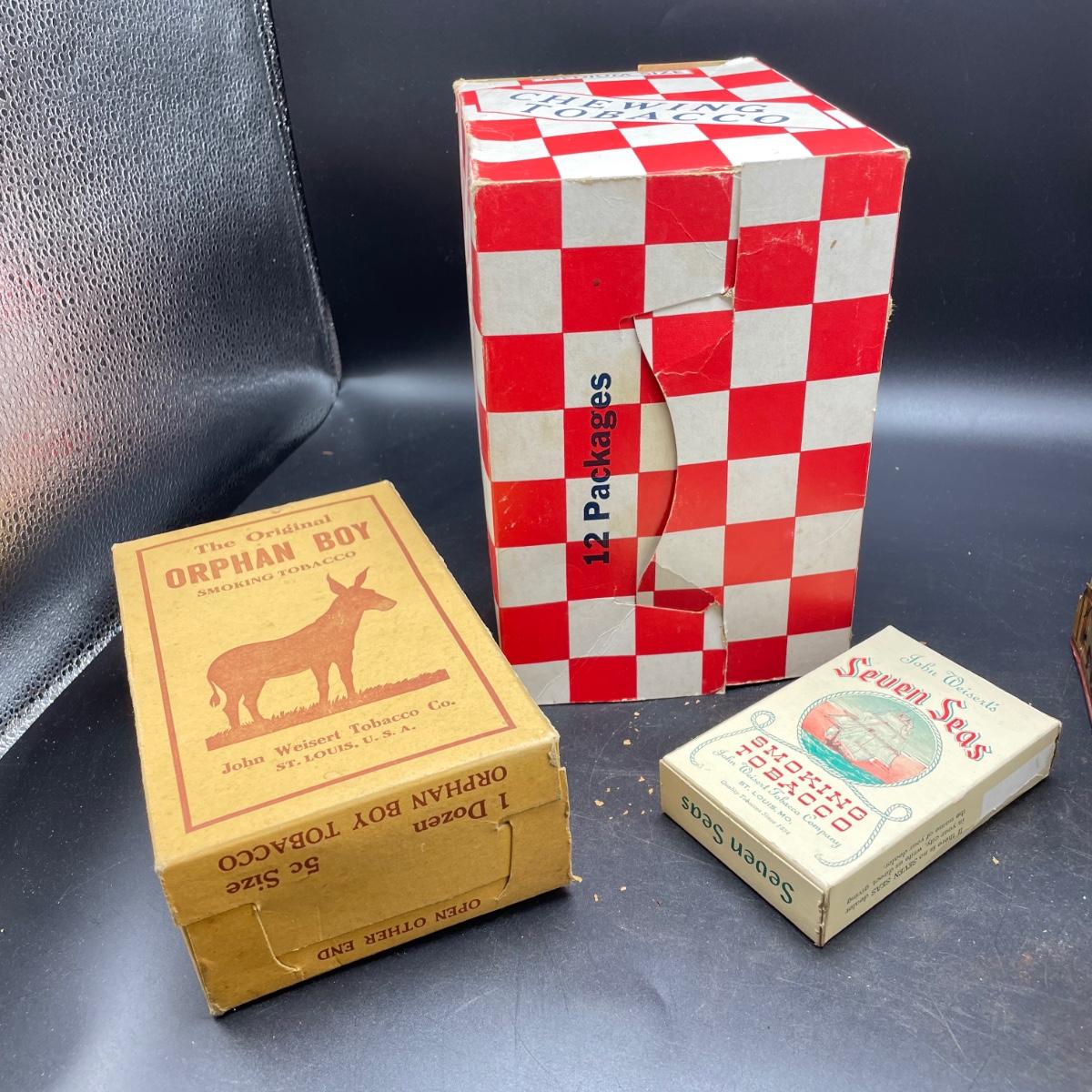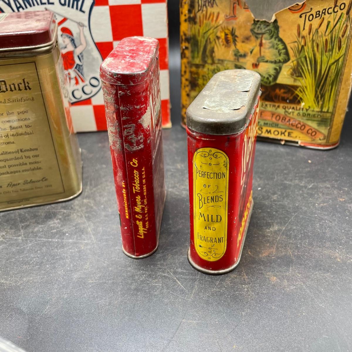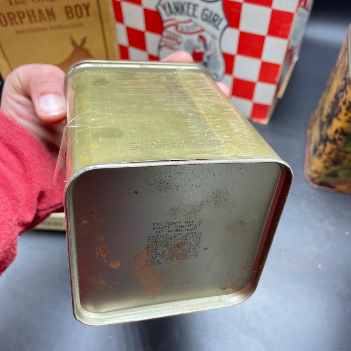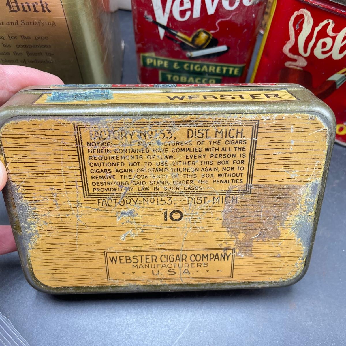 Vintage tobacco ads from Michigan, Illinois, and Missouri. Michigan tins include a large 6” x 4” x 6” hinged Frog Tobacco, Webster hinged tins, what appears to be a full paper pack of Ramrod cigarette tobacco with papers and finally a paper Yankee Girl carton. The two Velvet pocket tins have traveled from Illinois. Lastly, the paper Seven Seas and Orphan Boy paper boxes with a London Dock tin from Missouri. See images. The Yankee Girl box measures approximately 8” x 5.25” x 7”. See images. Shipping Available.