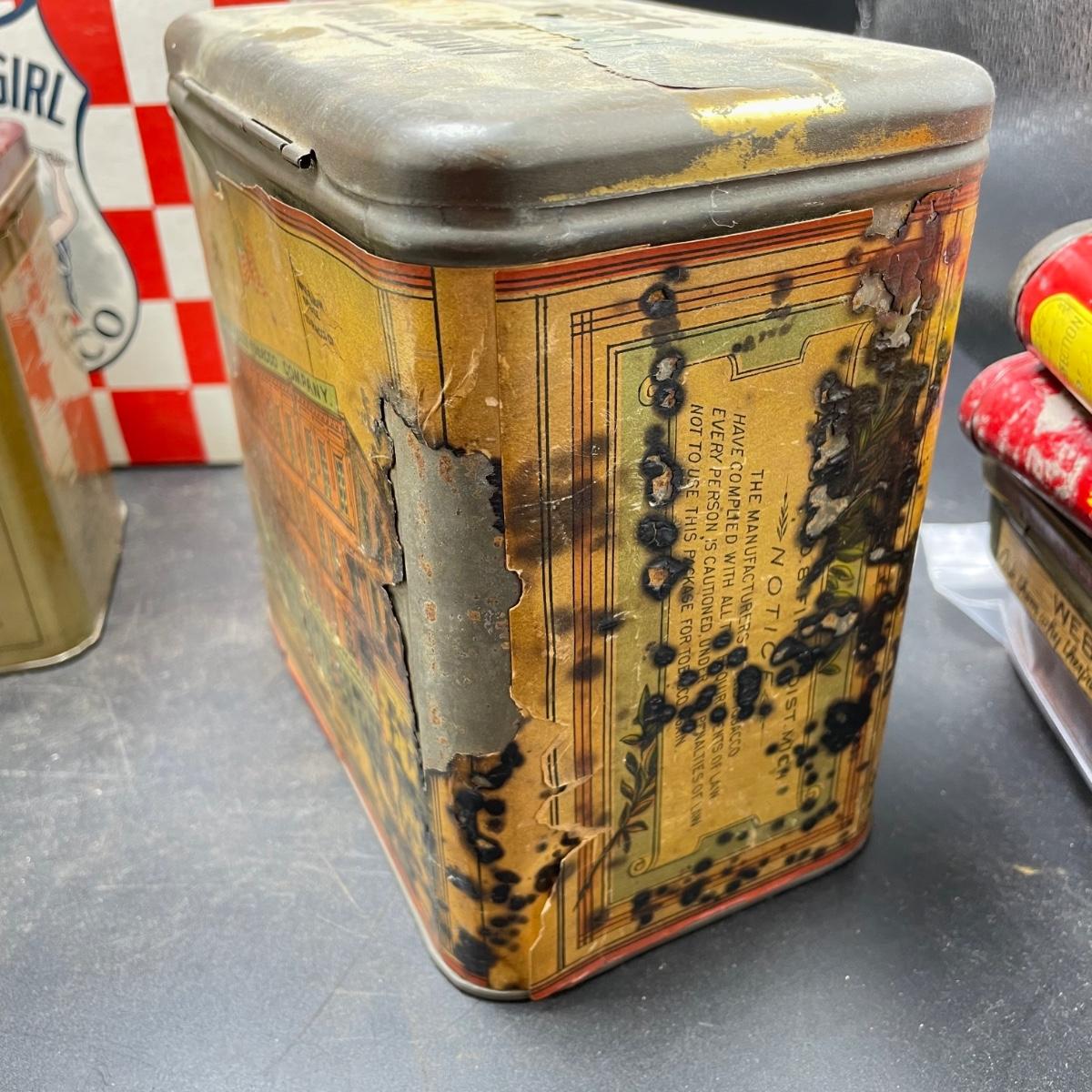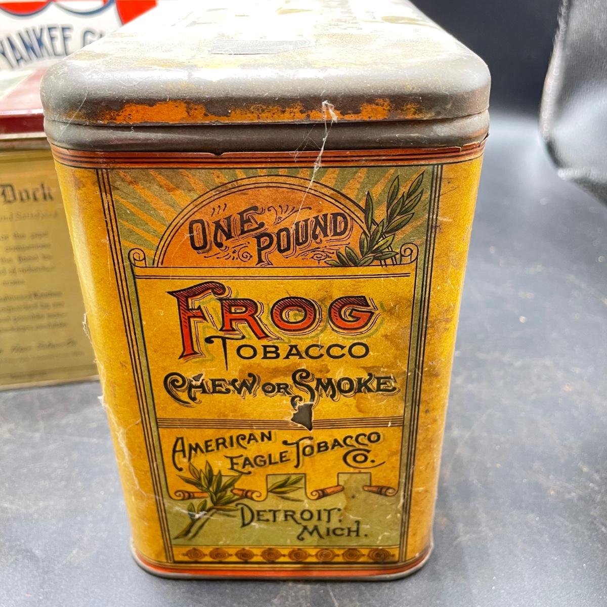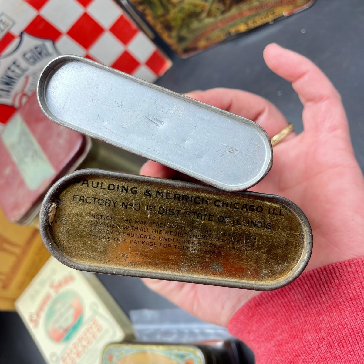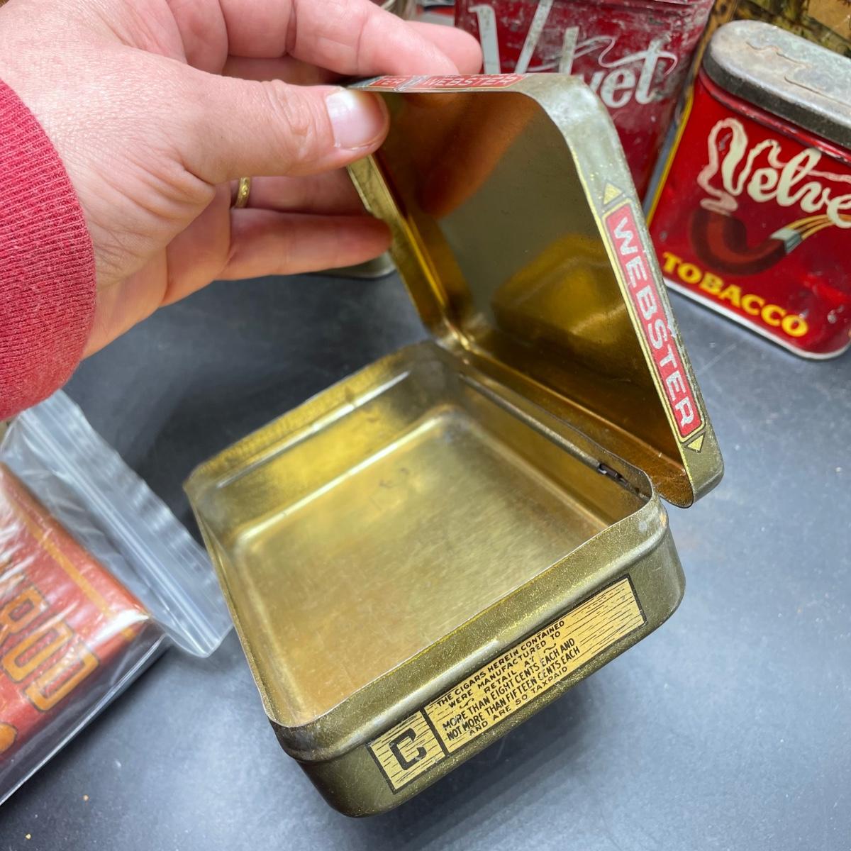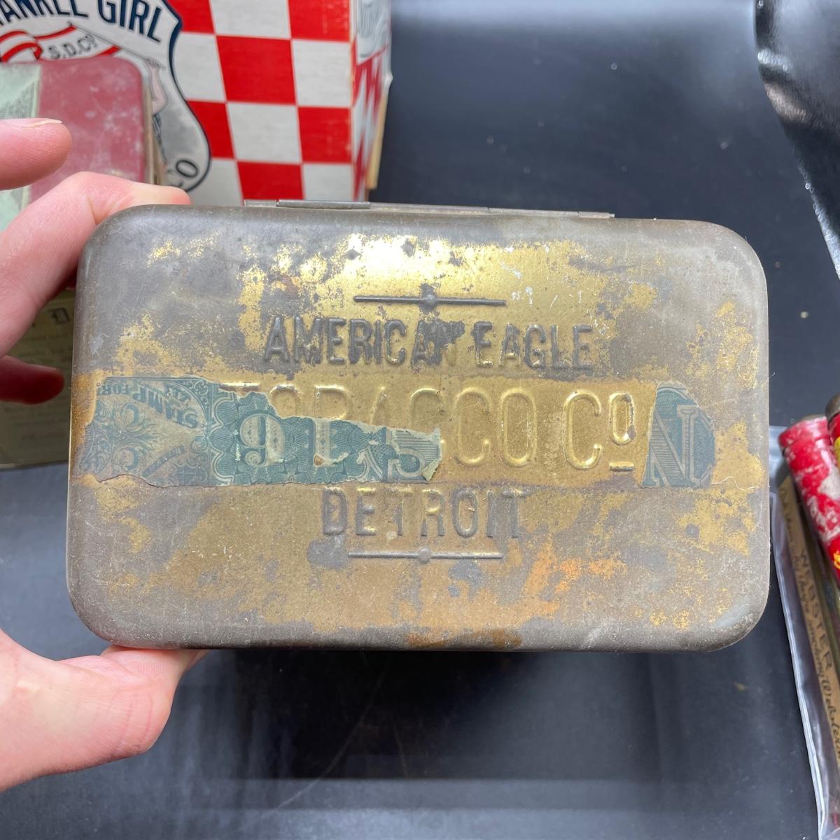 Vintage tobacco ads from Michigan, Illinois, and Missouri. Michigan tins include a large 6” x 4” x 6” hinged Frog Tobacco, Webster hinged tins, what appears to be a full paper pack of Ramrod cigarette tobacco with papers and finally a paper Yankee Girl carton. The two Velvet pocket tins have traveled from Illinois. Lastly, the paper Seven Seas and Orphan Boy paper boxes with a London Dock tin from Missouri. See images. The Yankee Girl box measures approximately 8” x 5.25” x 7”. See images. Shipping Available.