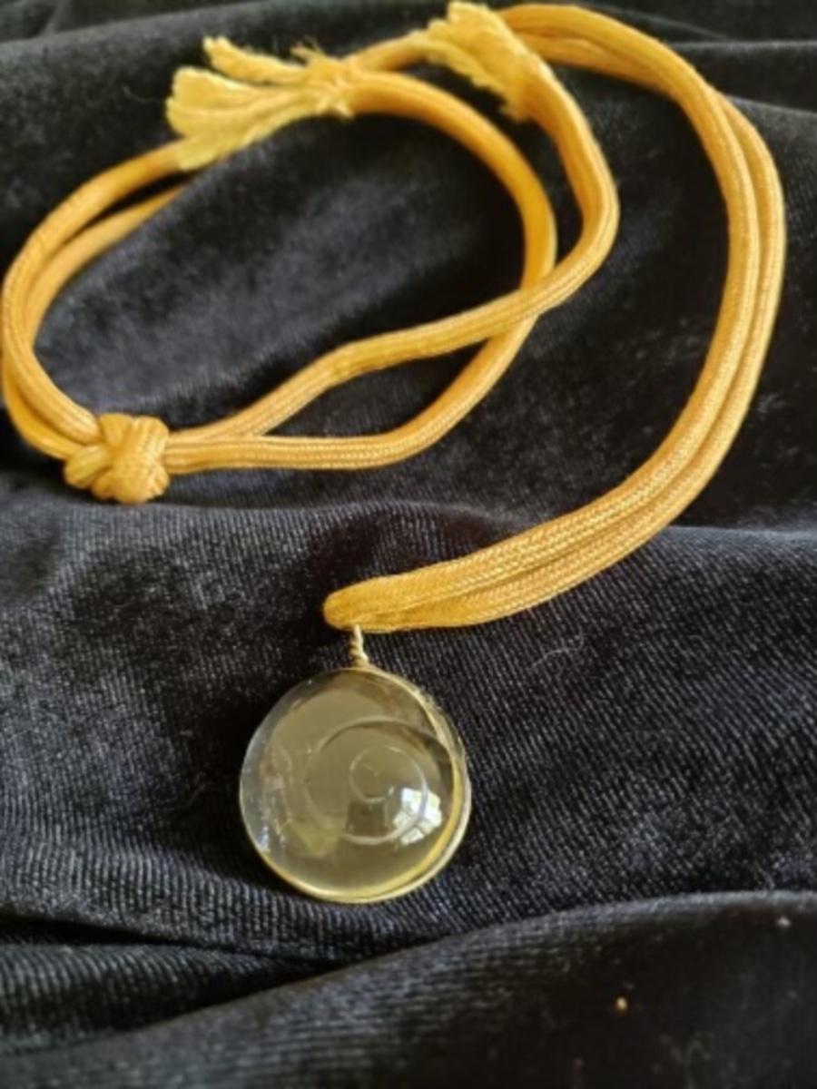Mignon Faget Crystal Moonsnail Pendant. Gold cord. Some damage on Pendant. 1.25" H x 1" W.  Includes blue MF bag.