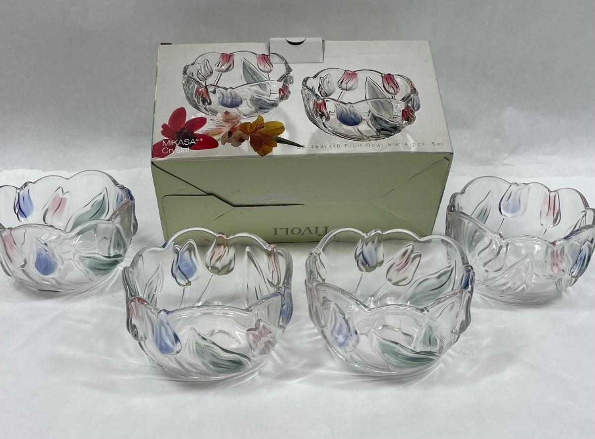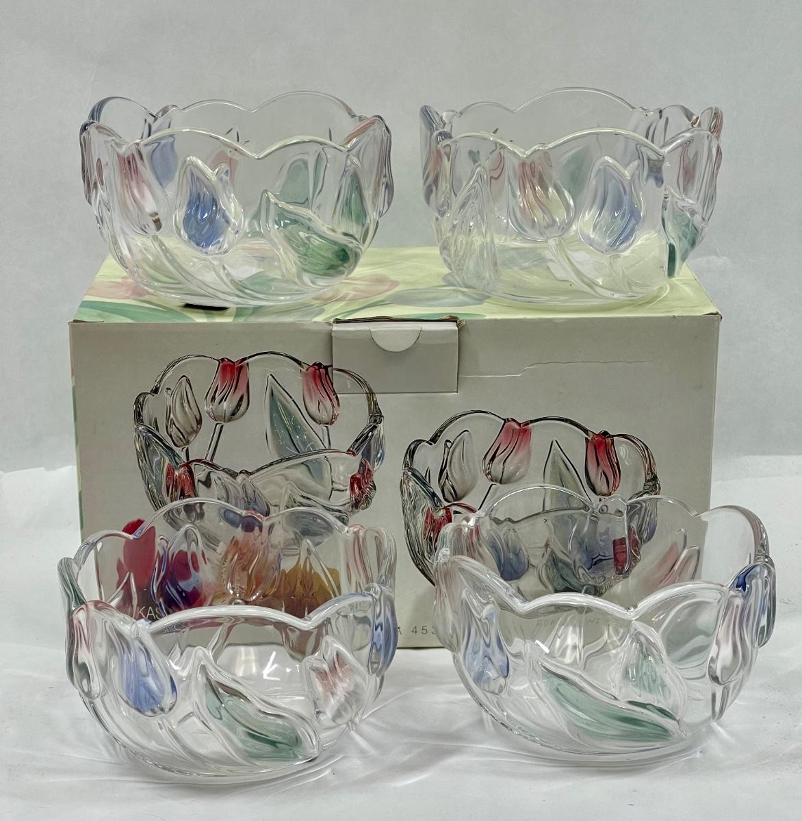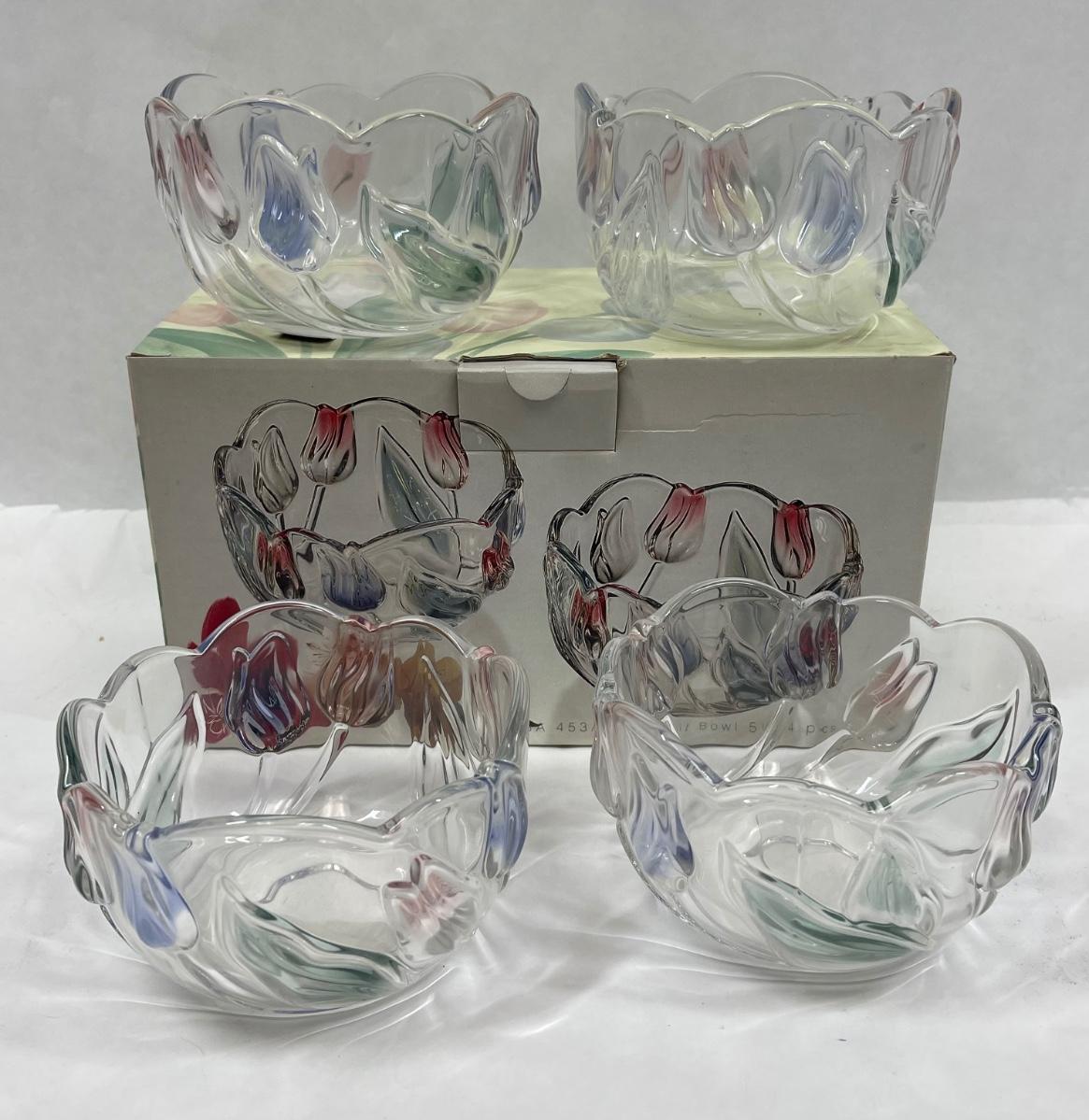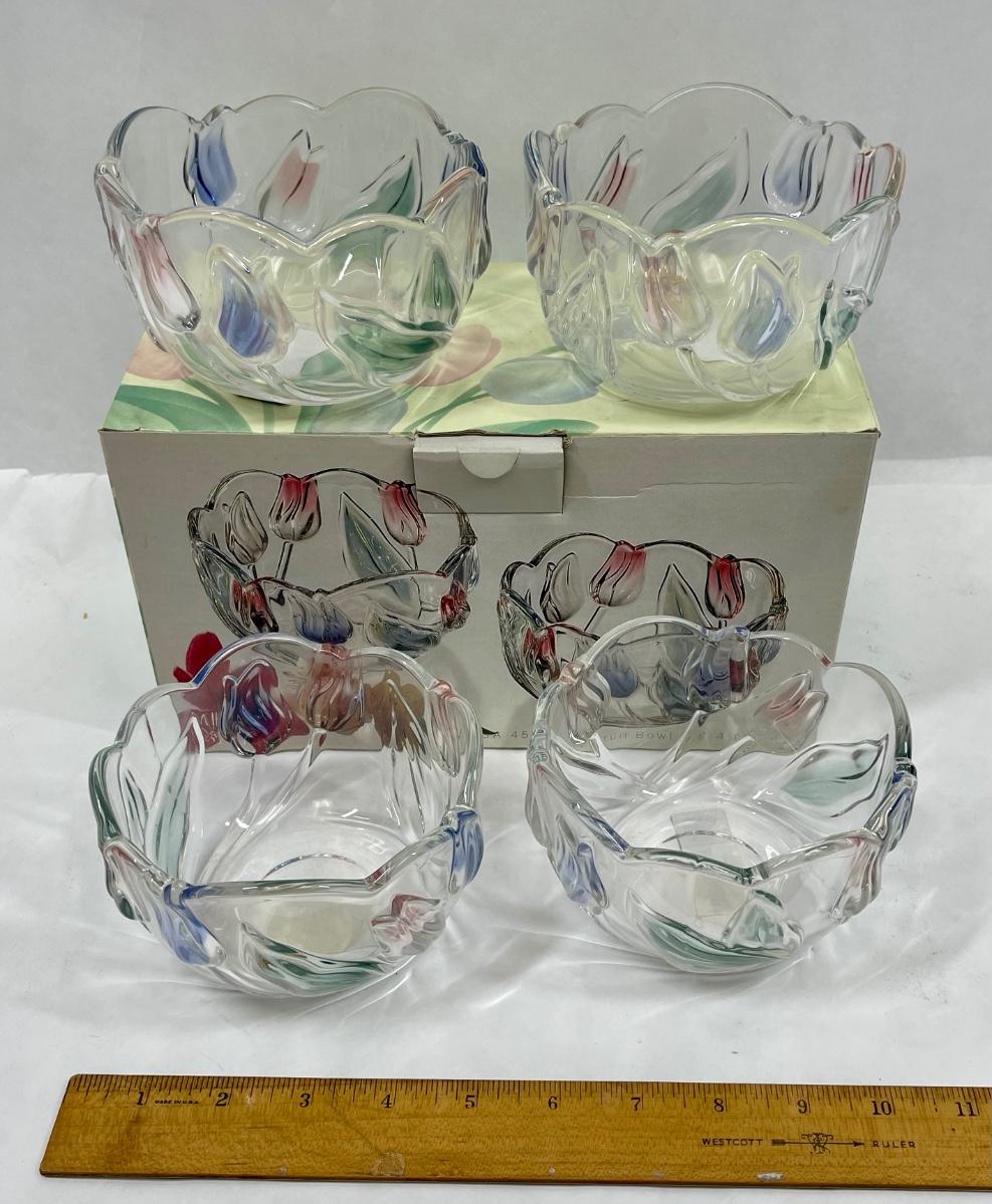 MIKASA glass bowl set with blue & pink tulips - 4 bowls new in box