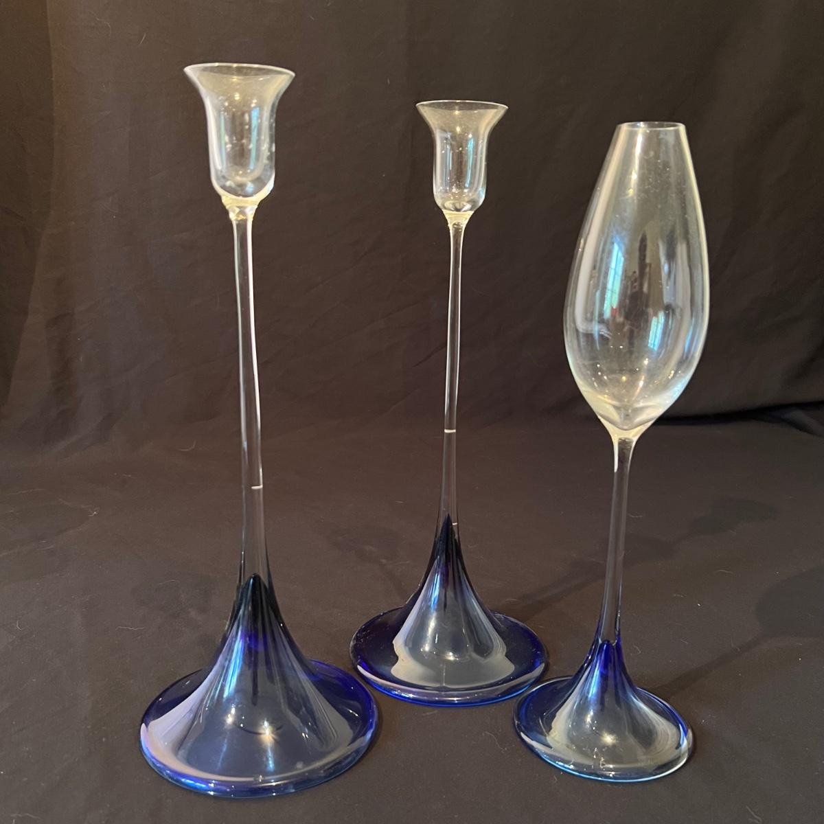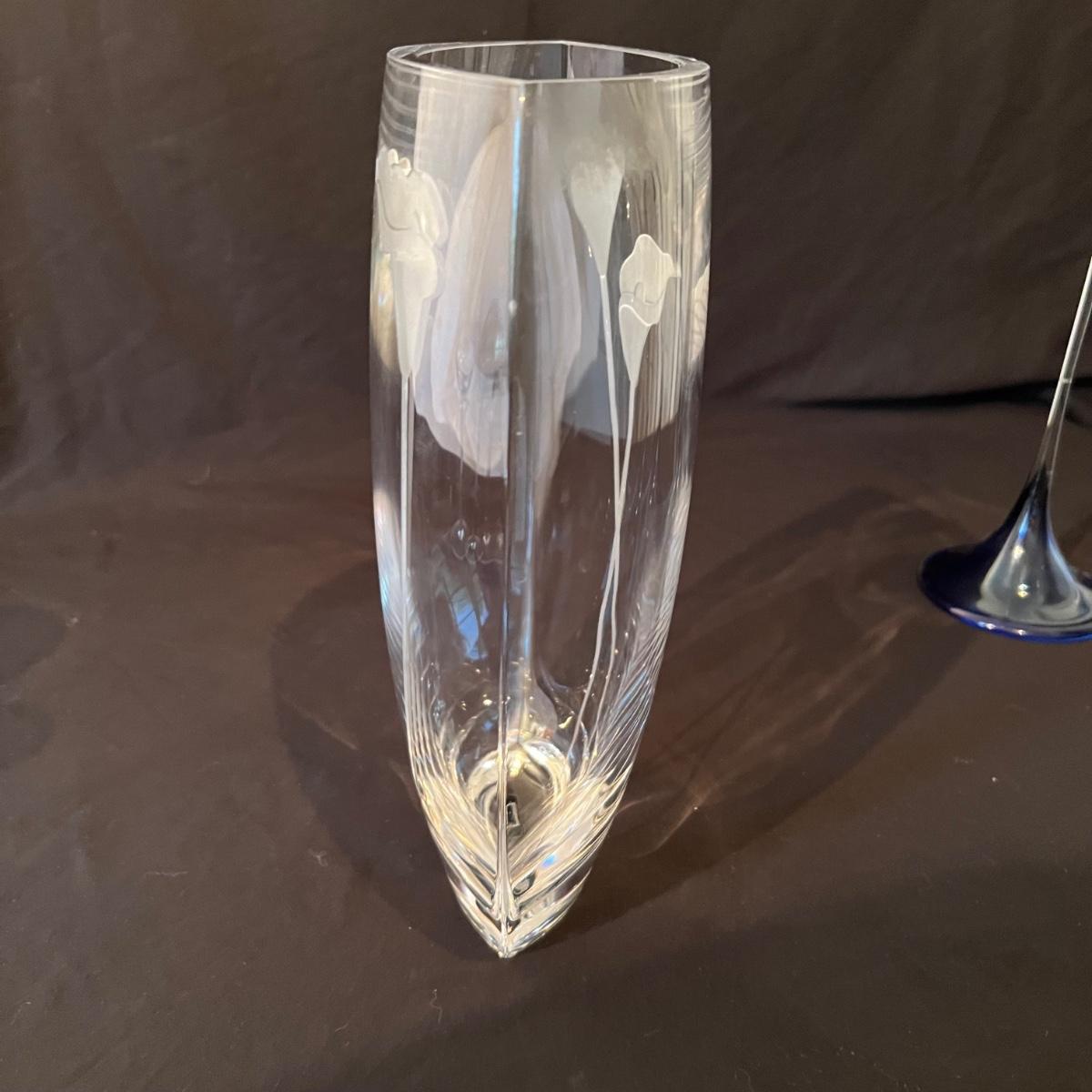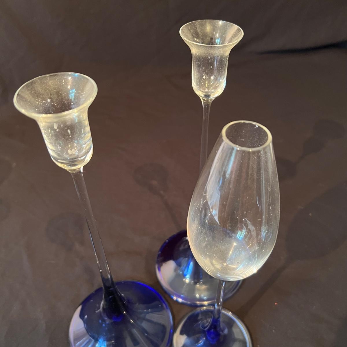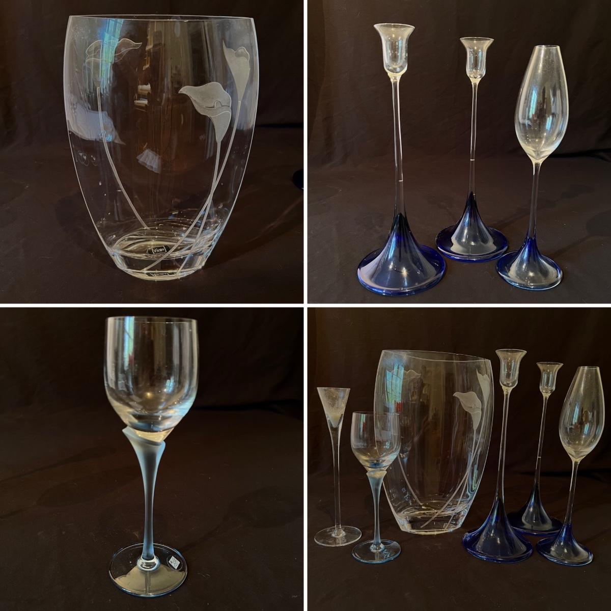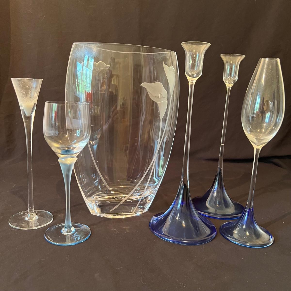 An assortment of glass items with frosted and/or colored glass the Mikasa vase features frosted Calla Lily flowers and measures approximately 8” x 3” x 13”H. The two tallest candle holders match the fluted glass, they all have cobalt blue bases. The glass with pale blue frosted stem has a sticker and the clear glass candle holder has a signature, see images.