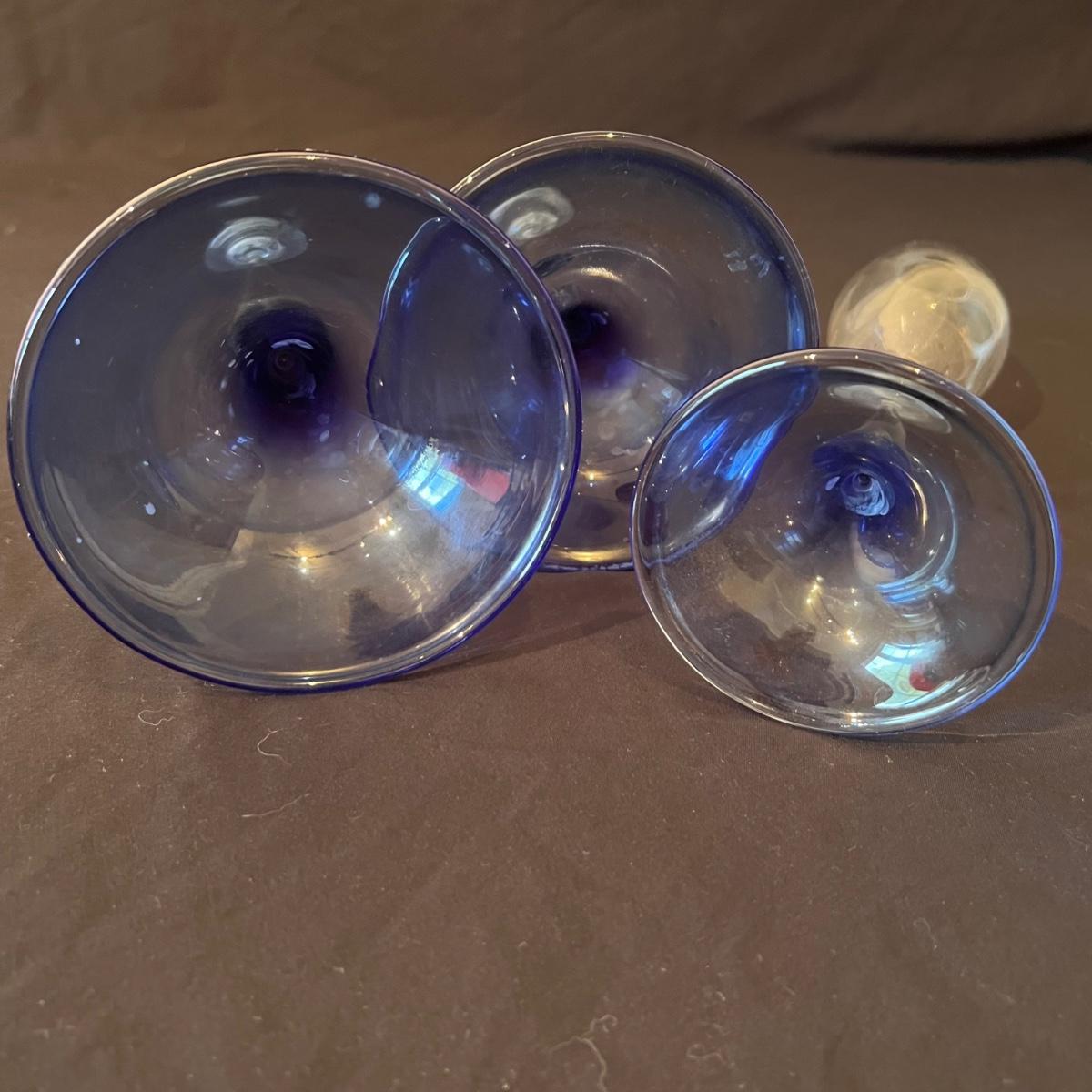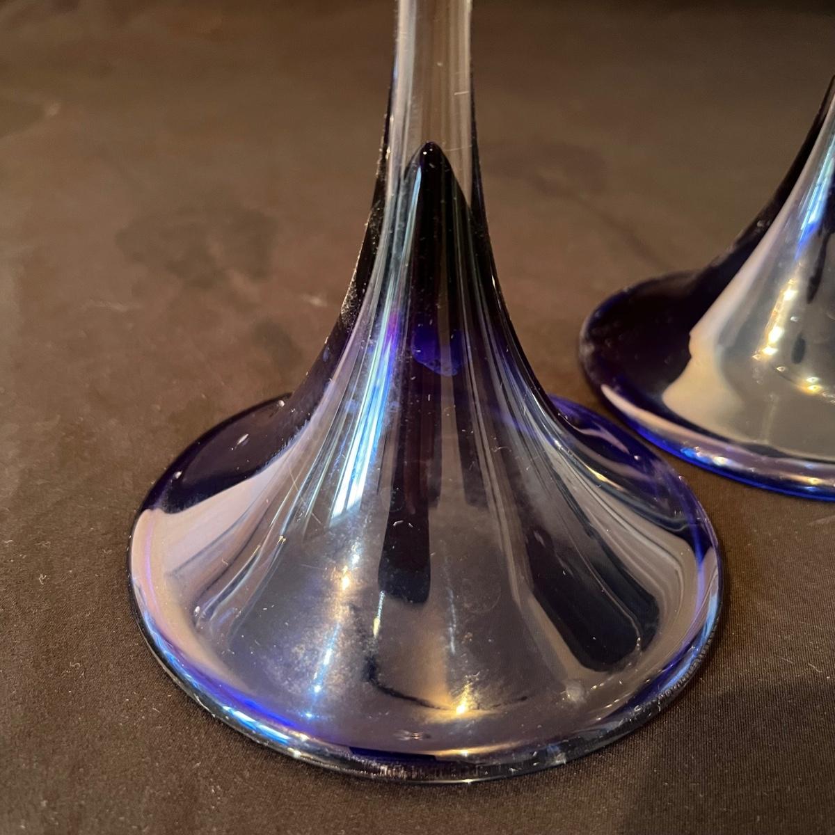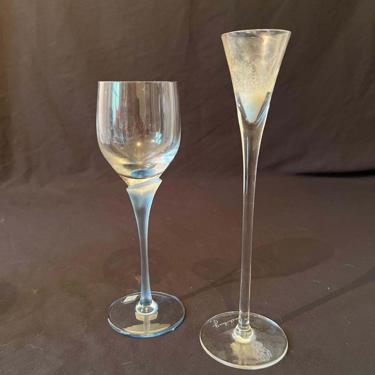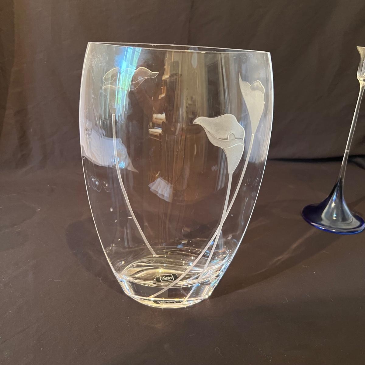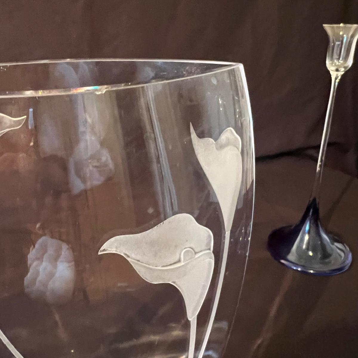 An assortment of glass items with frosted and/or colored glass the Mikasa vase features frosted Calla Lily flowers and measures approximately 8” x 3” x 13”H. The two tallest candle holders match the fluted glass, they all have cobalt blue bases. The glass with pale blue frosted stem has a sticker and the clear glass candle holder has a signature, see images.