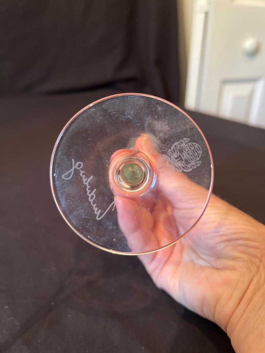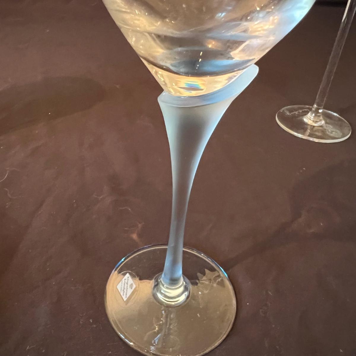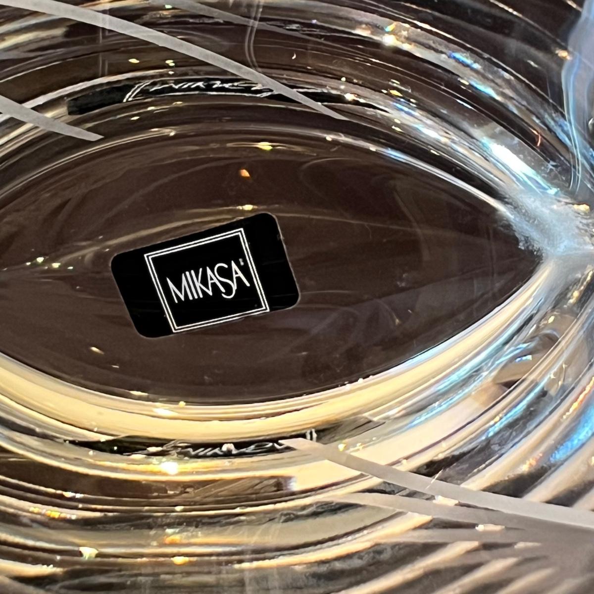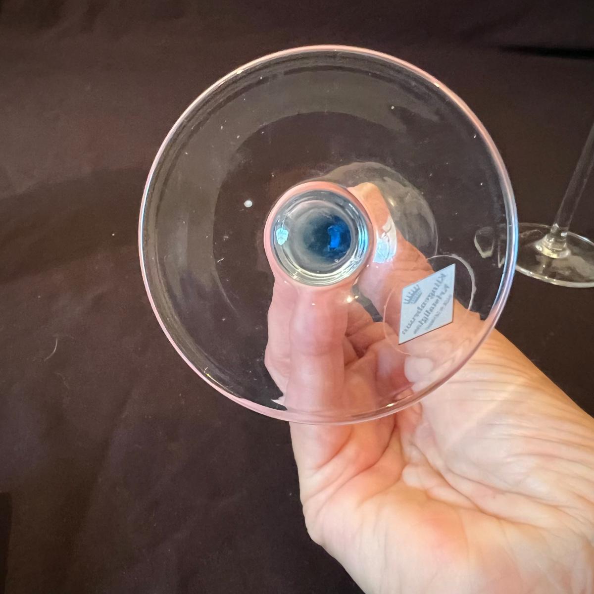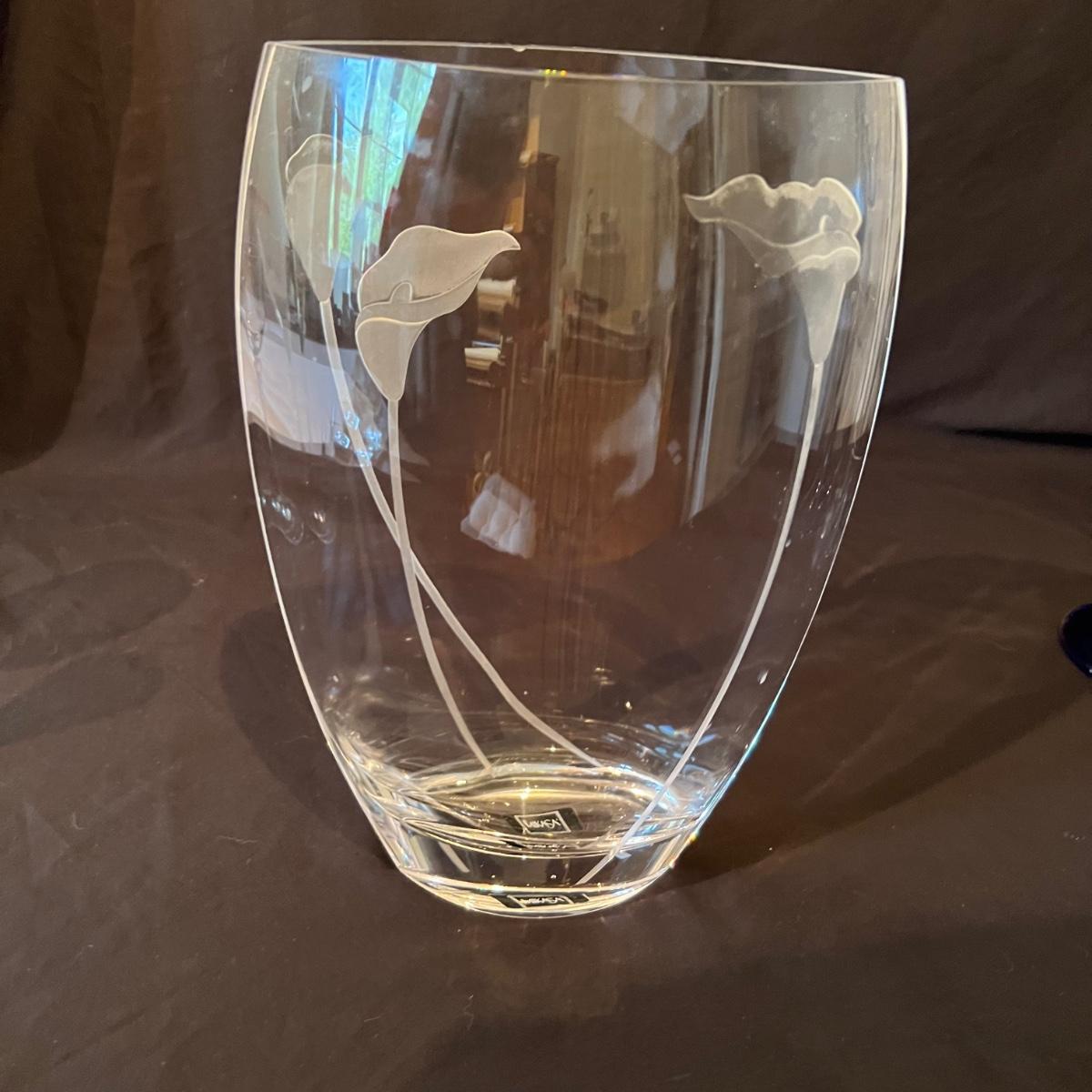 An assortment of glass items with frosted and/or colored glass the Mikasa vase features frosted Calla Lily flowers and measures approximately 8” x 3” x 13”H. The two tallest candle holders match the fluted glass, they all have cobalt blue bases. The glass with pale blue frosted stem has a sticker and the clear glass candle holder has a signature, see images.