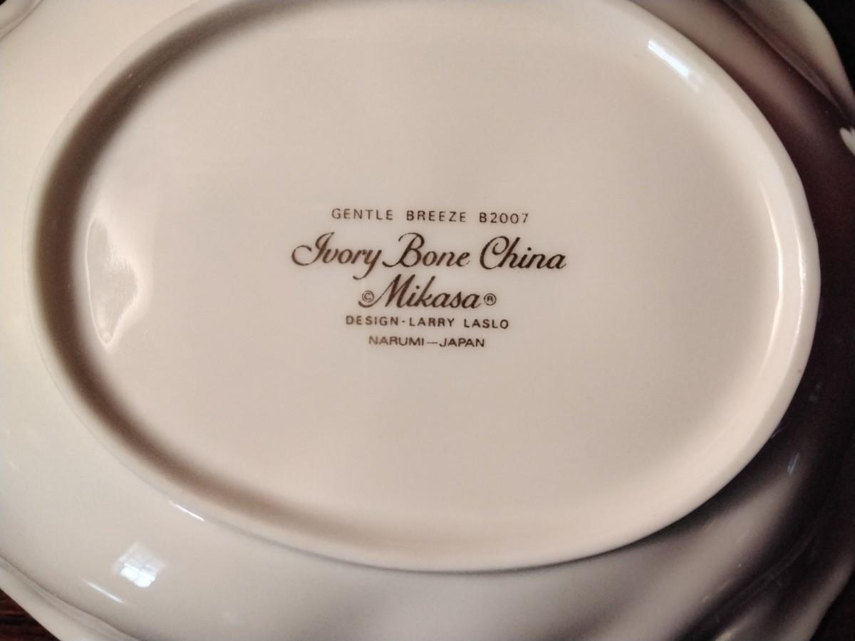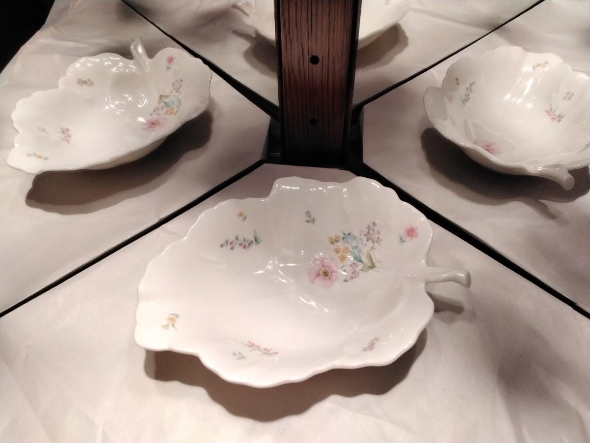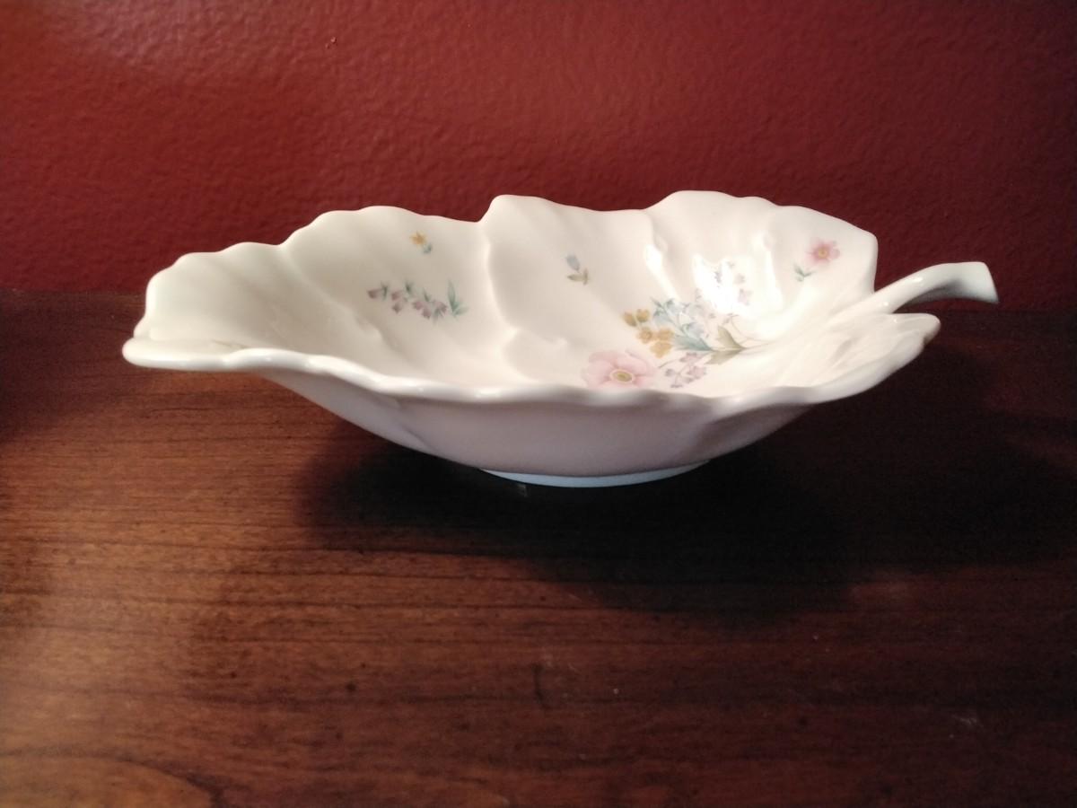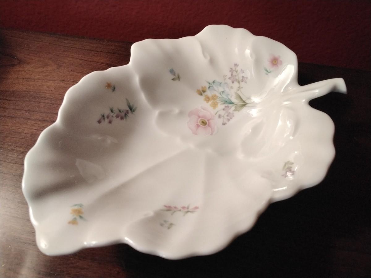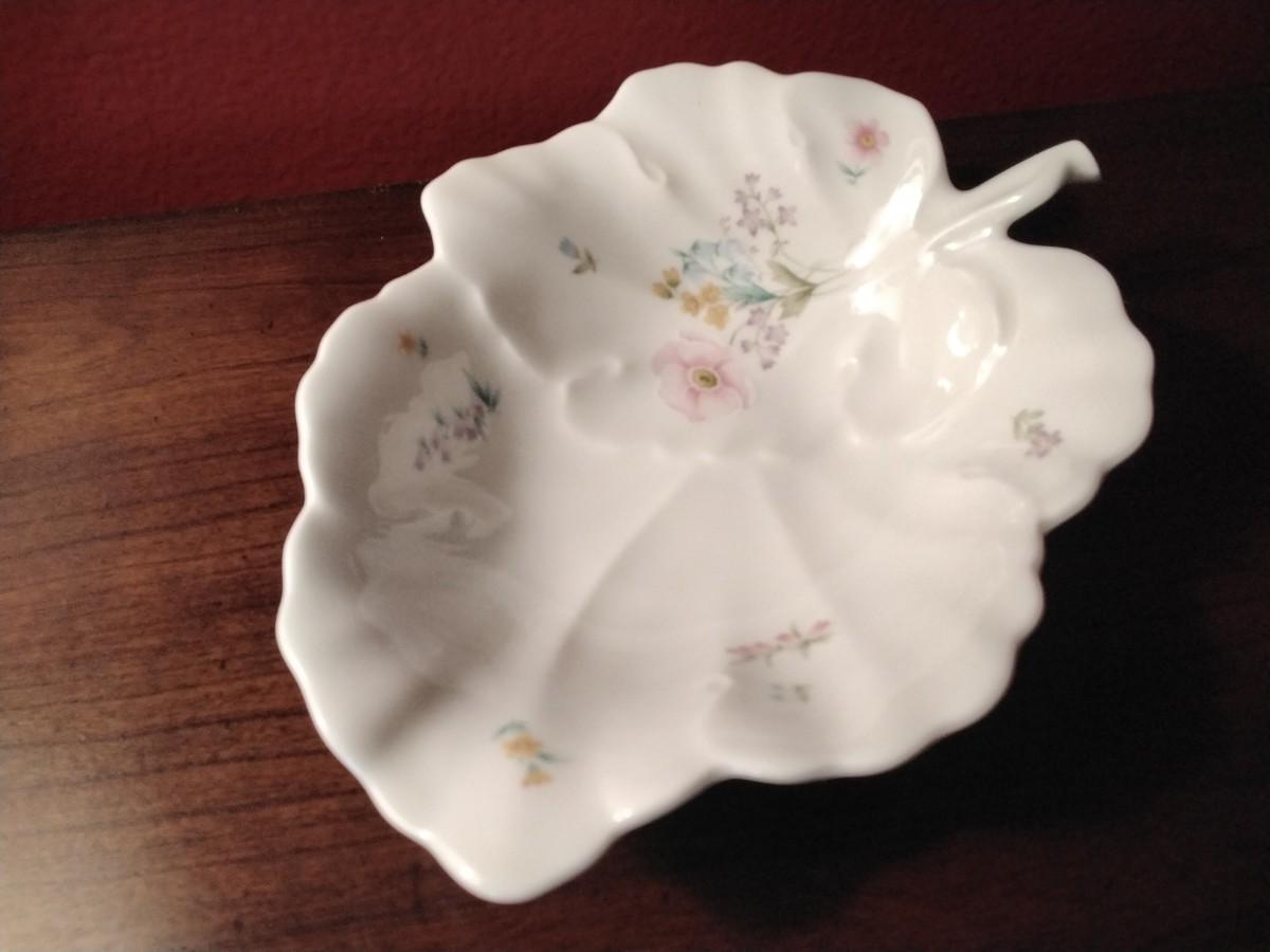 Leaf Shaped Bone China Dish by Mikasa in in Gentle Breeze Which is a Discontinued Pattern. This beautiful little dish is shaped like a leaf and features a delicate floral pattern and scalloped edges. It is in excellent condition with no cracks, chips, or crazing. The colors and floral details are vibrant. This piece measures 7"x 5 1/2".