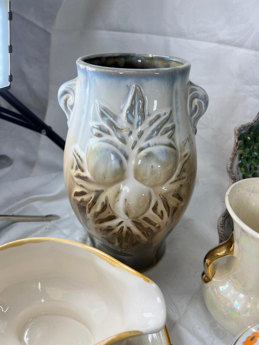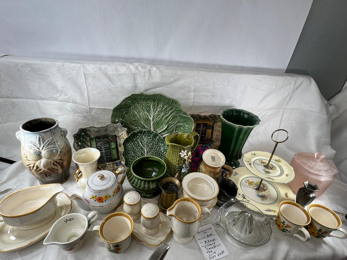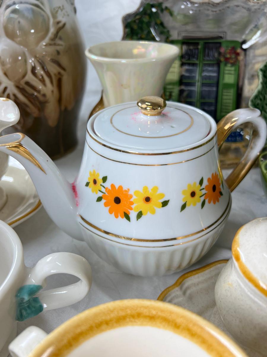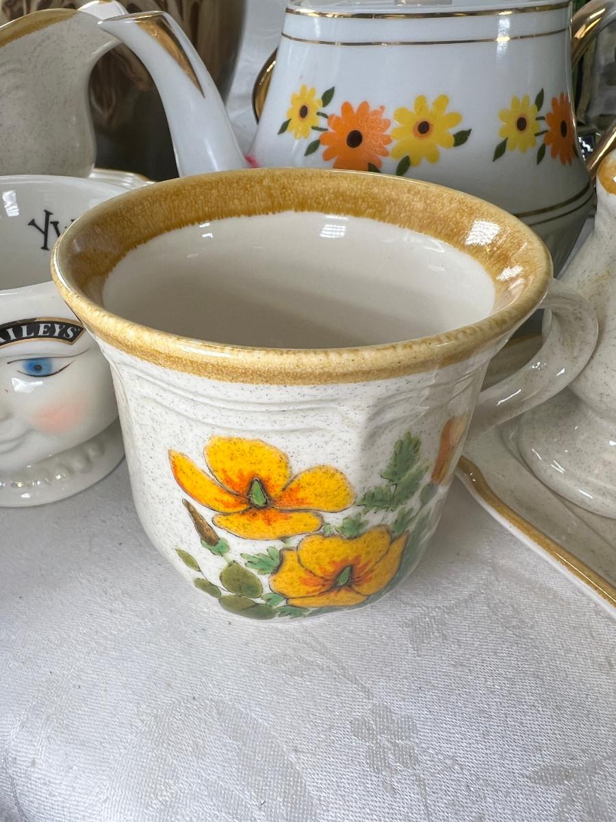 Vintage cups and tea pots, Mikasa daisy stoneware 1970s . The ceramic vase with acorn has a crack .