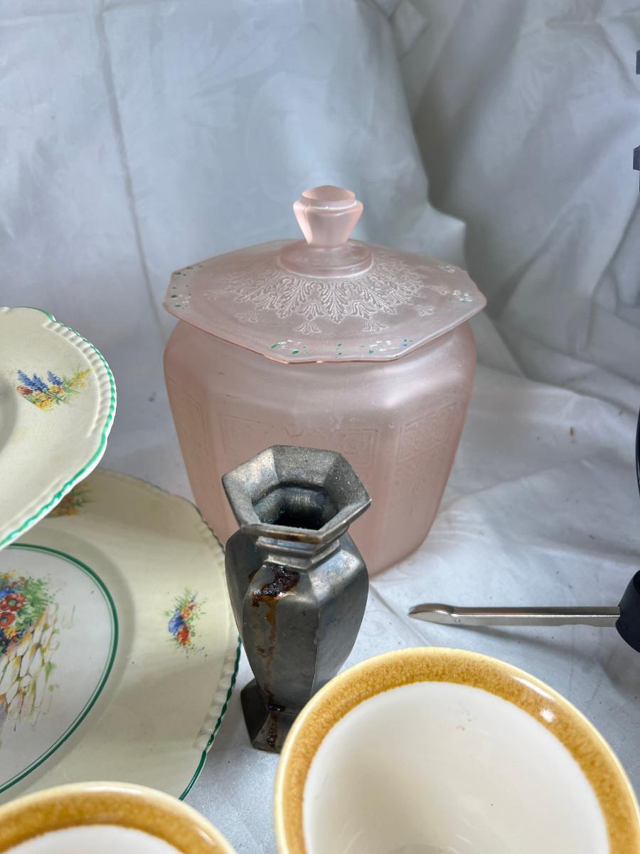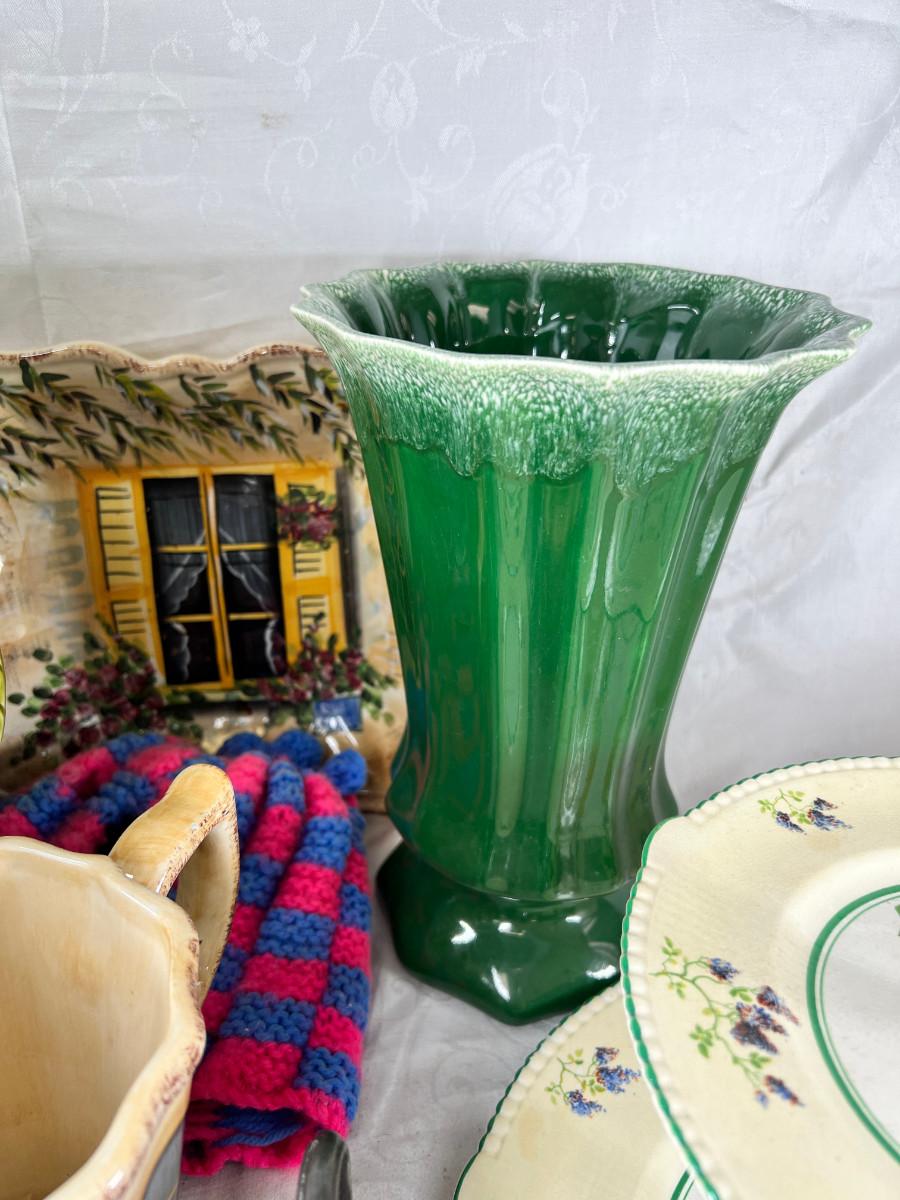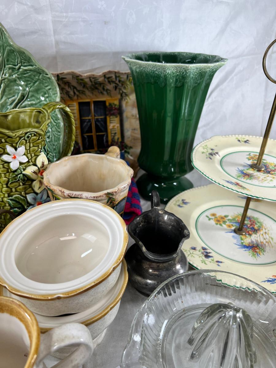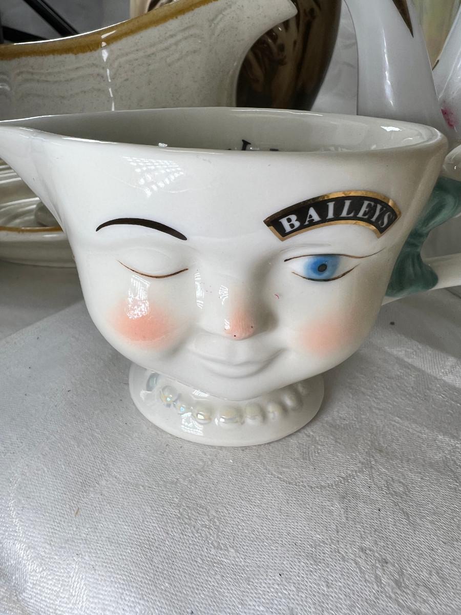 Vintage cups and tea pots, Mikasa daisy stoneware 1970s . The ceramic vase with acorn has a crack .