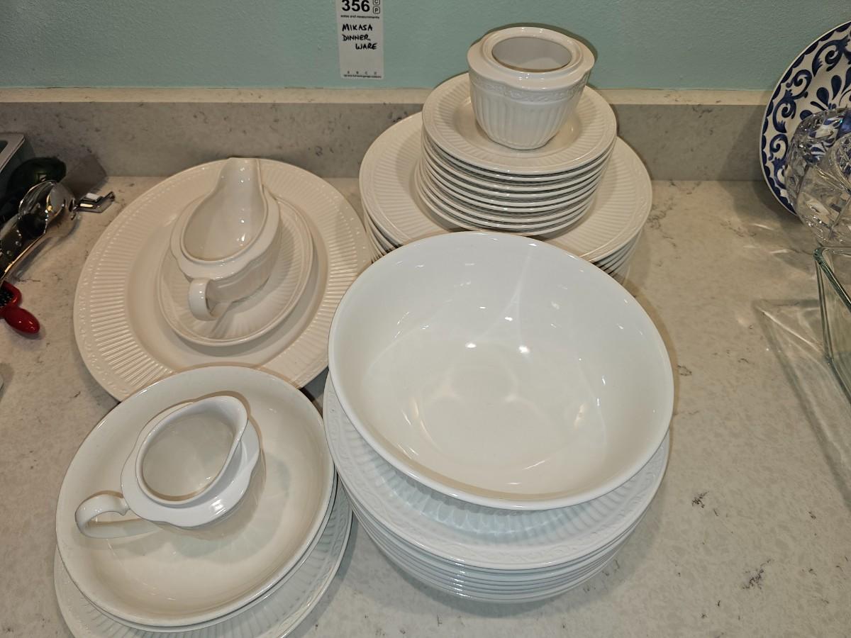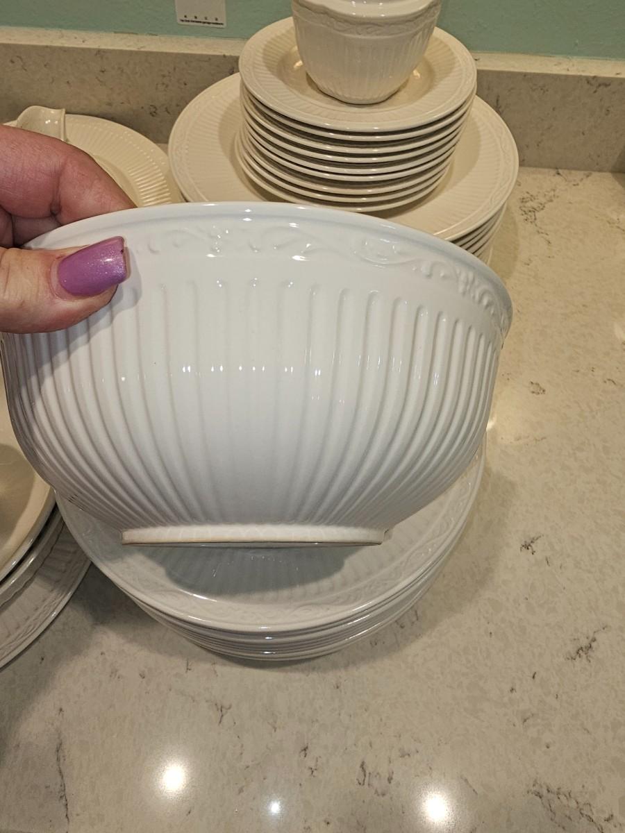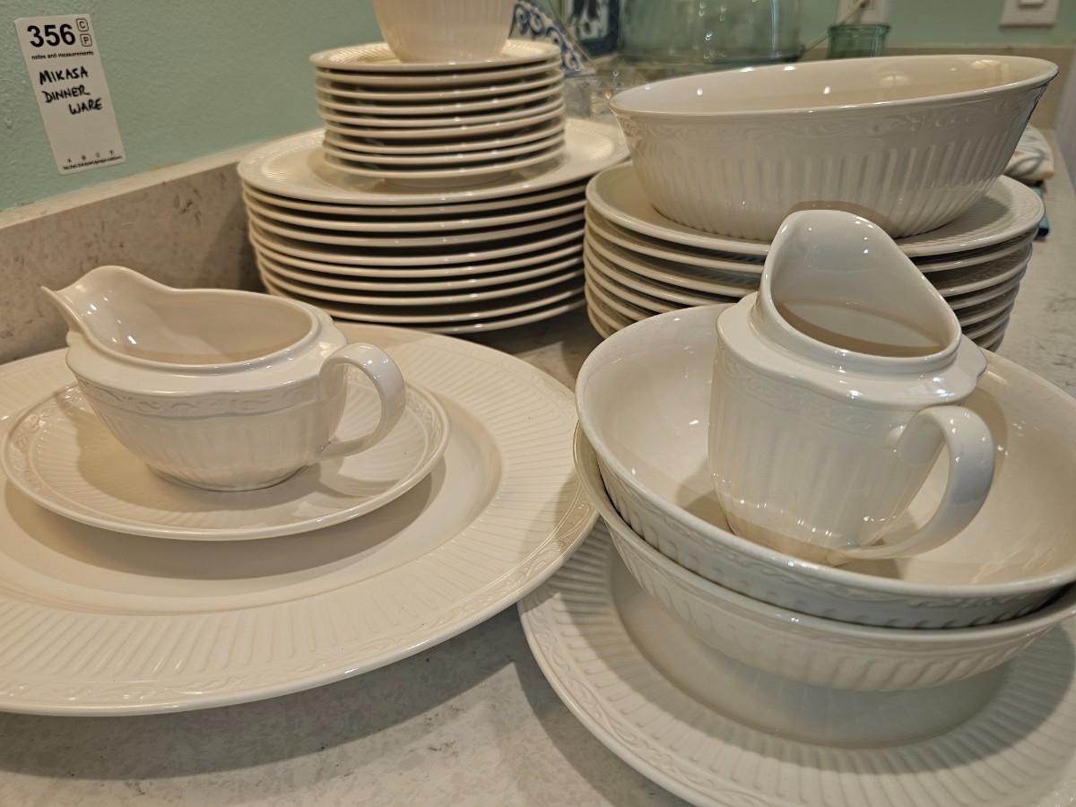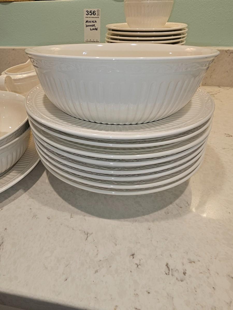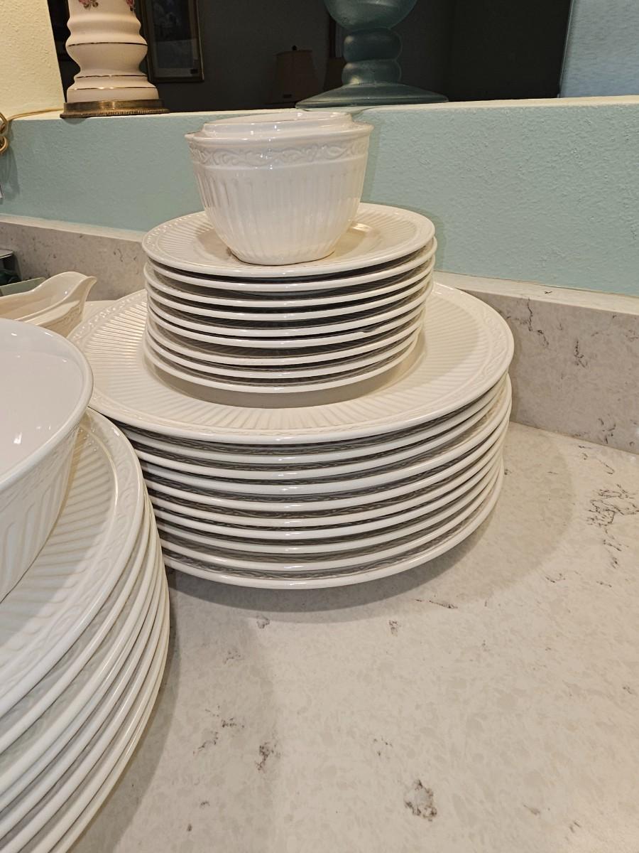Assortment of pieces, not a complete place serving set. Includes plates, bowls, serving pieces, gravy boat, creamer