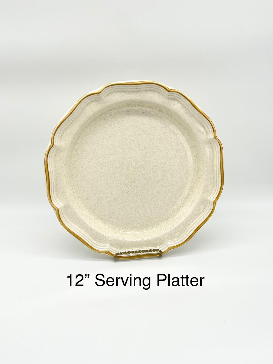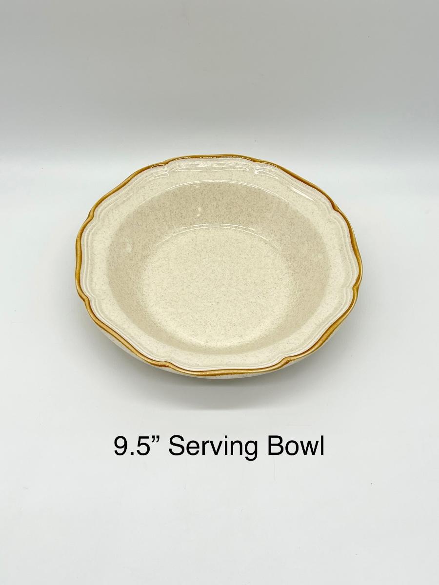 44 piece set includes: 8 dinner plates, 8 salad plates, 8 soup bowls, 8 saucers, 8 cups, 1 serving platter, 1 serving bowl, 1 sugar, & 1 creamer