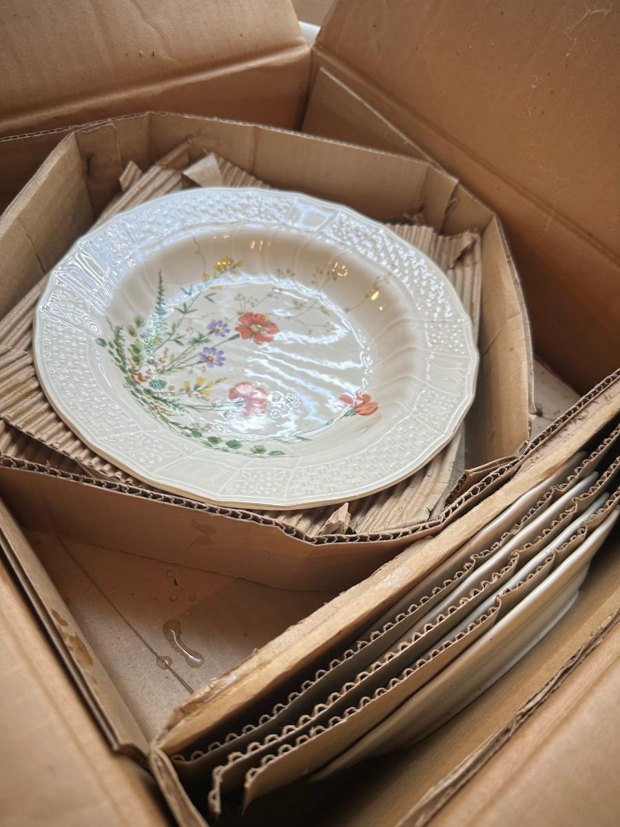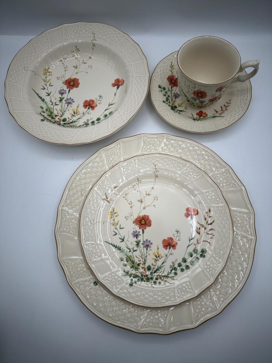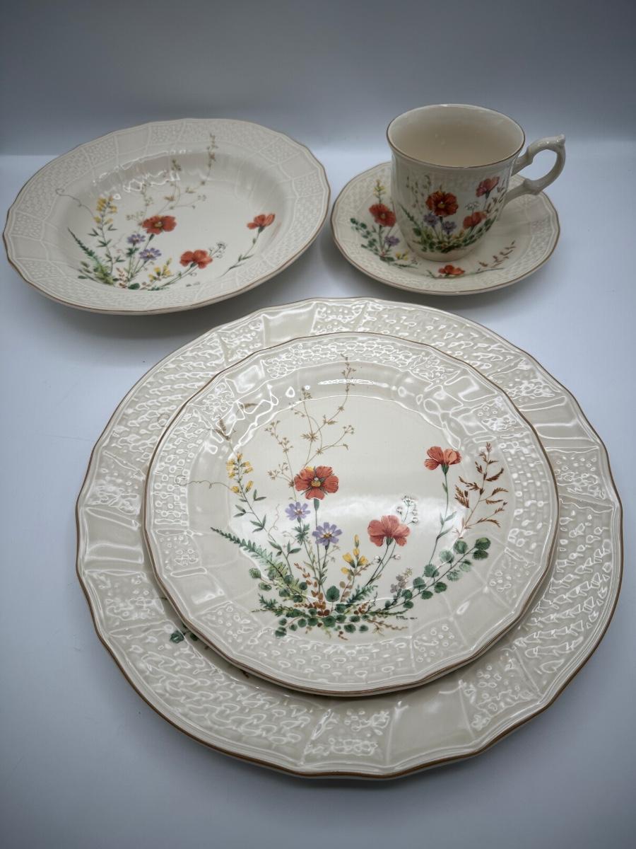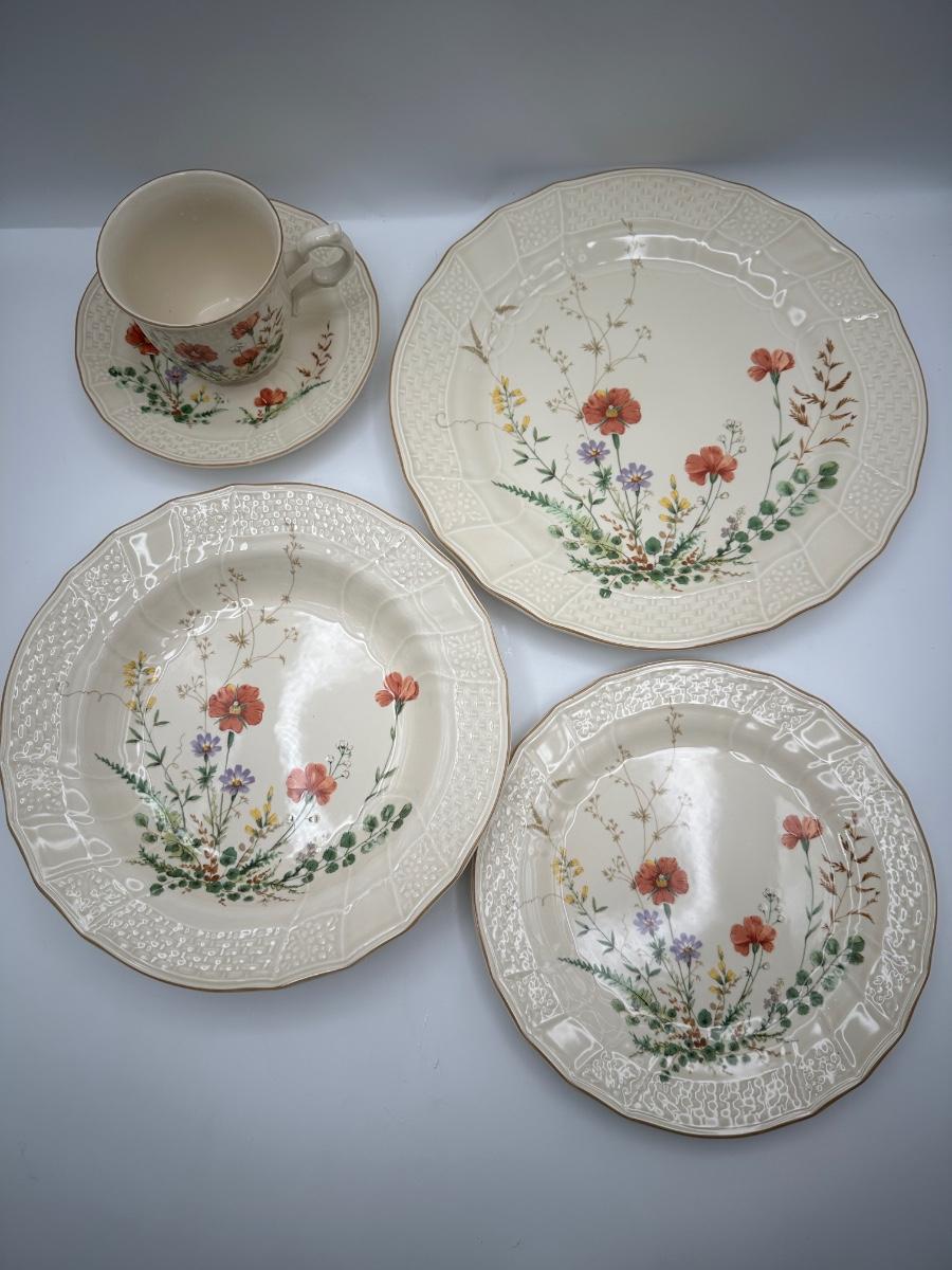 Includes 4 dinner plates, 4 salad plates, 4 bowls, 4 cups, and 4 saucers. Made in Japan. Oven to table, dishwasher and microwave safe.