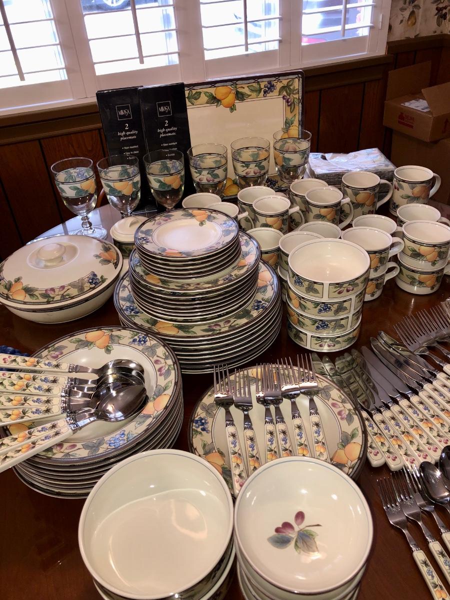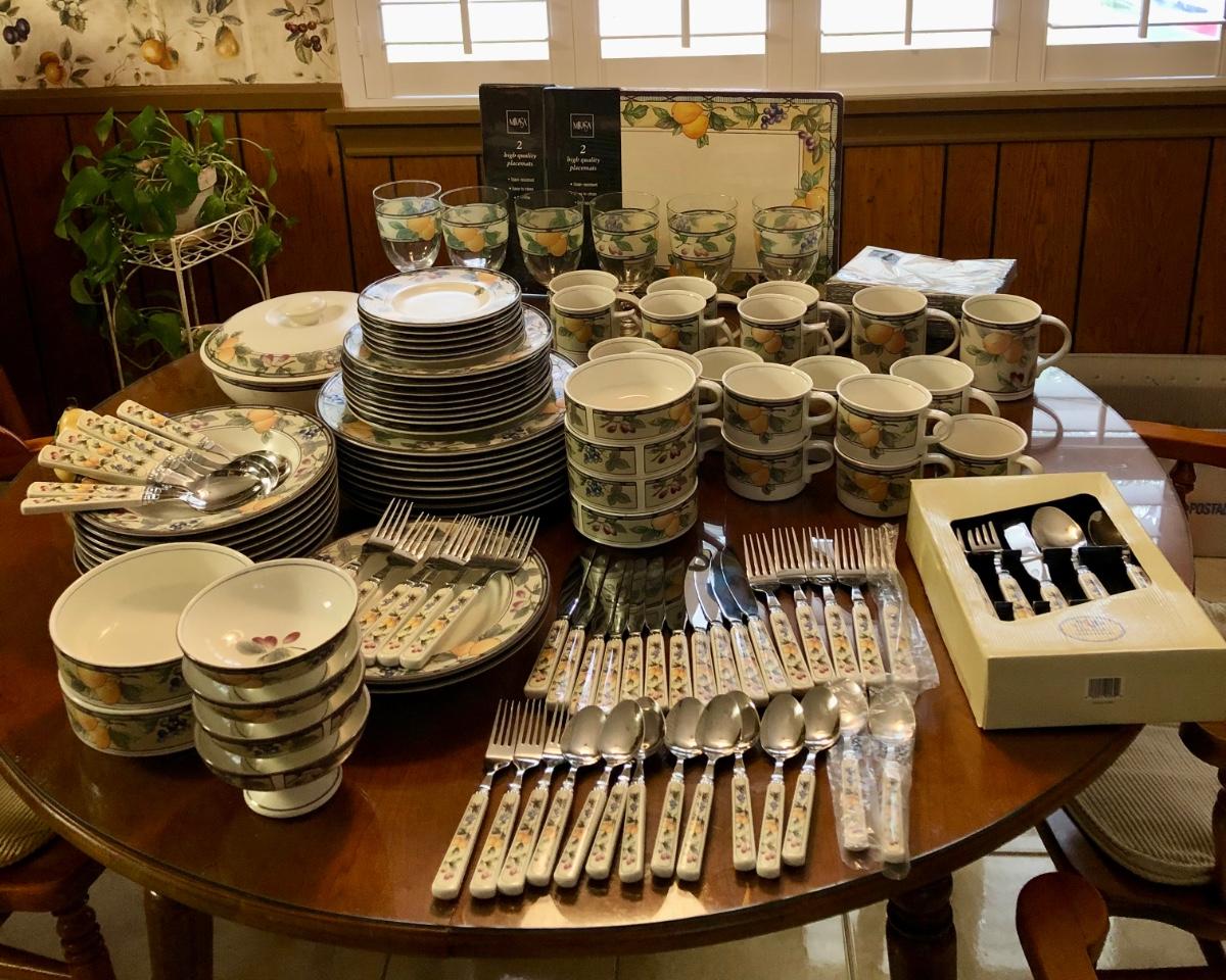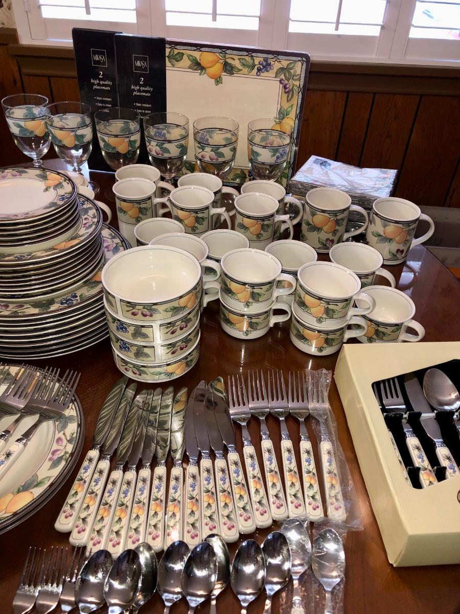 Full set of dishes, bowls, coffee cups, teacups, glasses, covered dish, salt and pepper shakers, place mats and silverware