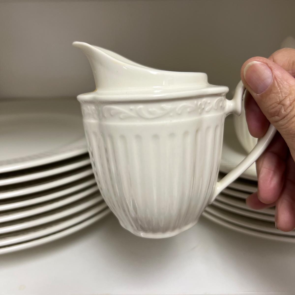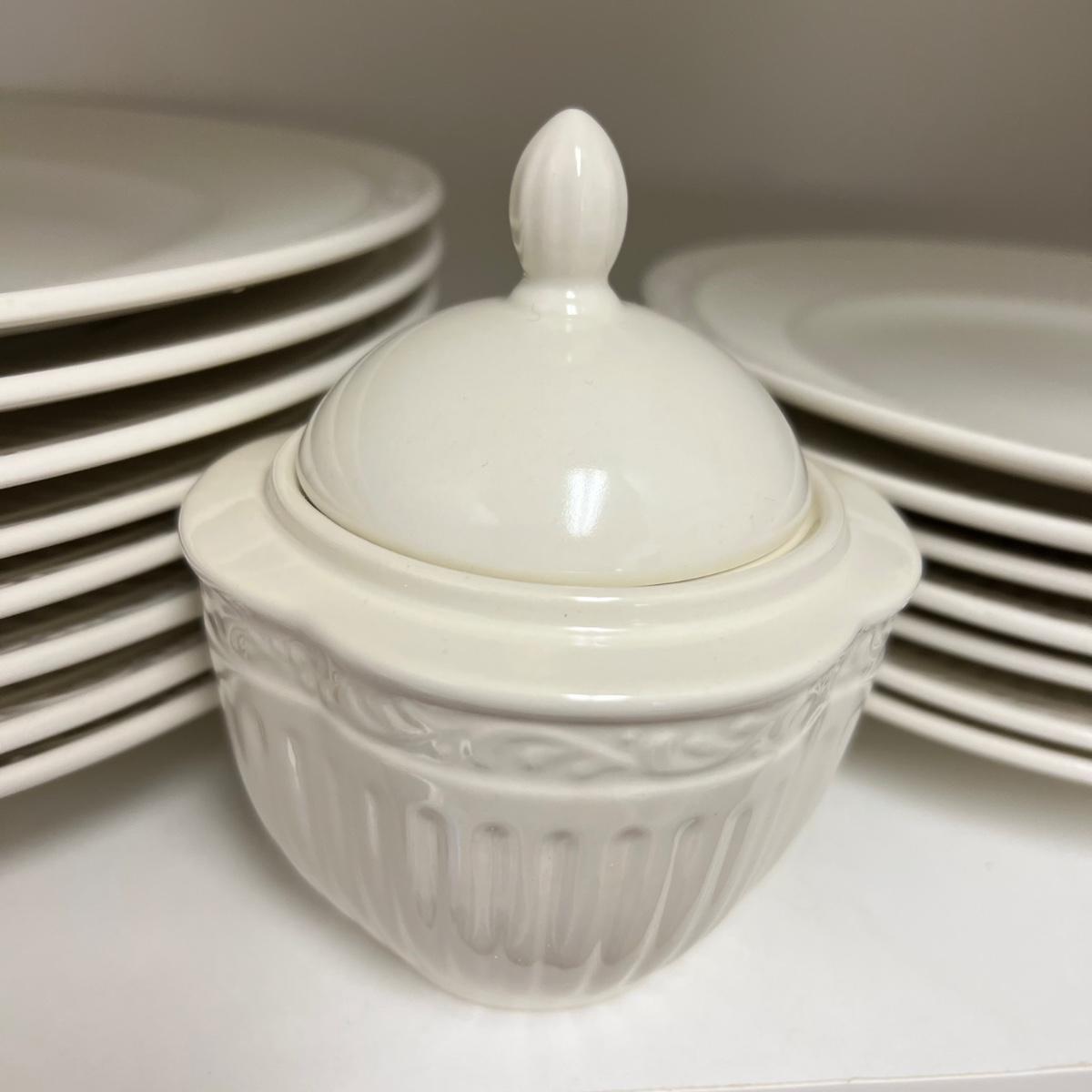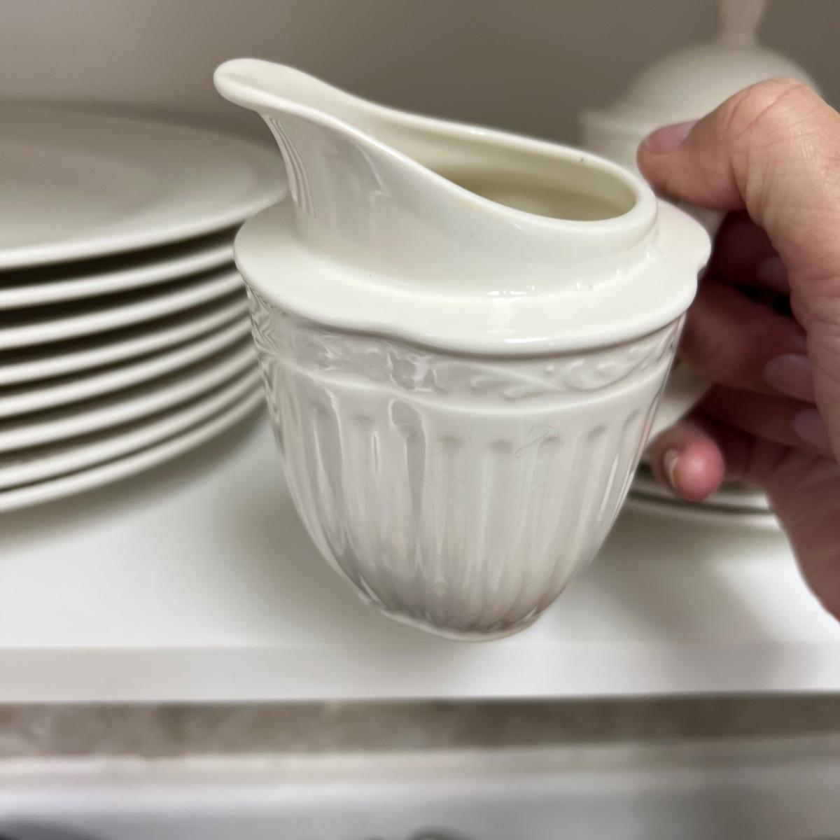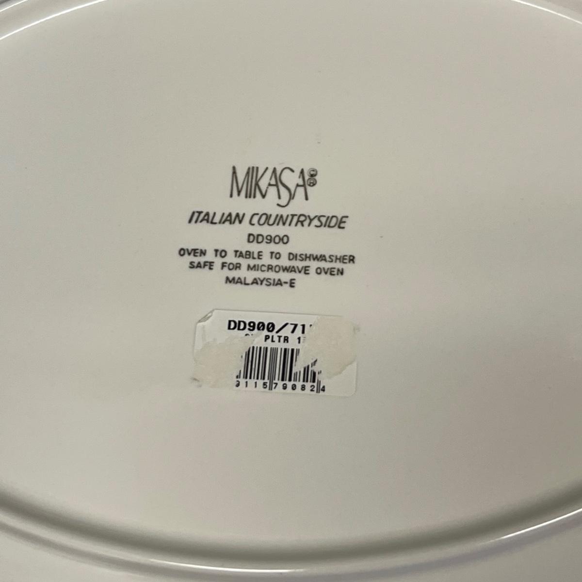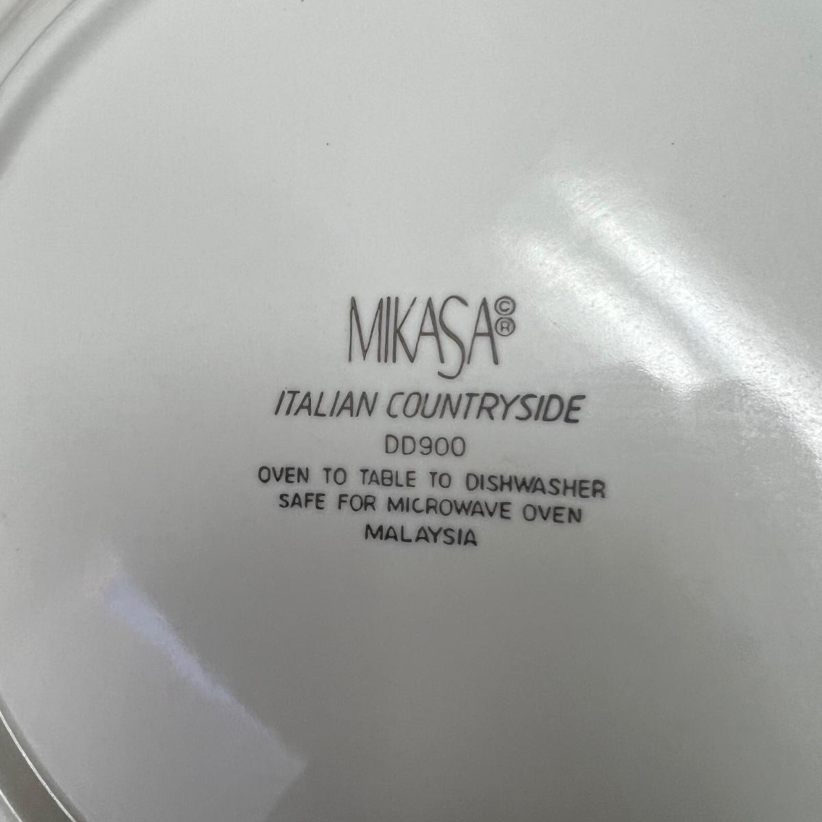 This six piece eight place settings Mikasa ceramic set includes dinner plates (11” D), bread plates, soup and dessert plates, cups and saucers along with a lidded sugar bowl, pitcher and platter (11” x 15”)