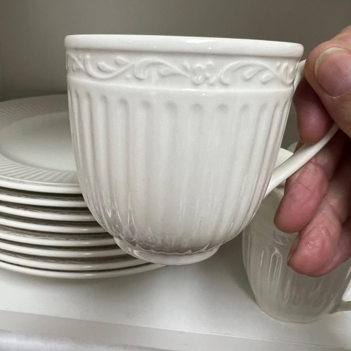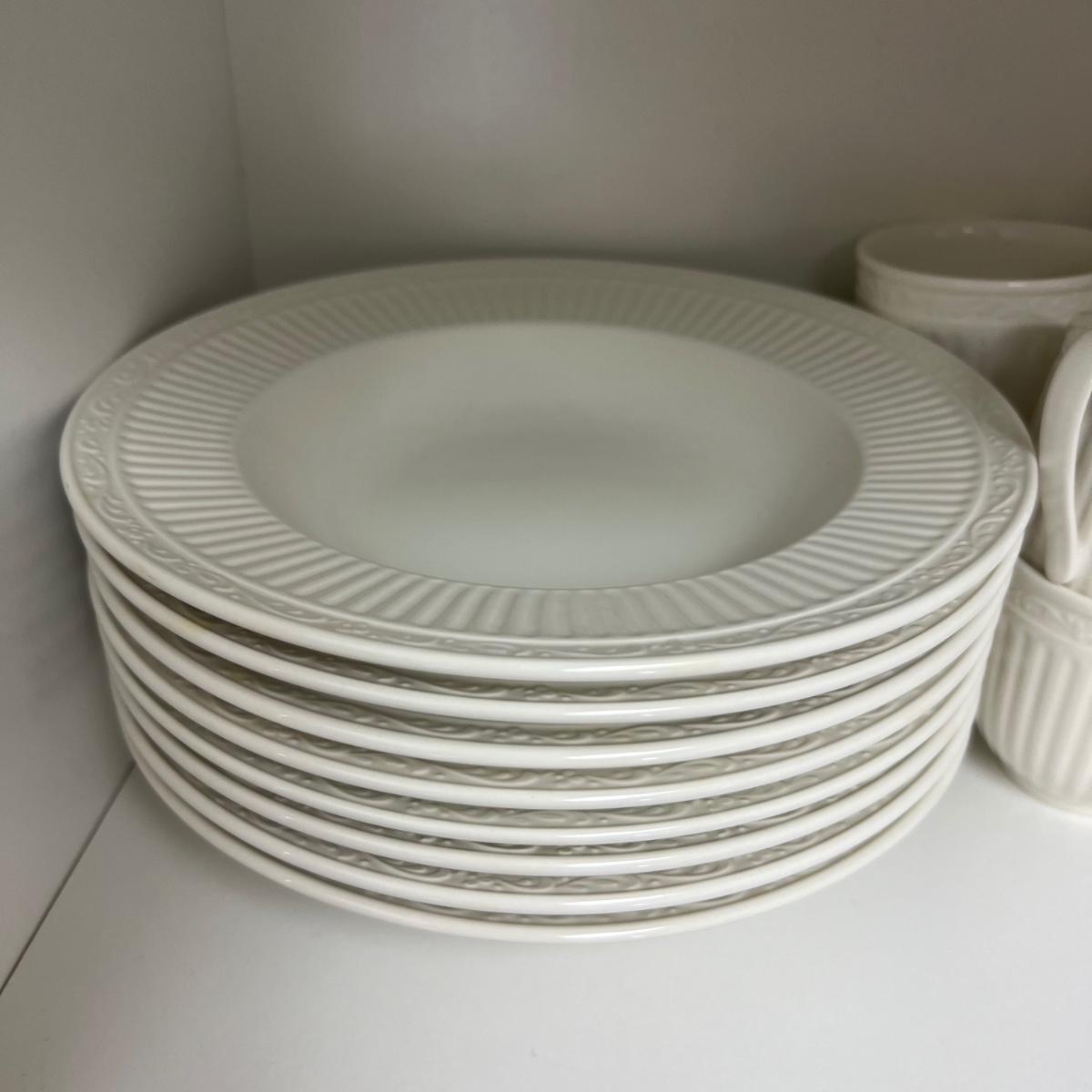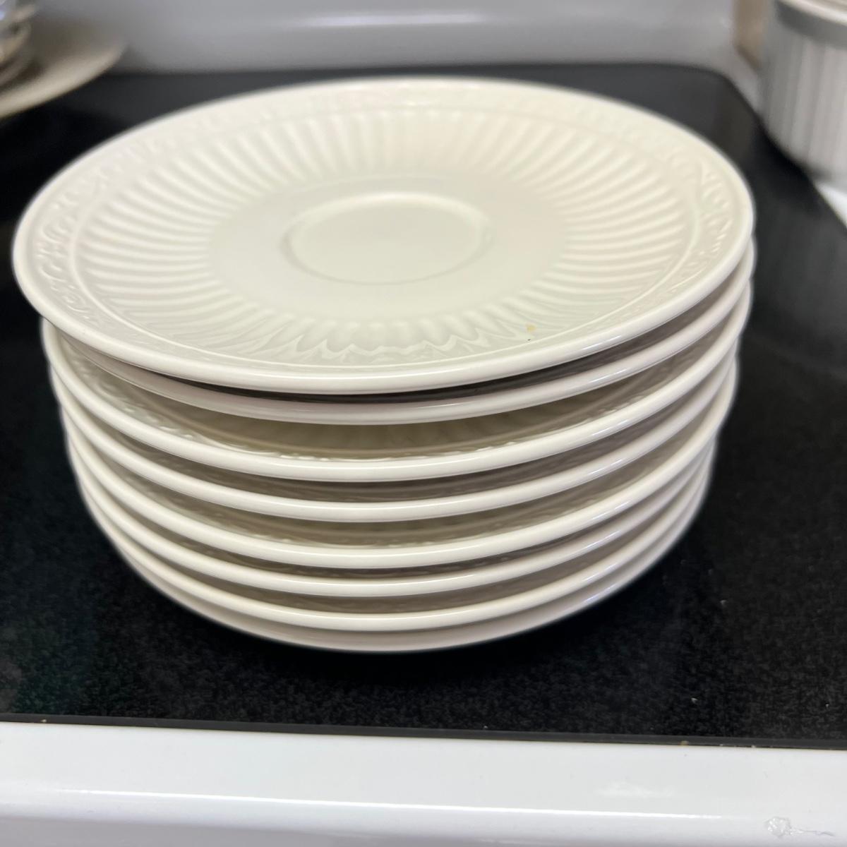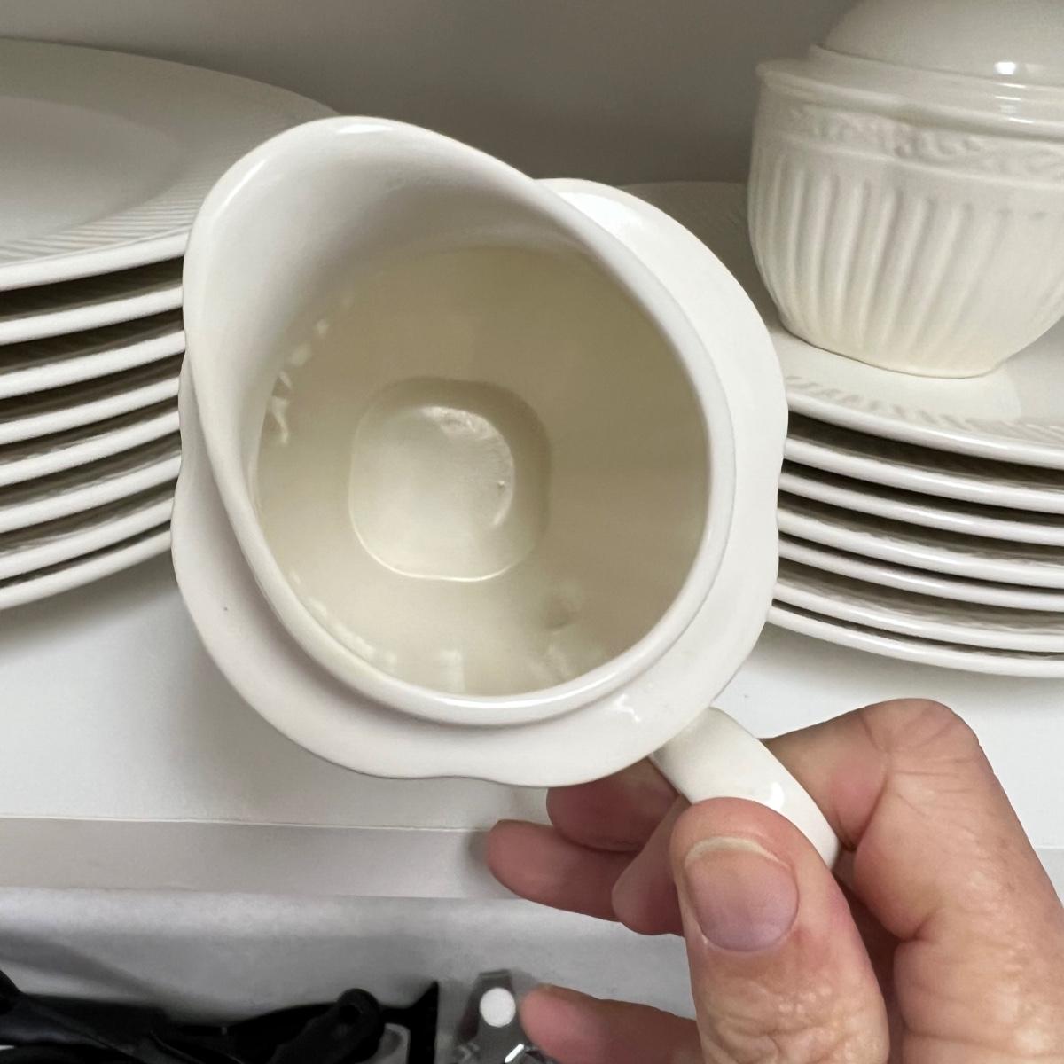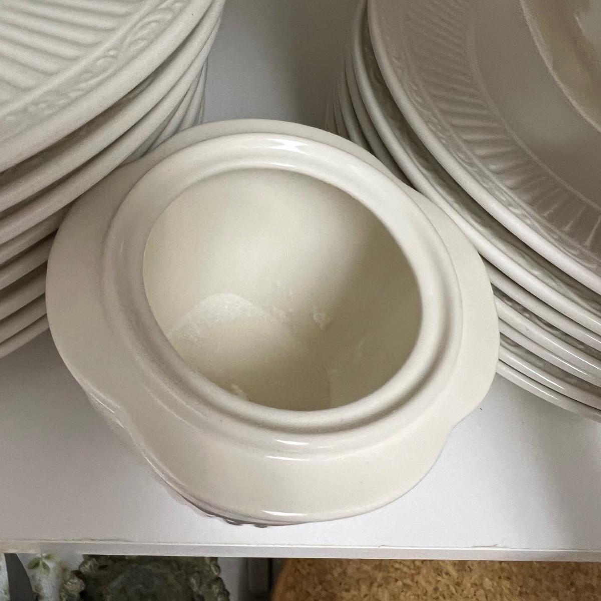 This six piece eight place settings Mikasa ceramic set includes dinner plates (11” D), bread plates, soup and dessert plates, cups and saucers along with a lidded sugar bowl, pitcher and platter (11” x 15”)