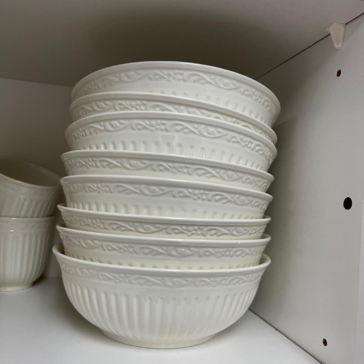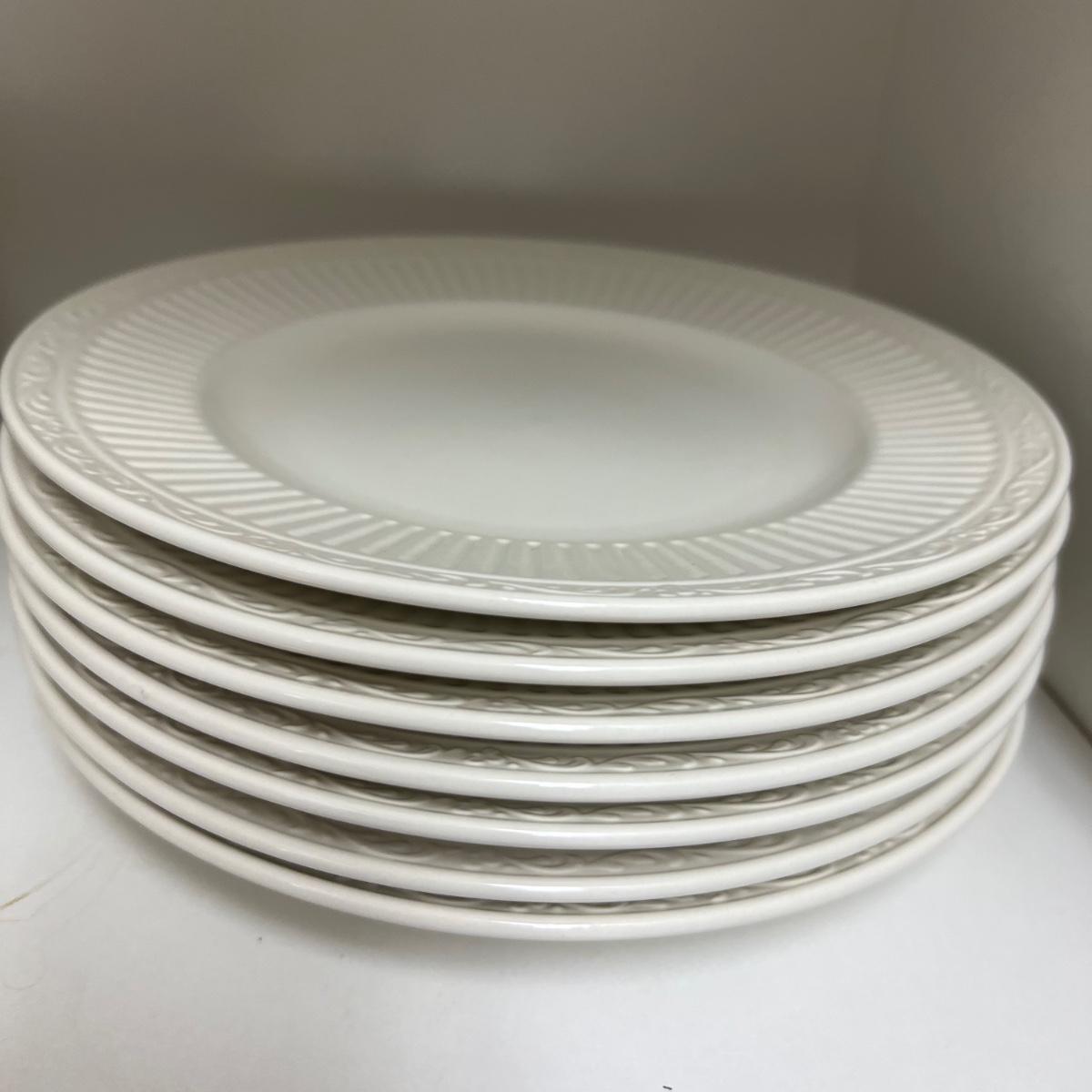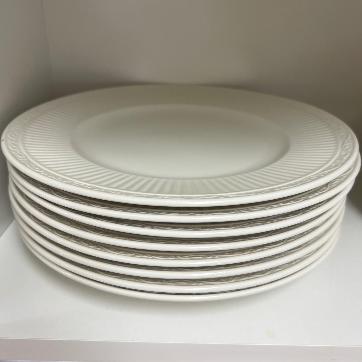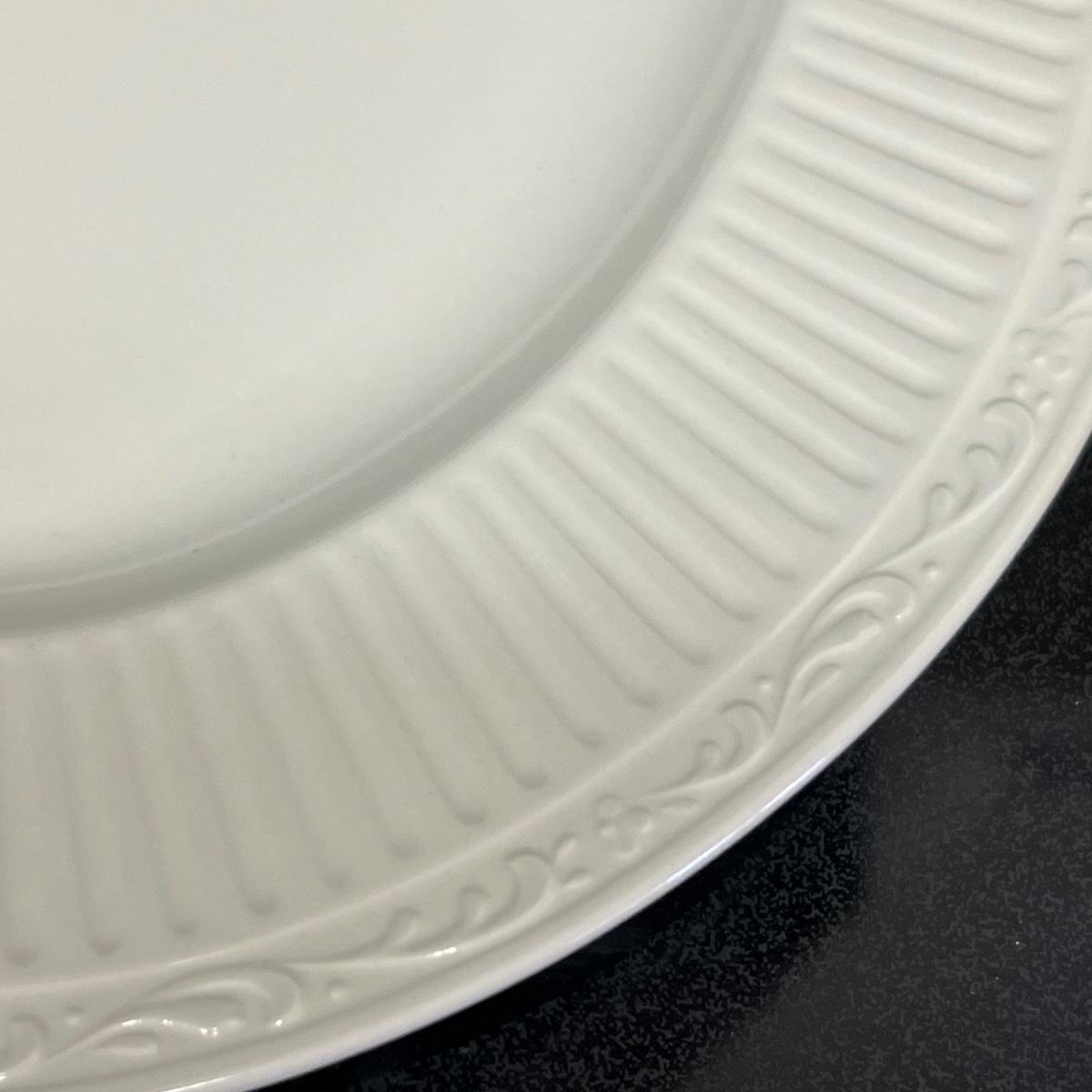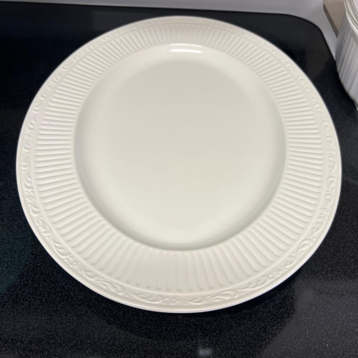 This six piece eight place settings Mikasa ceramic set includes dinner plates (11” D), bread plates, soup and dessert plates, cups and saucers along with a lidded sugar bowl, pitcher and platter (11” x 15”)