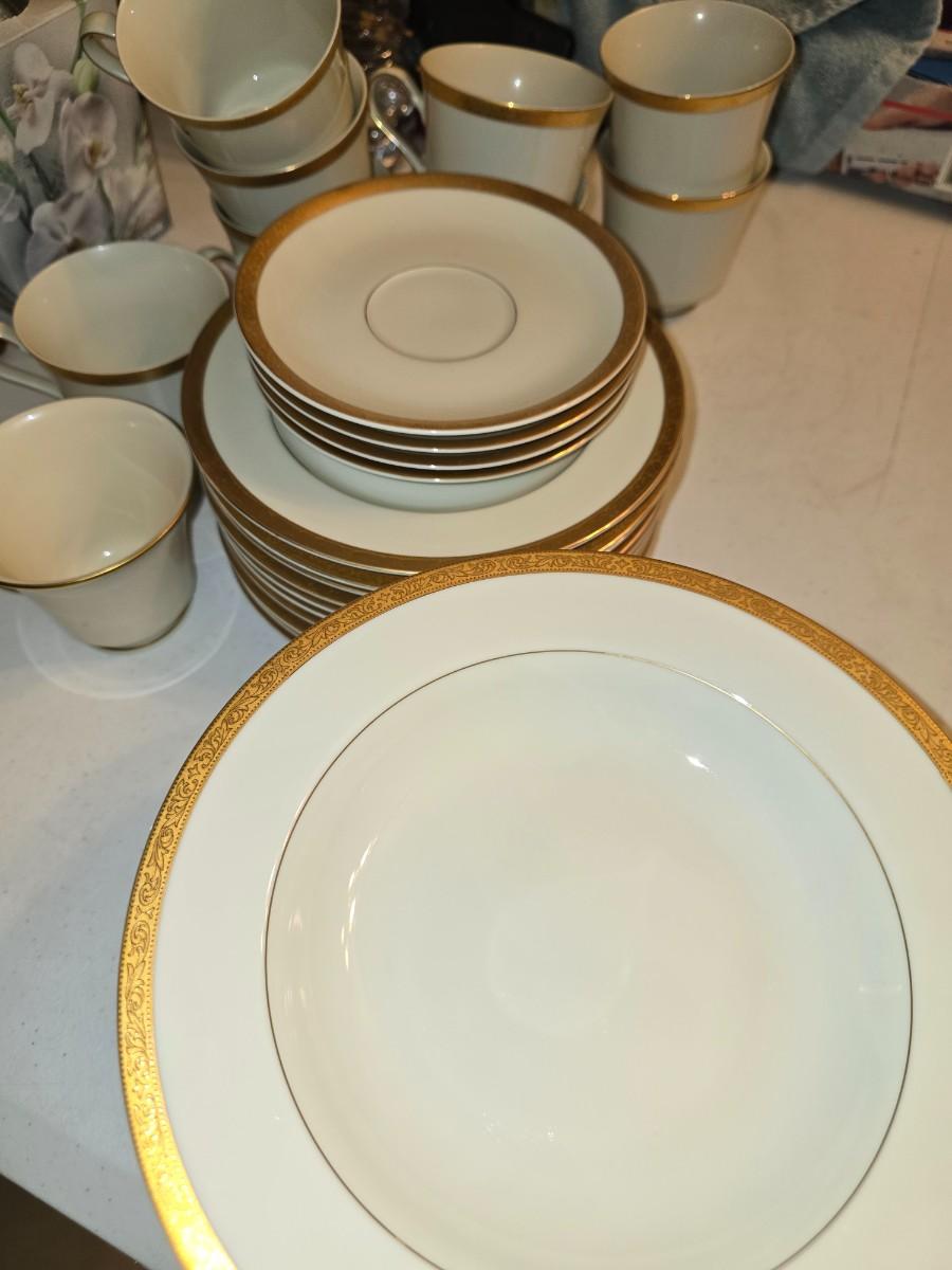 Includes dinner plates, salad plates, tea cups dessert plates. 4 saucers