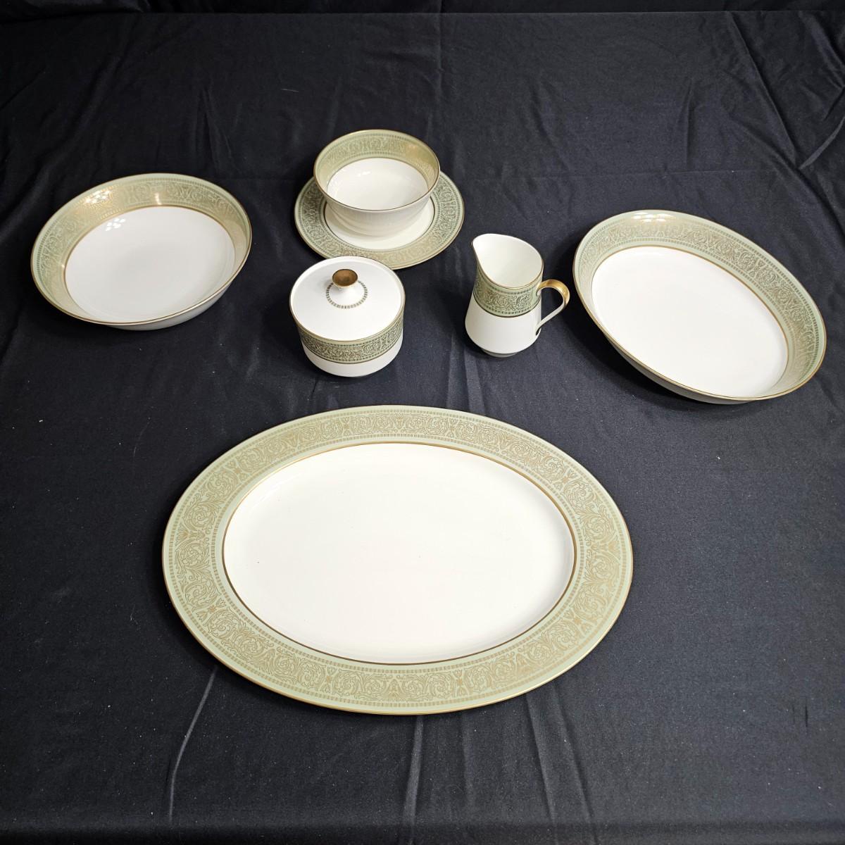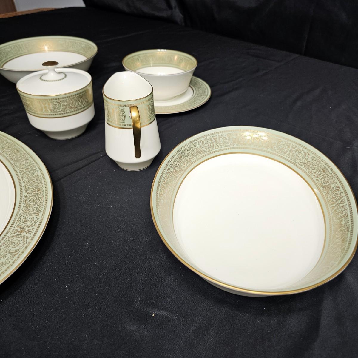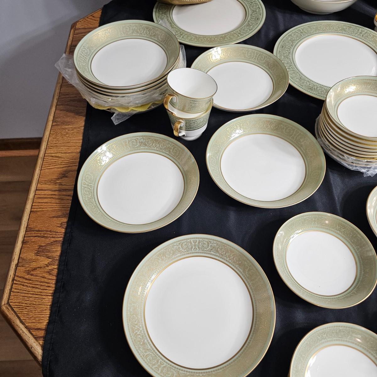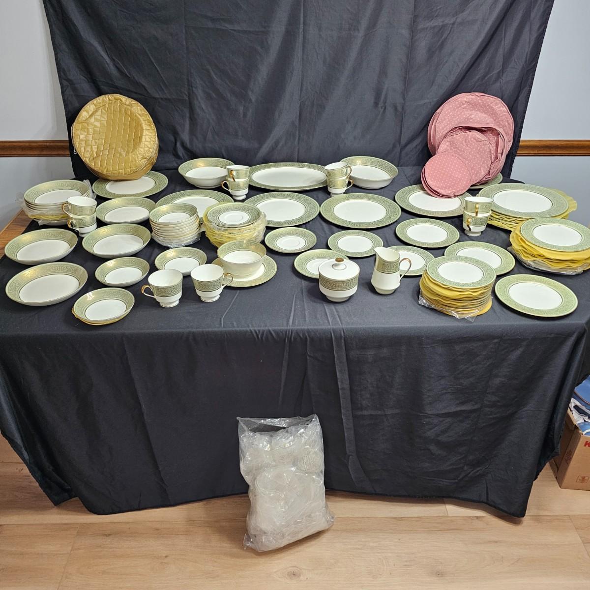 Gold filigree pattern on edges of china pieces. Classic, elegant design for fine or casual dining. Seven-piece place settings, service for twelve but only ten cups. Dinner, salad, dessert plates, soup bowls and more. Comes with large serving platter (approximately 15"long), serving bowls, gravy boat, sugar and creamer. More than 80 pieces. Most all items are leaved with foam padding and secured in vinyl storage cases. There are additional sleeves and padding in box if winning bidder wishes to pack more. See photos for details. Local pickup only.