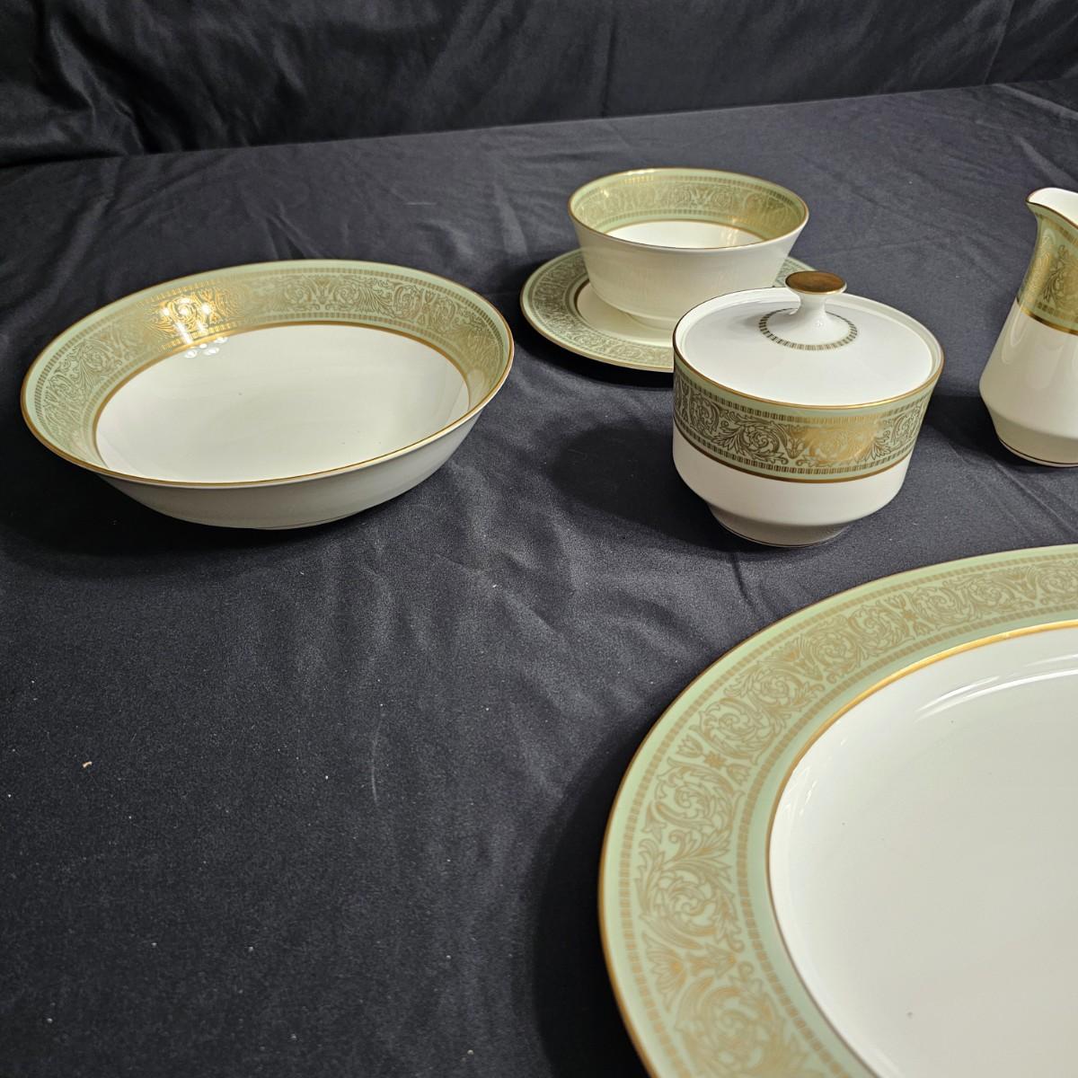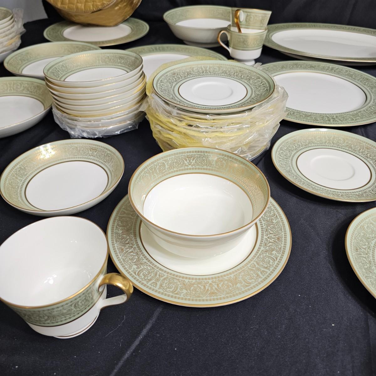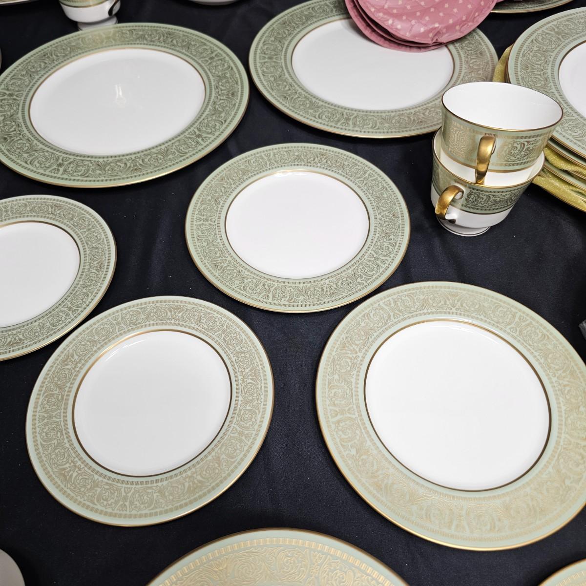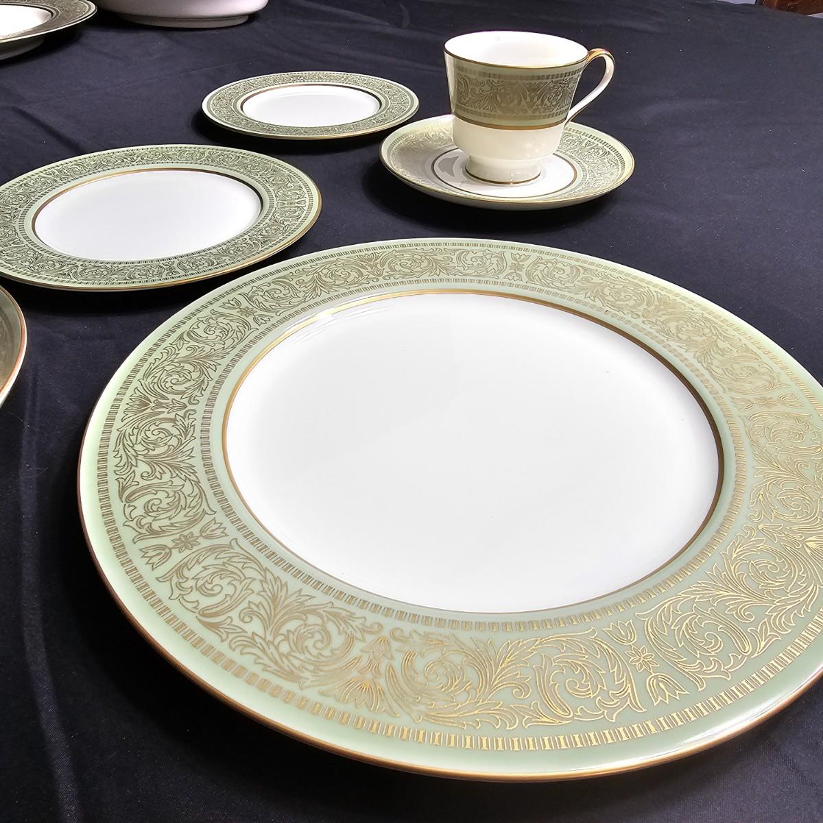 Gold filigree pattern on edges of china pieces. Classic, elegant design for fine or casual dining. Seven-piece place settings, service for twelve but only ten cups. Dinner, salad, dessert plates, soup bowls and more. Comes with large serving platter (approximately 15"long), serving bowls, gravy boat, sugar and creamer. More than 80 pieces. Most all items are leaved with foam padding and secured in vinyl storage cases. There are additional sleeves and padding in box if winning bidder wishes to pack more. See photos for details. Local pickup only.