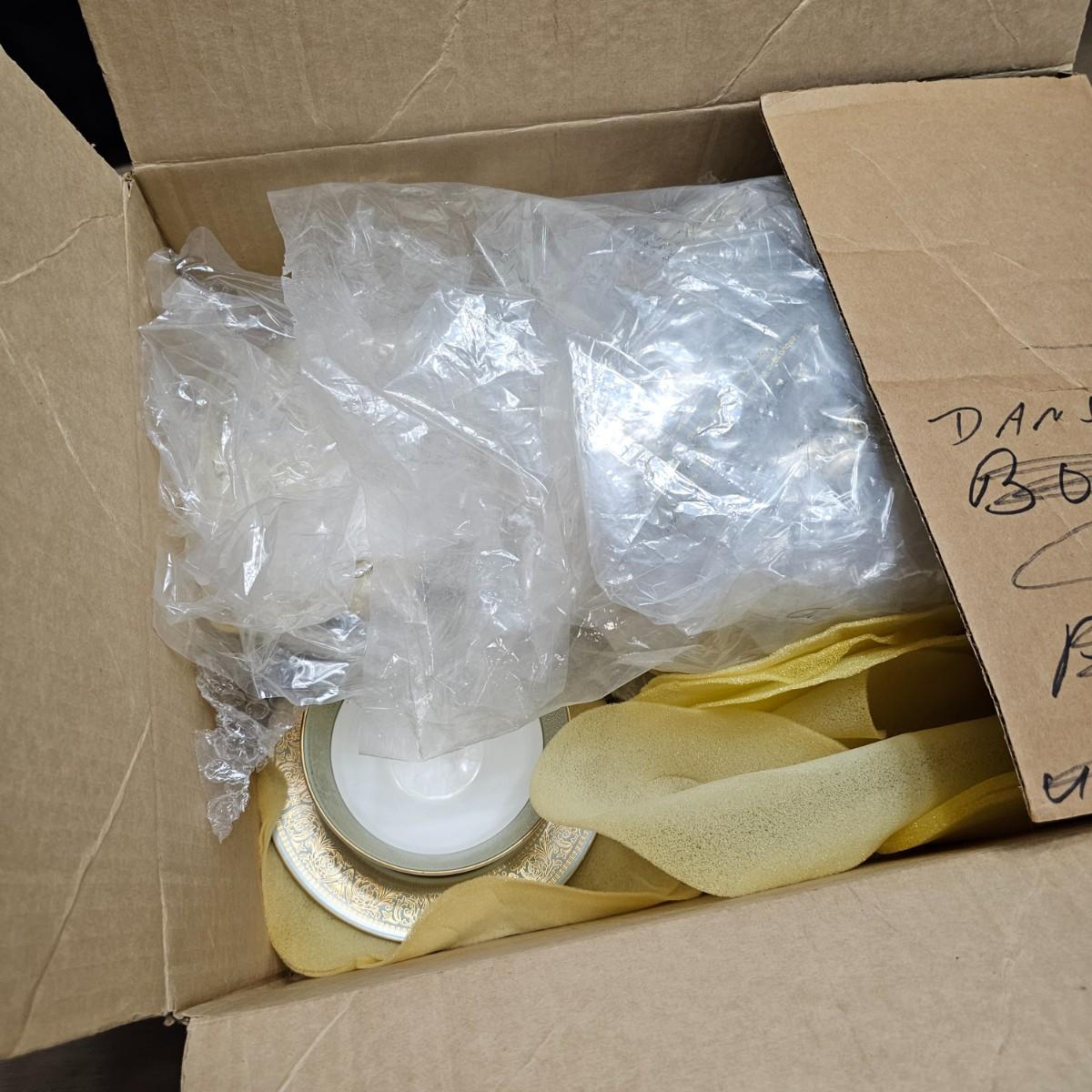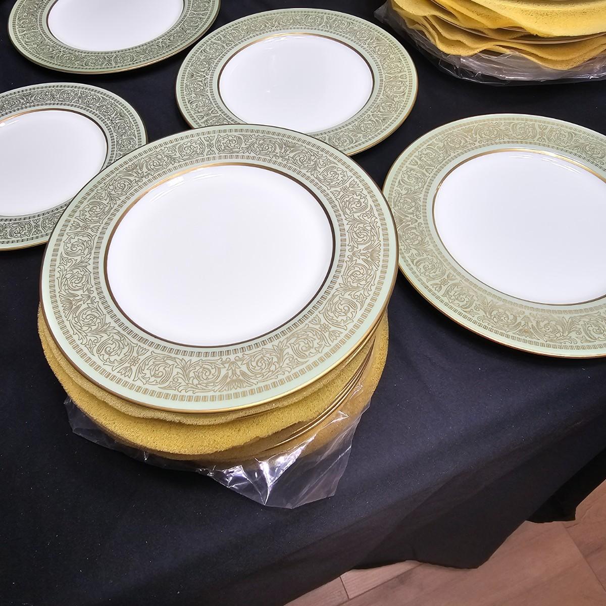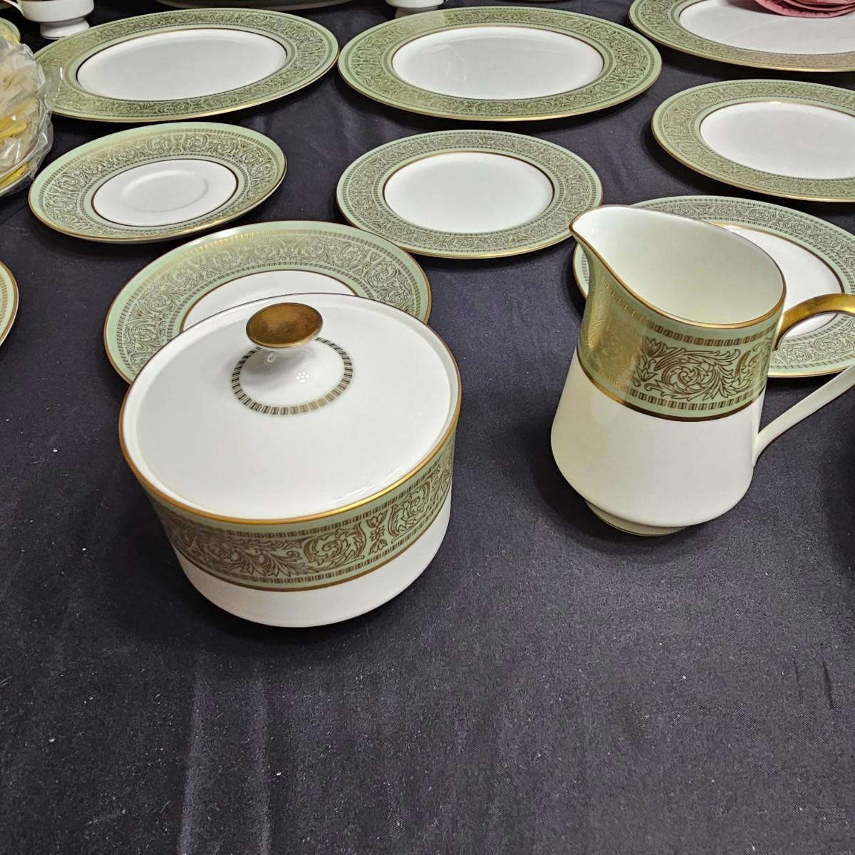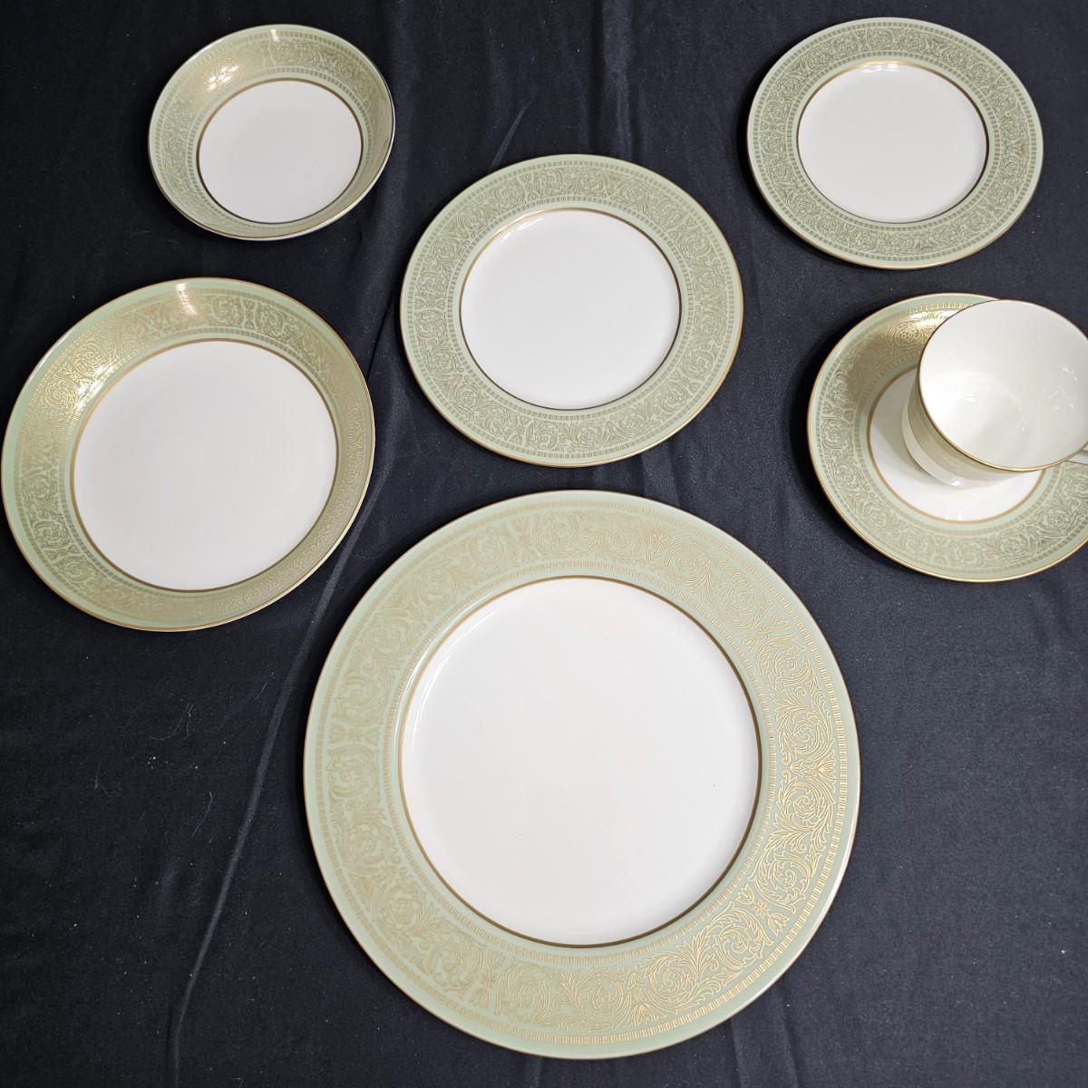 Gold filigree pattern on edges of china pieces. Classic, elegant design for fine or casual dining. Seven-piece place settings, service for twelve but only ten cups. Dinner, salad, dessert plates, soup bowls and more. Comes with large serving platter (approximately 15"long), serving bowls, gravy boat, sugar and creamer. More than 80 pieces. Most all items are leaved with foam padding and secured in vinyl storage cases. There are additional sleeves and padding in box if winning bidder wishes to pack more. See photos for details. Local pickup only.