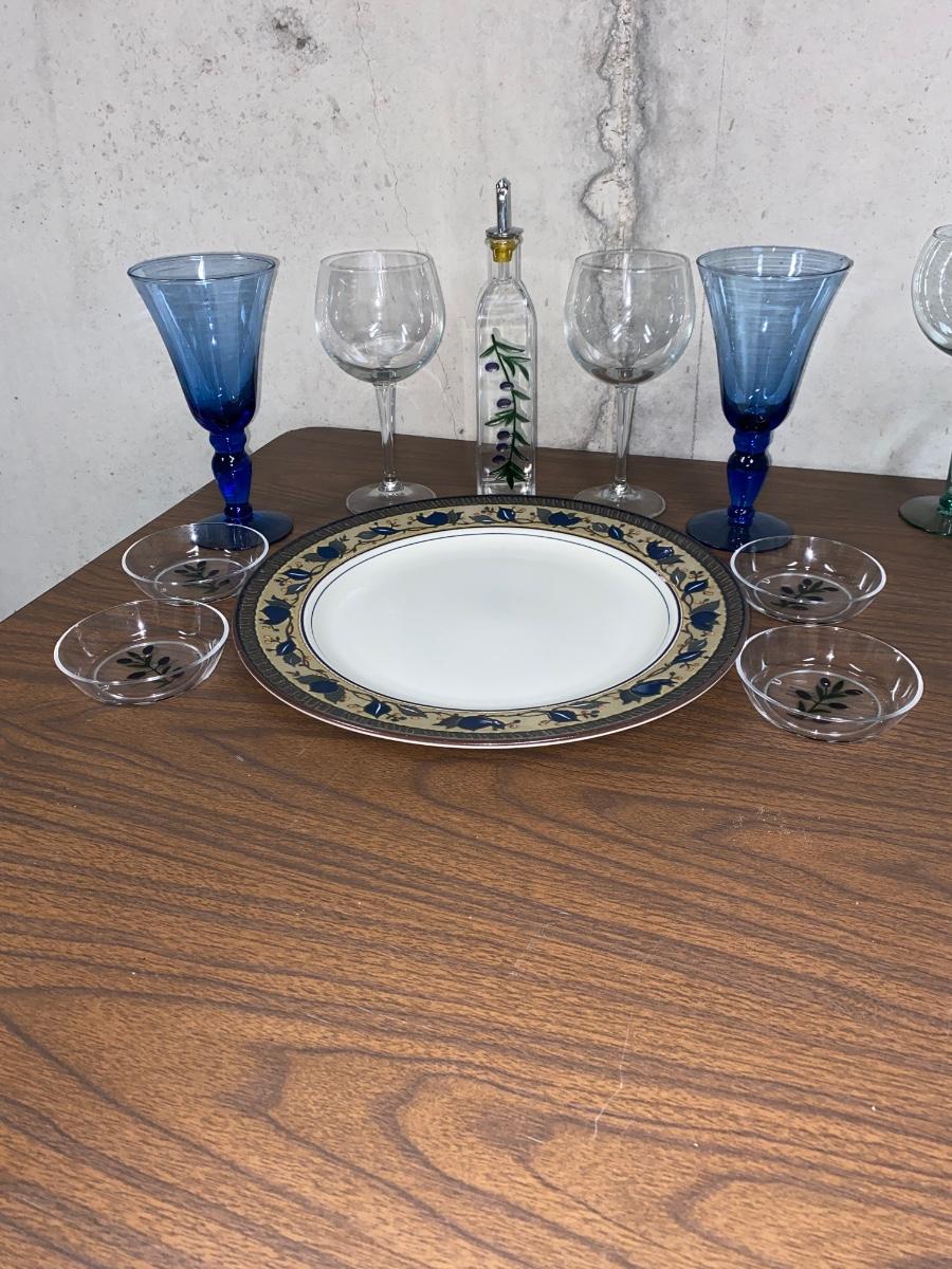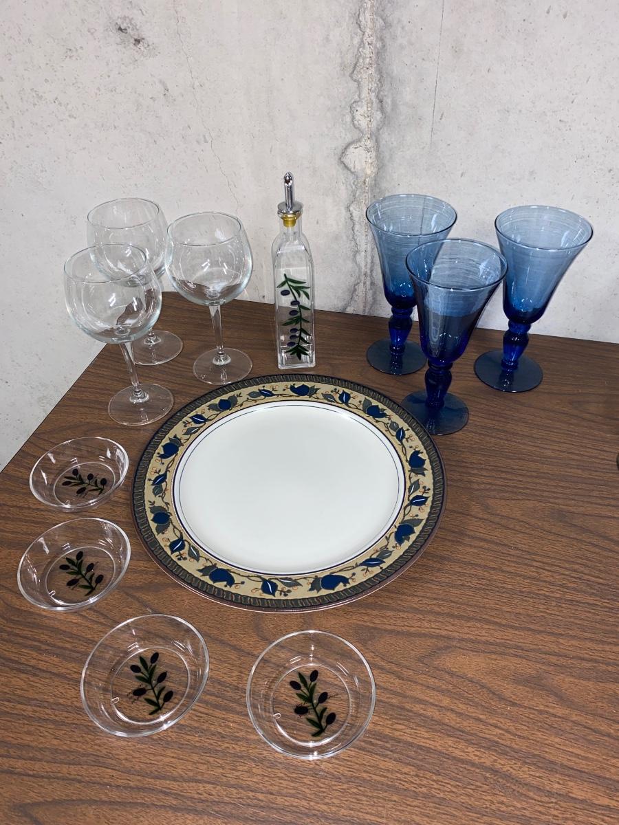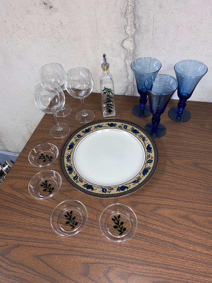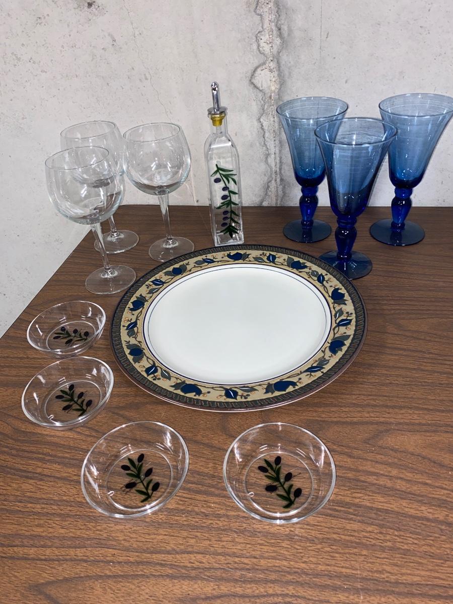 MIKASA SERVING PLATTER, FINGER DISHES AND WINE GLASSES.