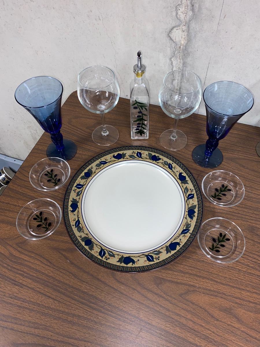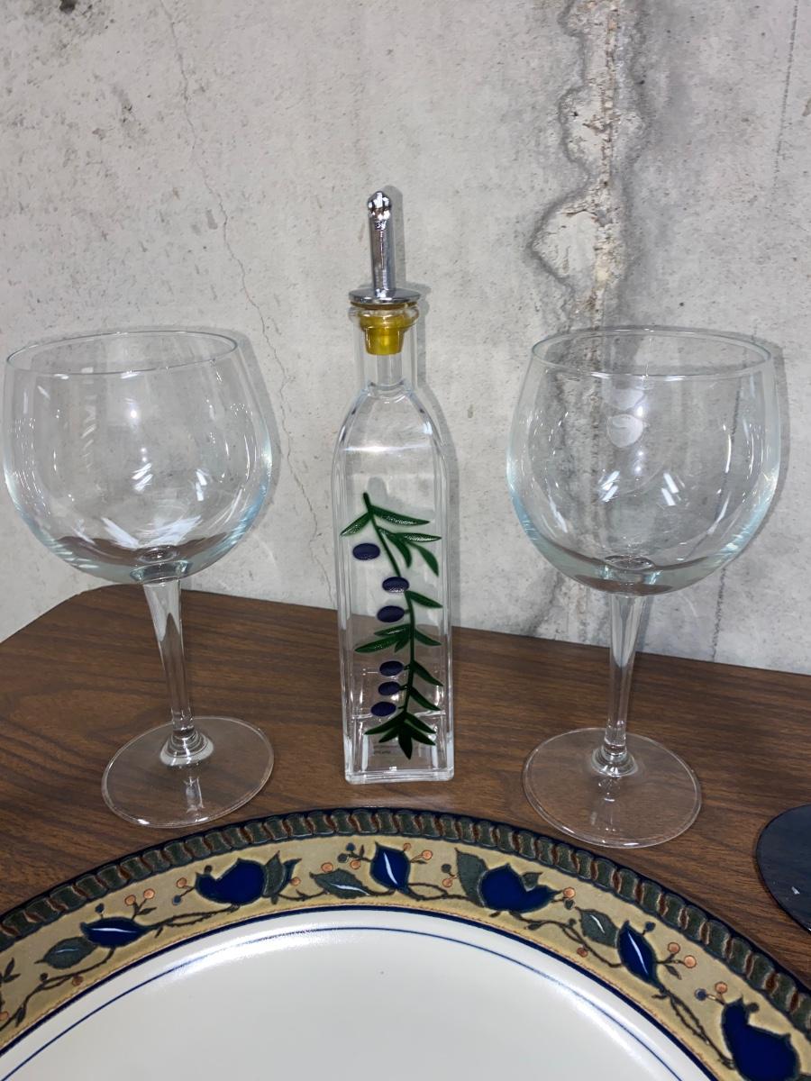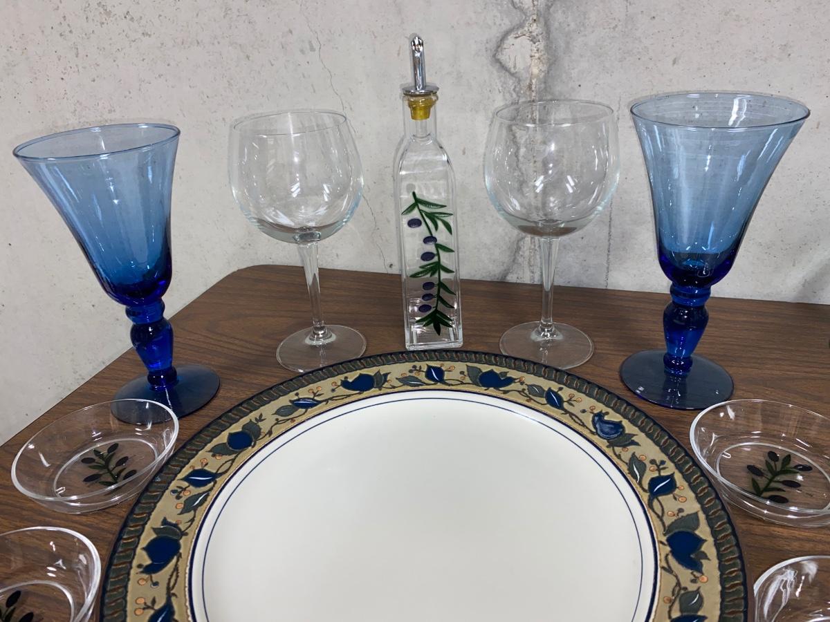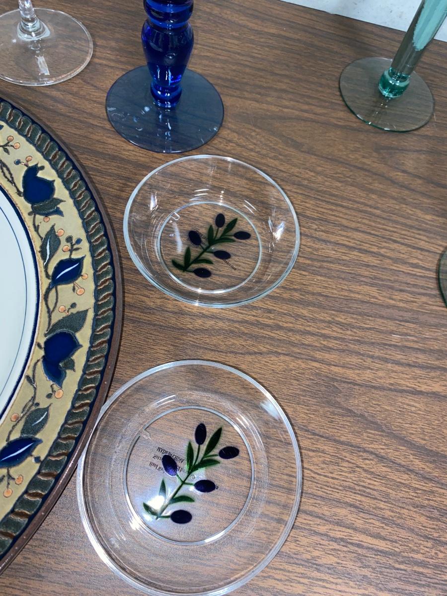 MIKASA SERVING PLATTER, FINGER DISHES AND WINE GLASSES.