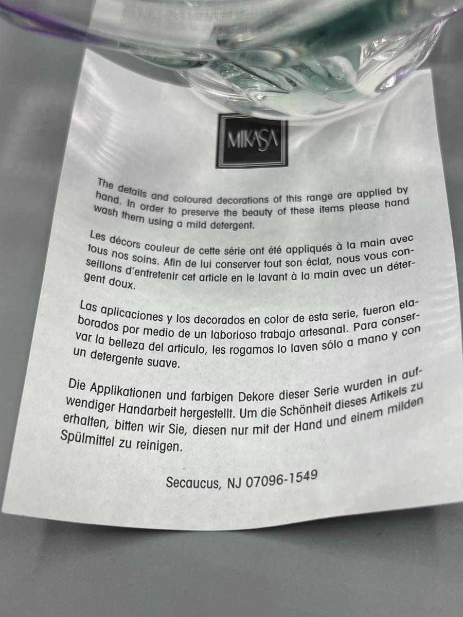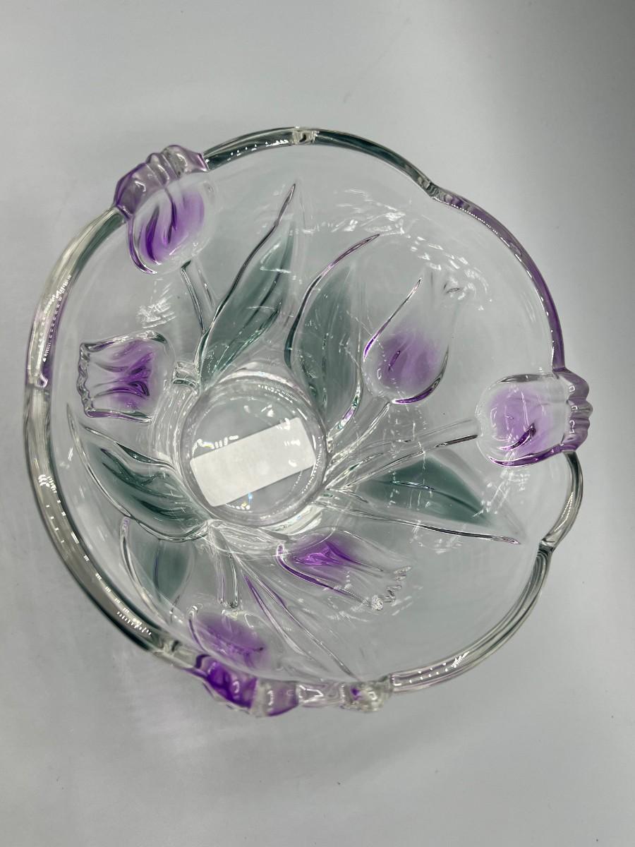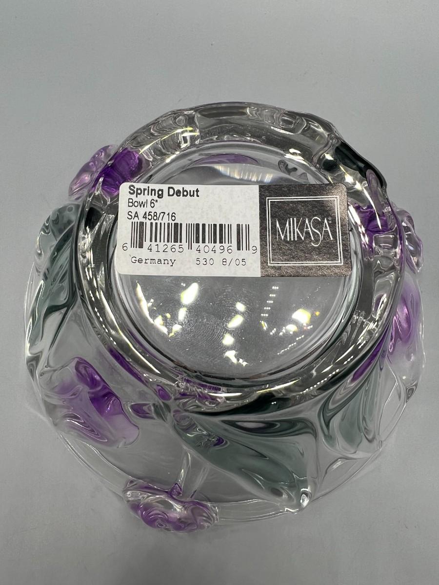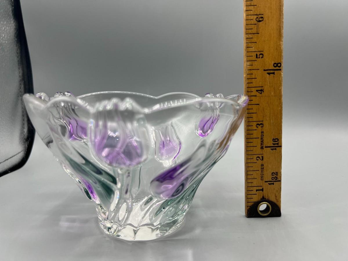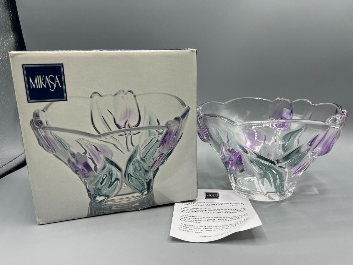 Mikasa Spring Debut Purple Tulips Thick Crystal Glass Bowl, there is no significant damage to the bowl and is in good displayable condition. Check pictures for more details and for sizing. Comes with original box, check pictures for more details and for sizing.