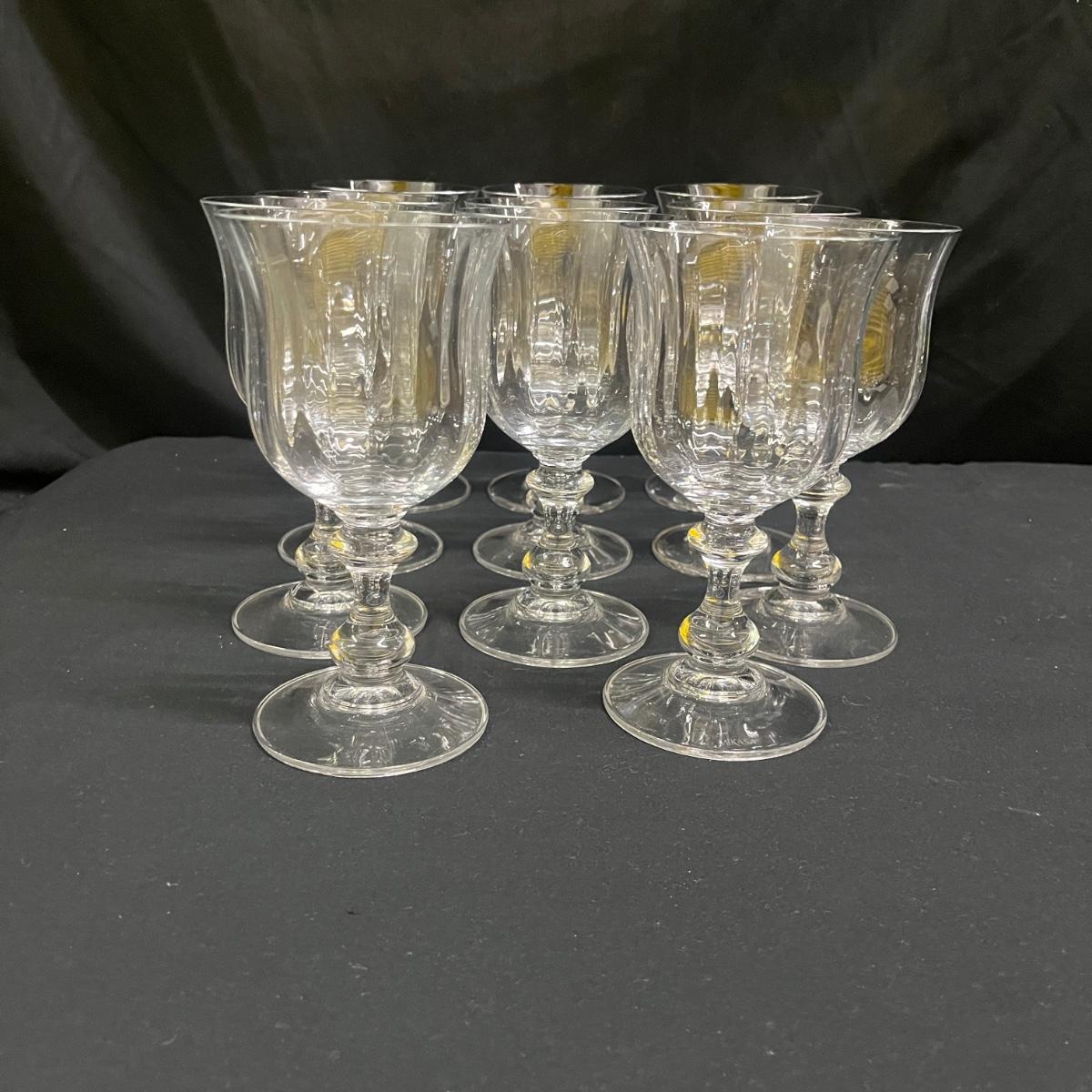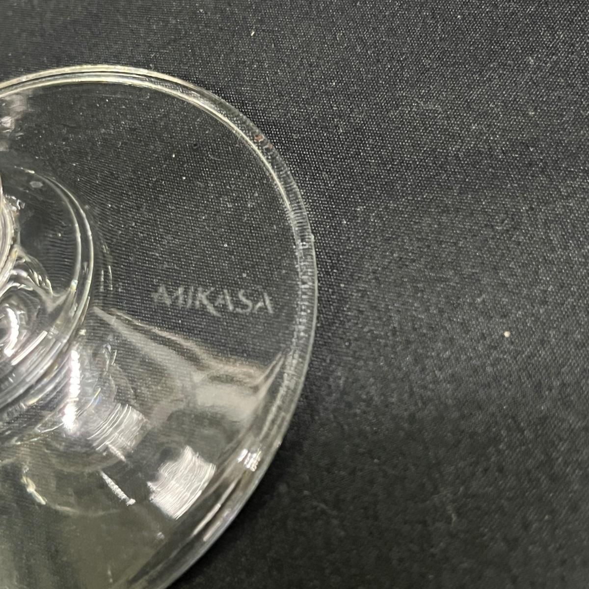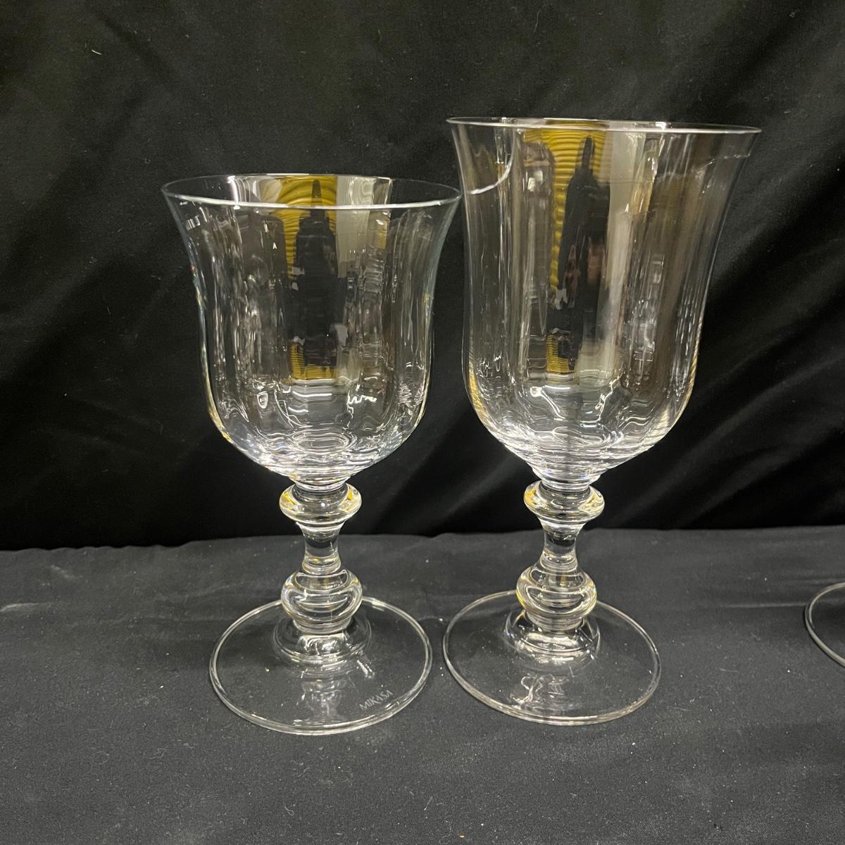 Lot includes 14 glasses that are marked Mikasa and appear to be the French Countryside style. There are 11 glasses that measure 3.5”D x 7”H and 3 taller glasses that measure 3.5”D x 7”H. Please see photos for details.