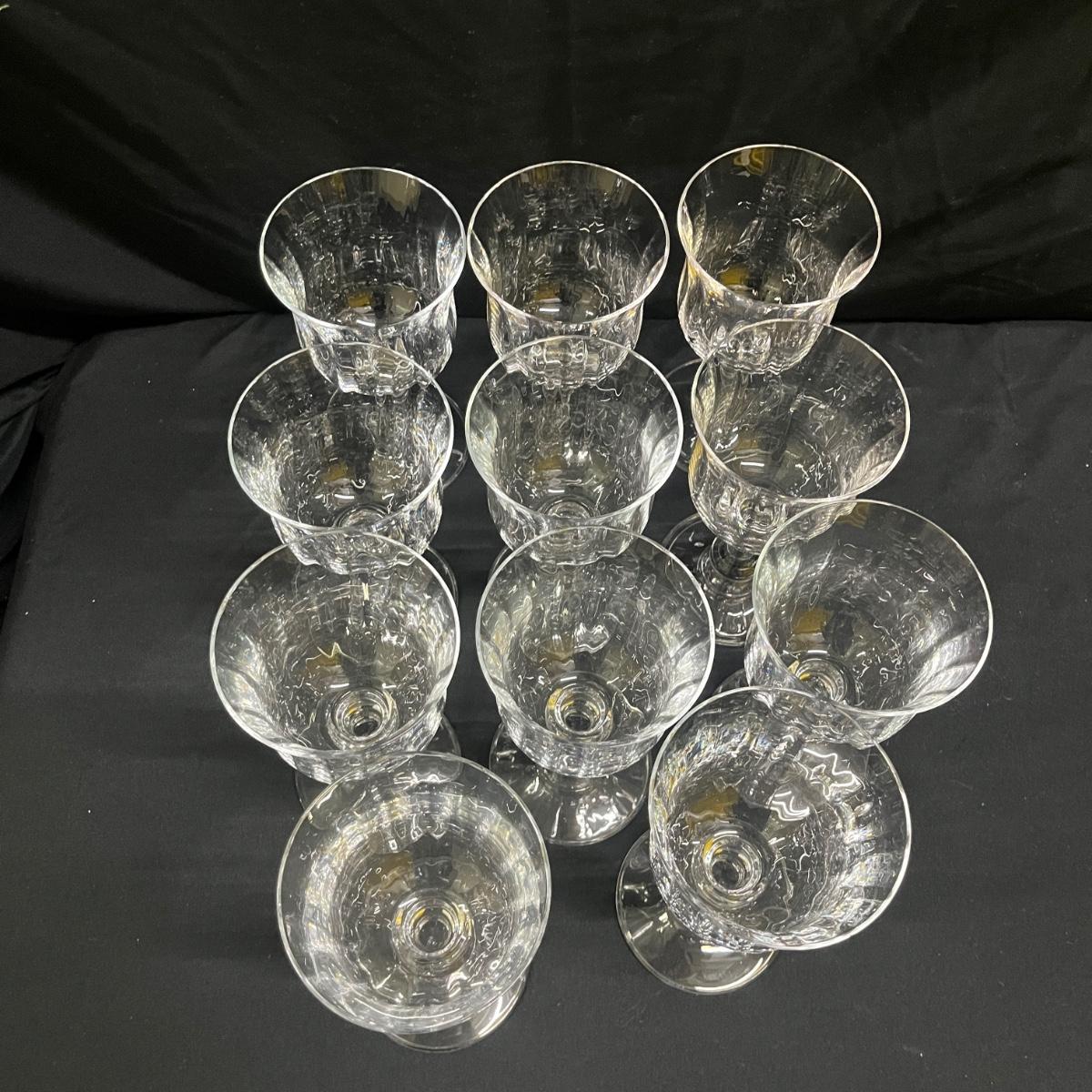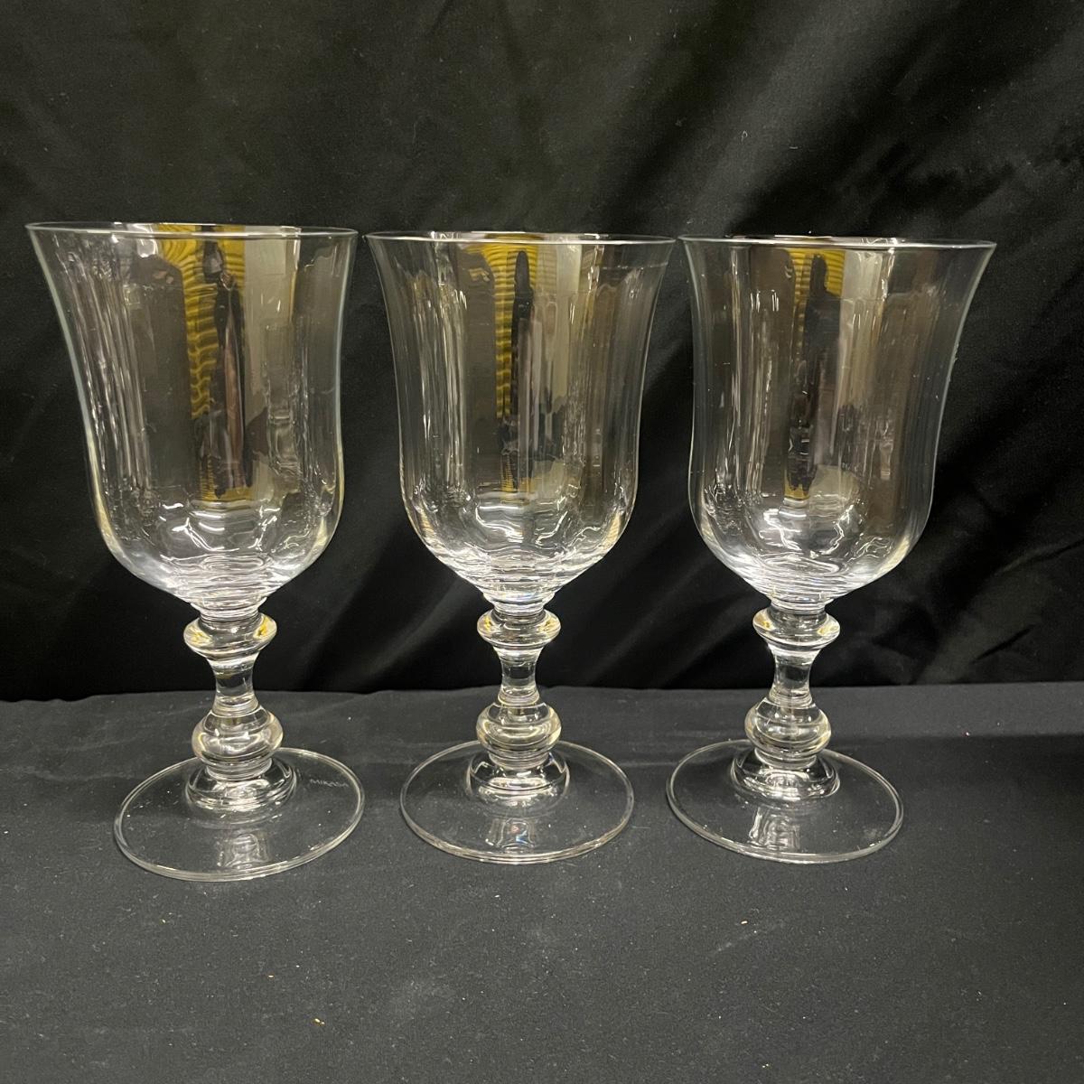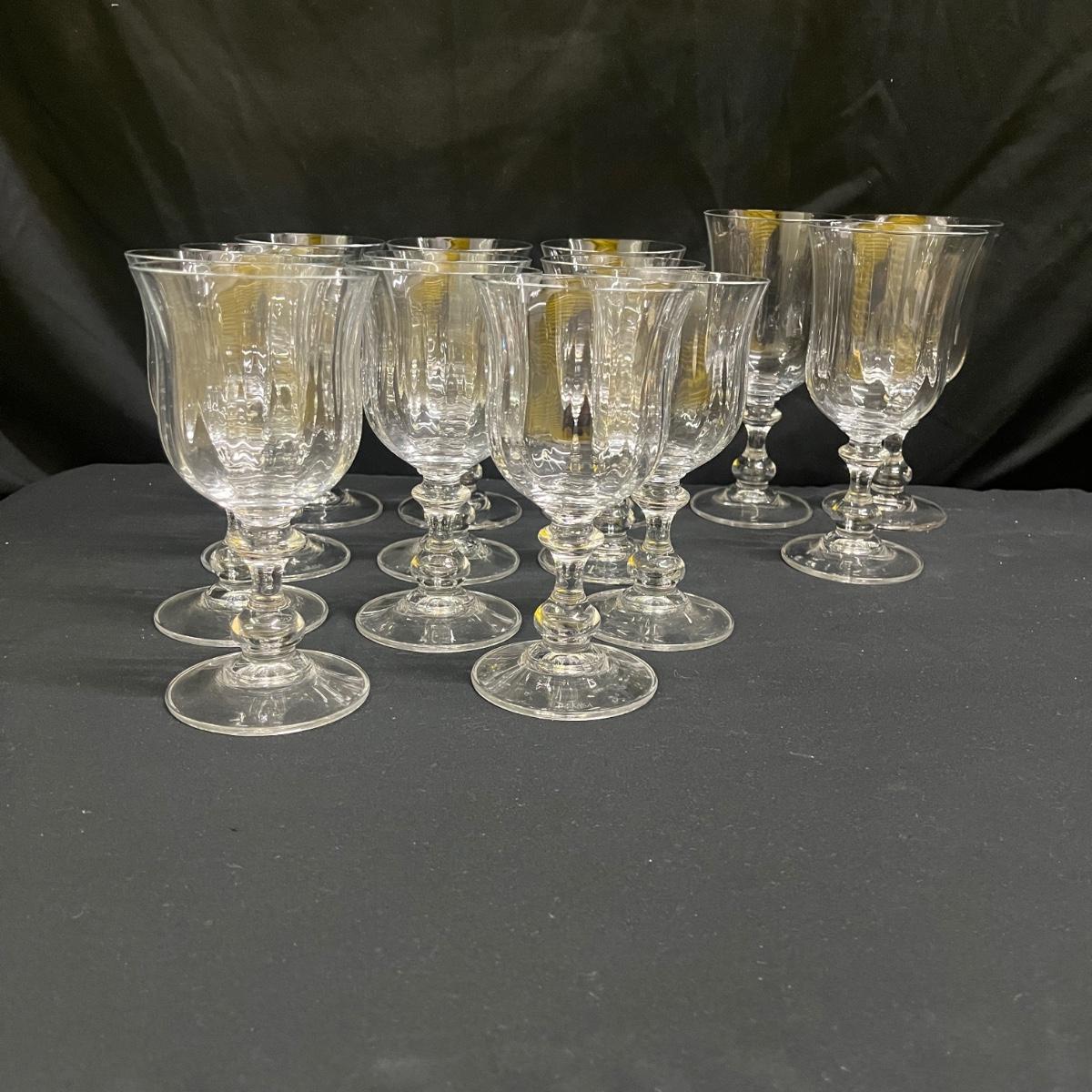 Lot includes 14 glasses that are marked Mikasa and appear to be the French Countryside style. There are 11 glasses that measure 3.5”D x 7”H and 3 taller glasses that measure 3.5”D x 7”H. Please see photos for details.
