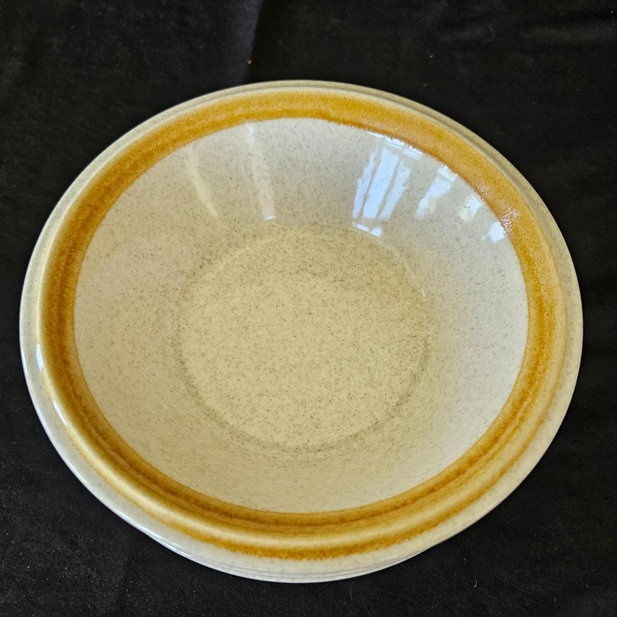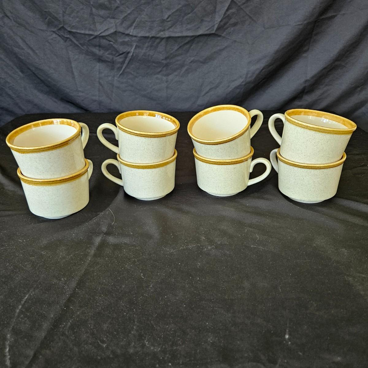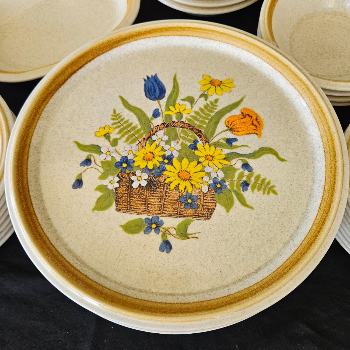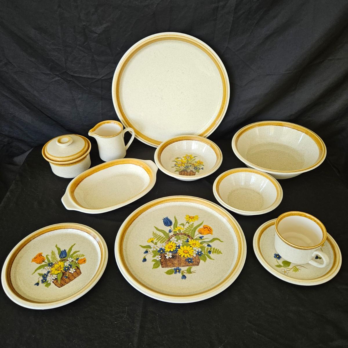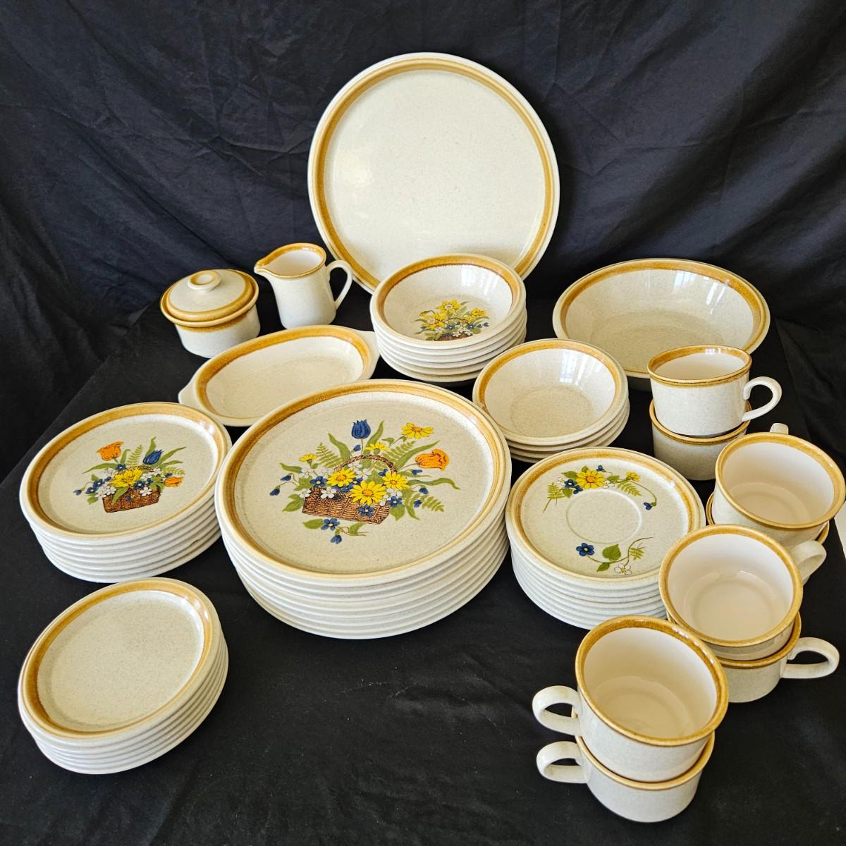 A collection of Mikasa Stone Manor stoneware that includes a 12.5"D serving plate, a serving bowl, a lidded bowl and a creamer. It also includes 8 dinner plates, 7 salad plates, 6 salad bowls, 4 desert bowls, 5 bread plates, 8 saucers and 8 coffee cups. Shipping available
