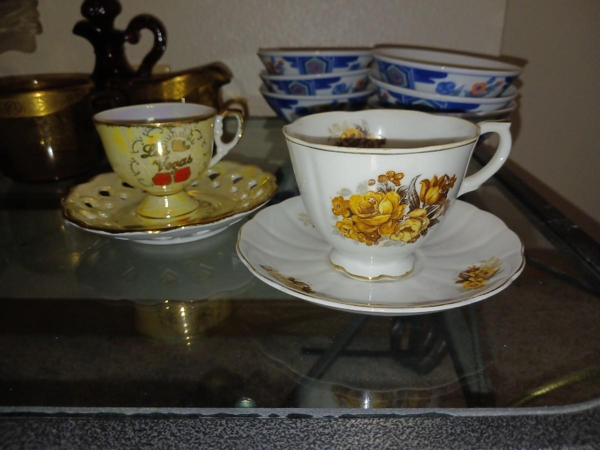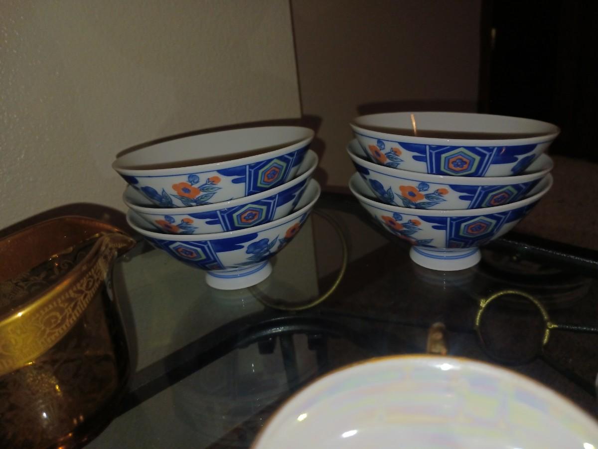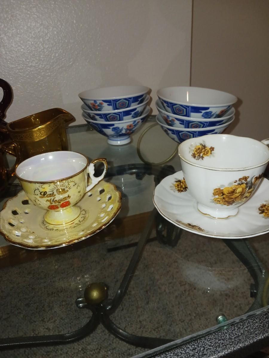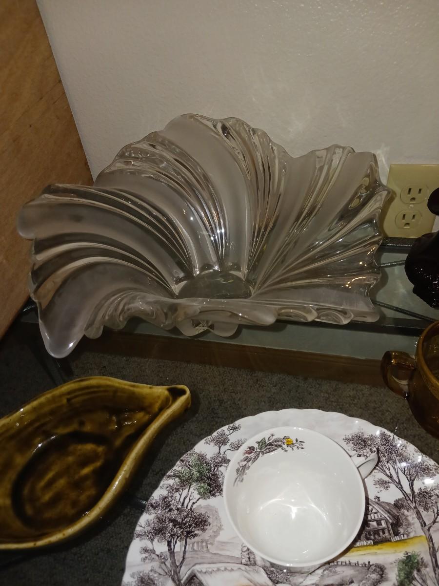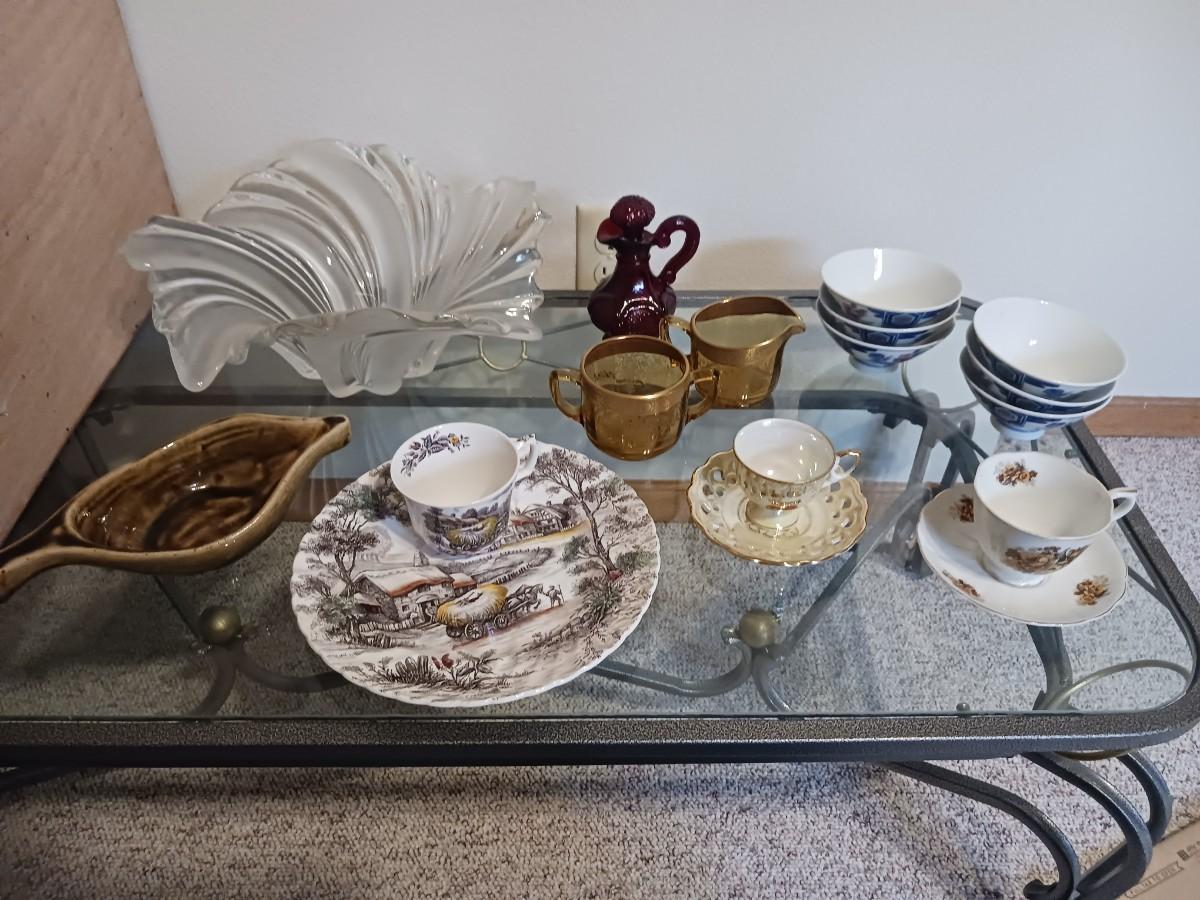MIKASA "SWING" CRYSTAL BOWL, CRUET, TEA CUPS AND SAUCERS AND MORE