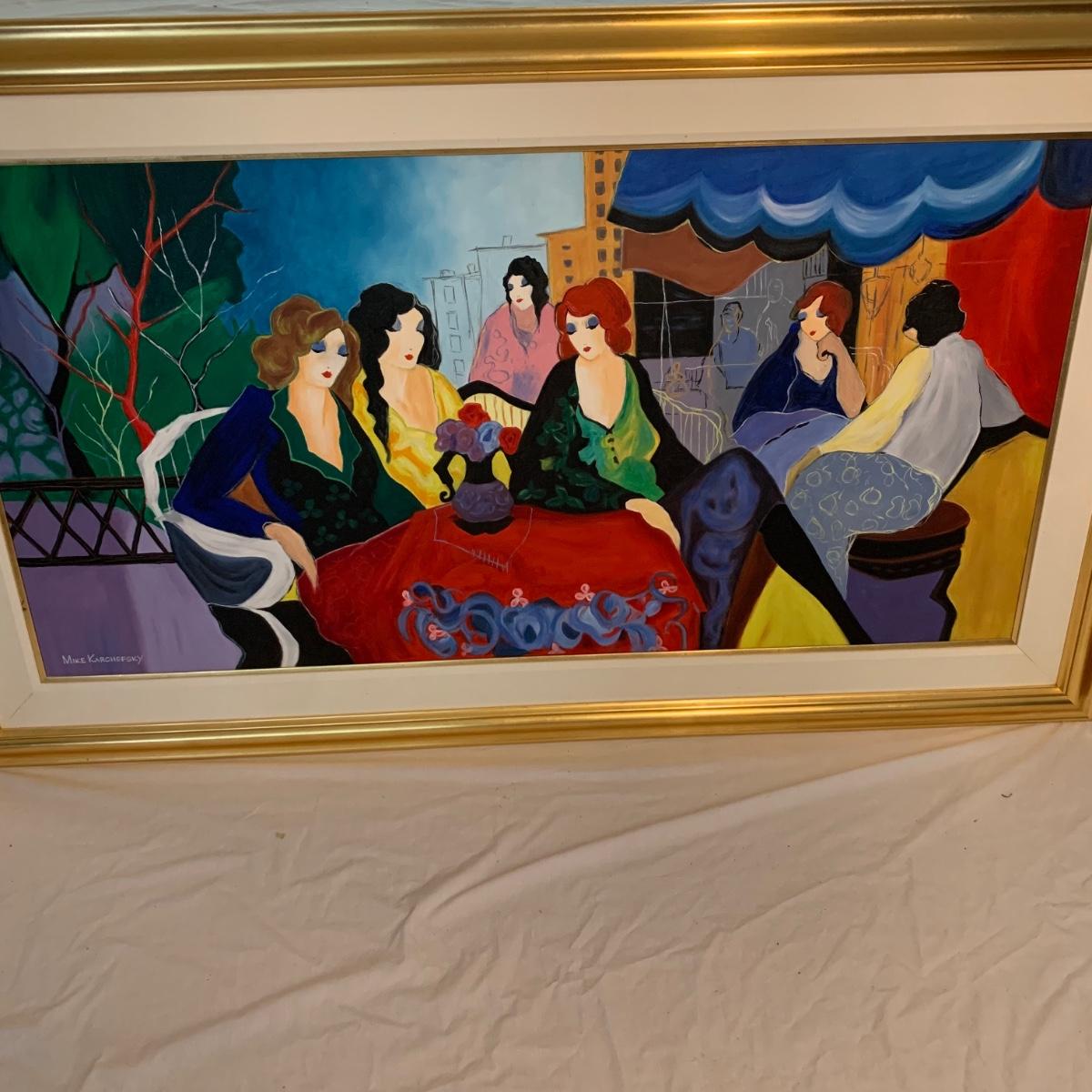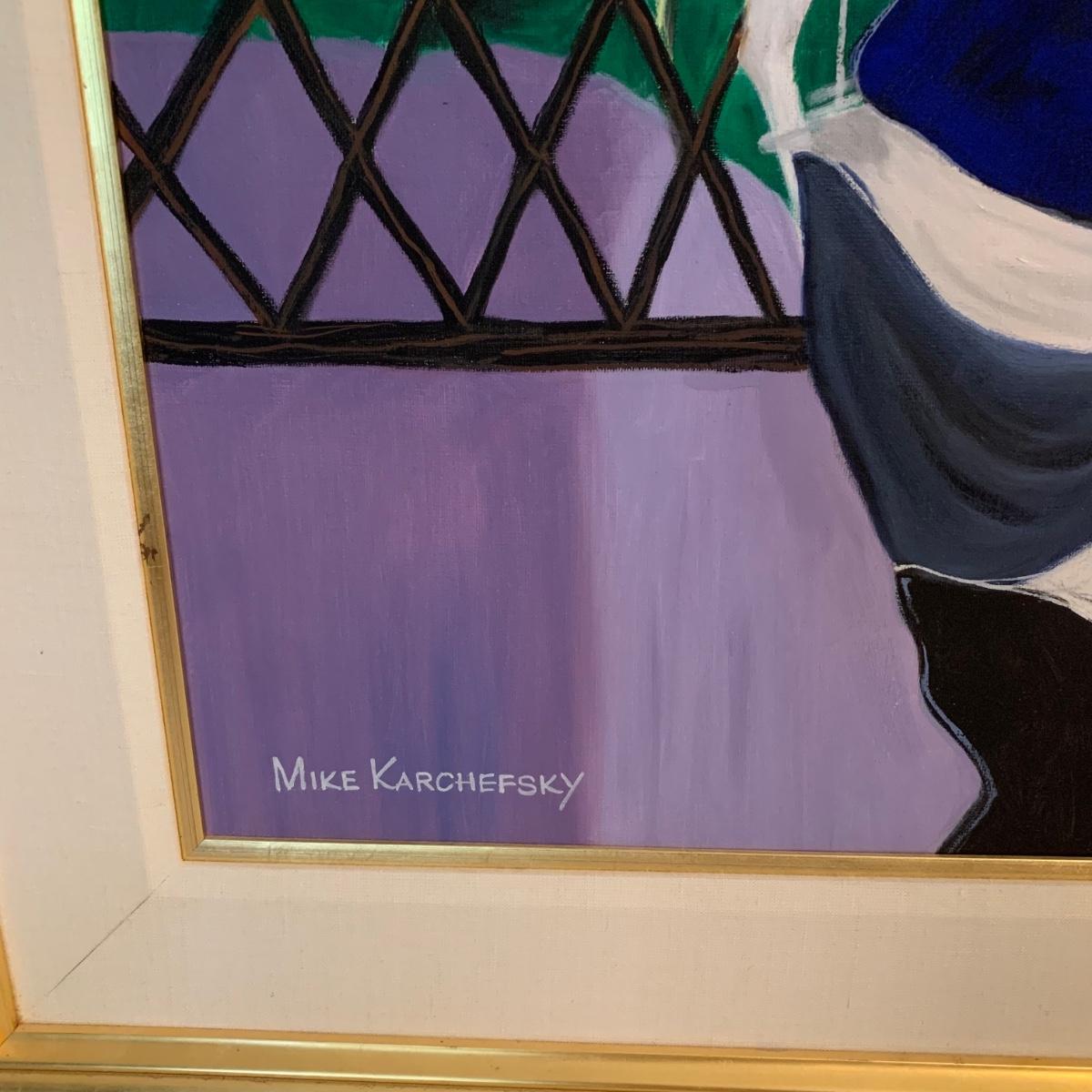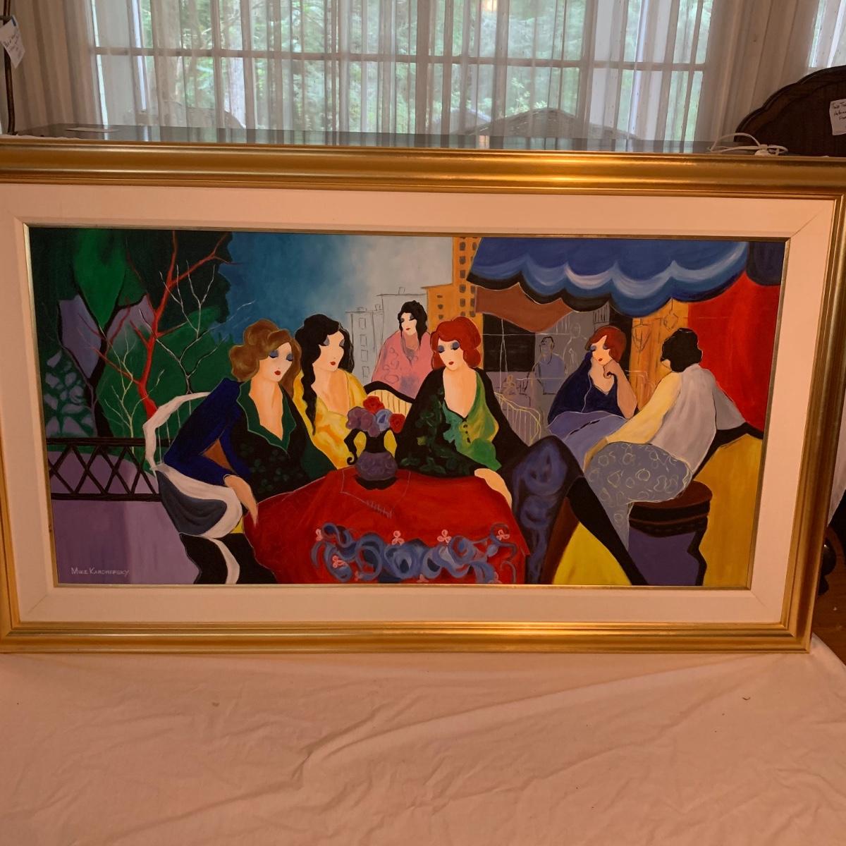 Included in this lot is one very large signed painted canvas art piece. The piece appears to be signed by artist Mike Karchefsky. The work is matted and framed. The frame measures about 68in x 40in. Local pickup only.