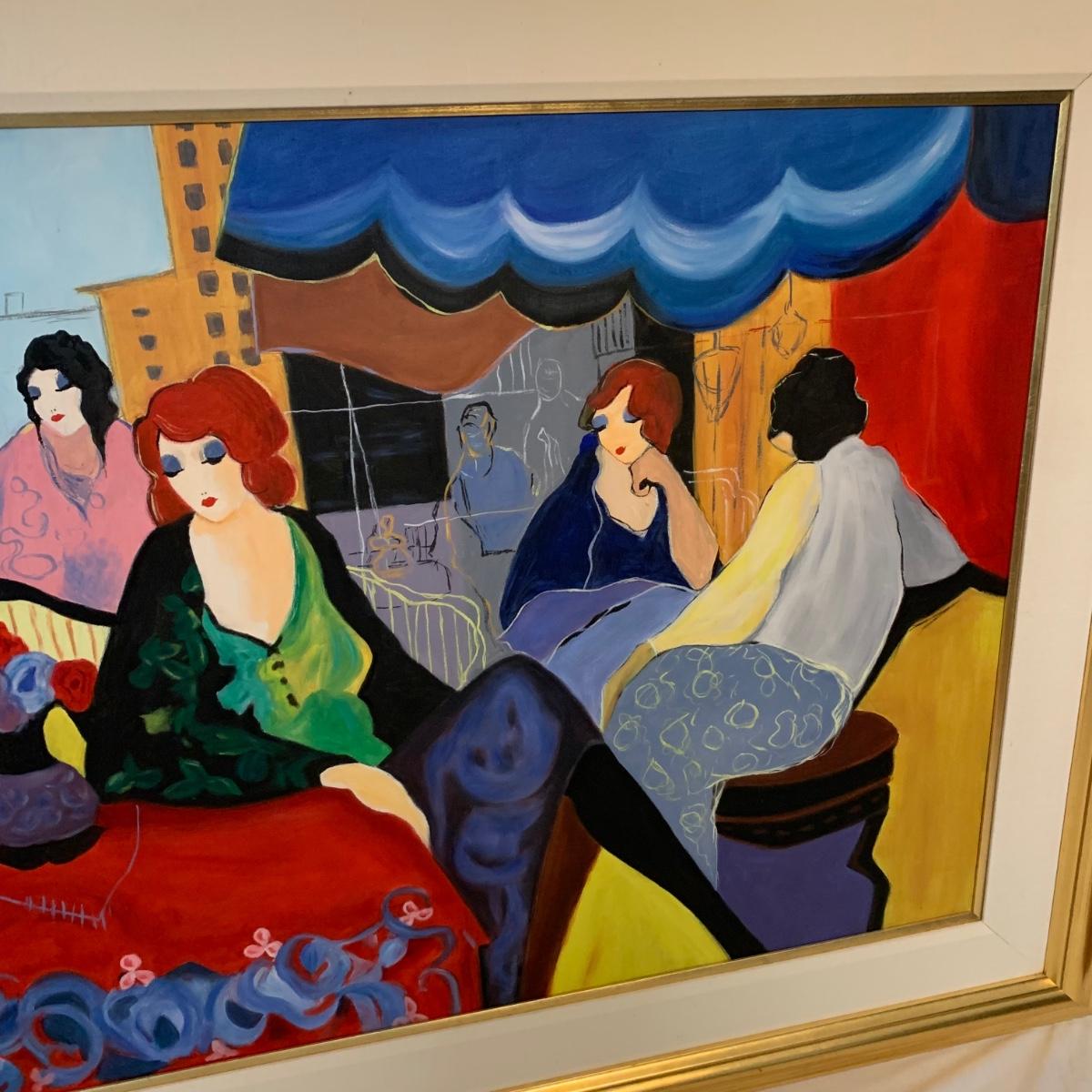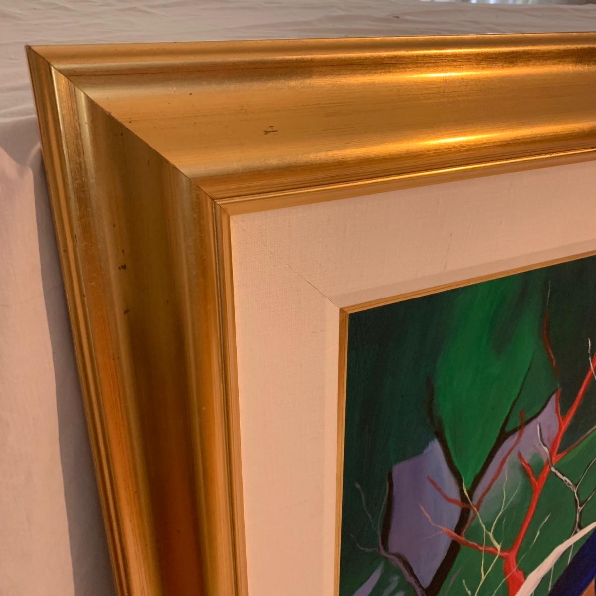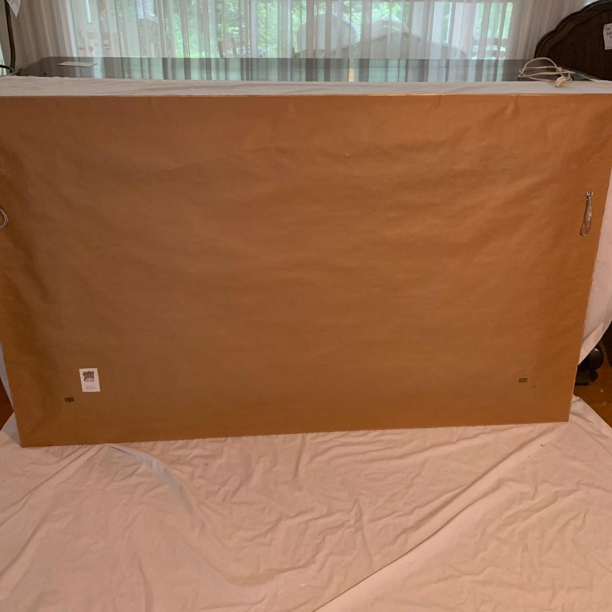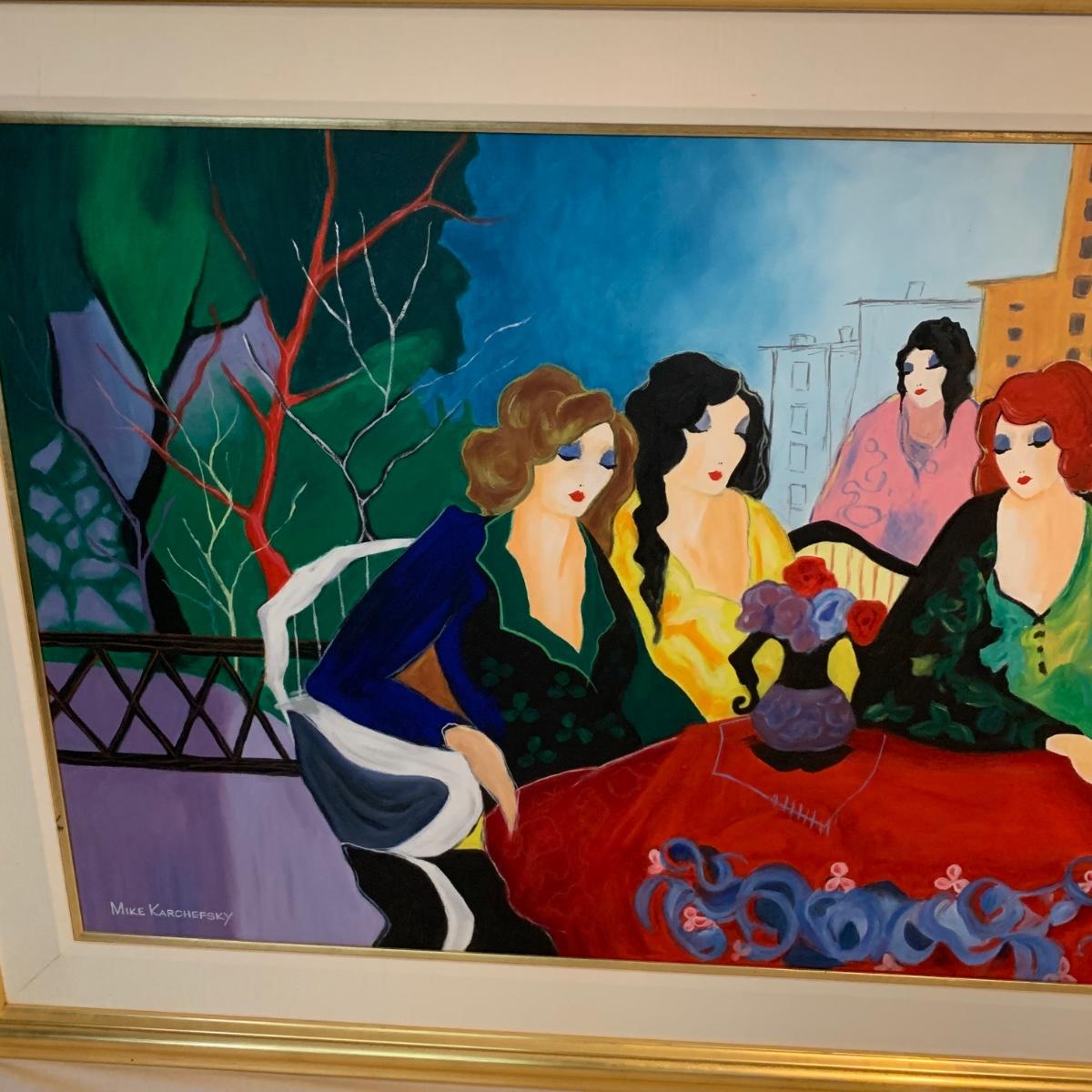 Included in this lot is one very large signed painted canvas art piece. The piece appears to be signed by artist Mike Karchefsky. The work is matted and framed. The frame measures about 68in x 40in. Local pickup only.