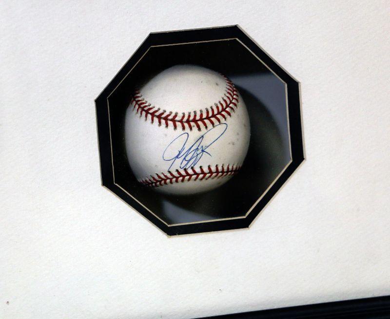 Hand signed baseball without COA plus 8" x 9.5" photograph framed into display shadow box frame, frame is 24" x 13-3/4" x 4" with glass front, frame show some wear on the sides, photograph and baseball in great condition - Collector's Item!