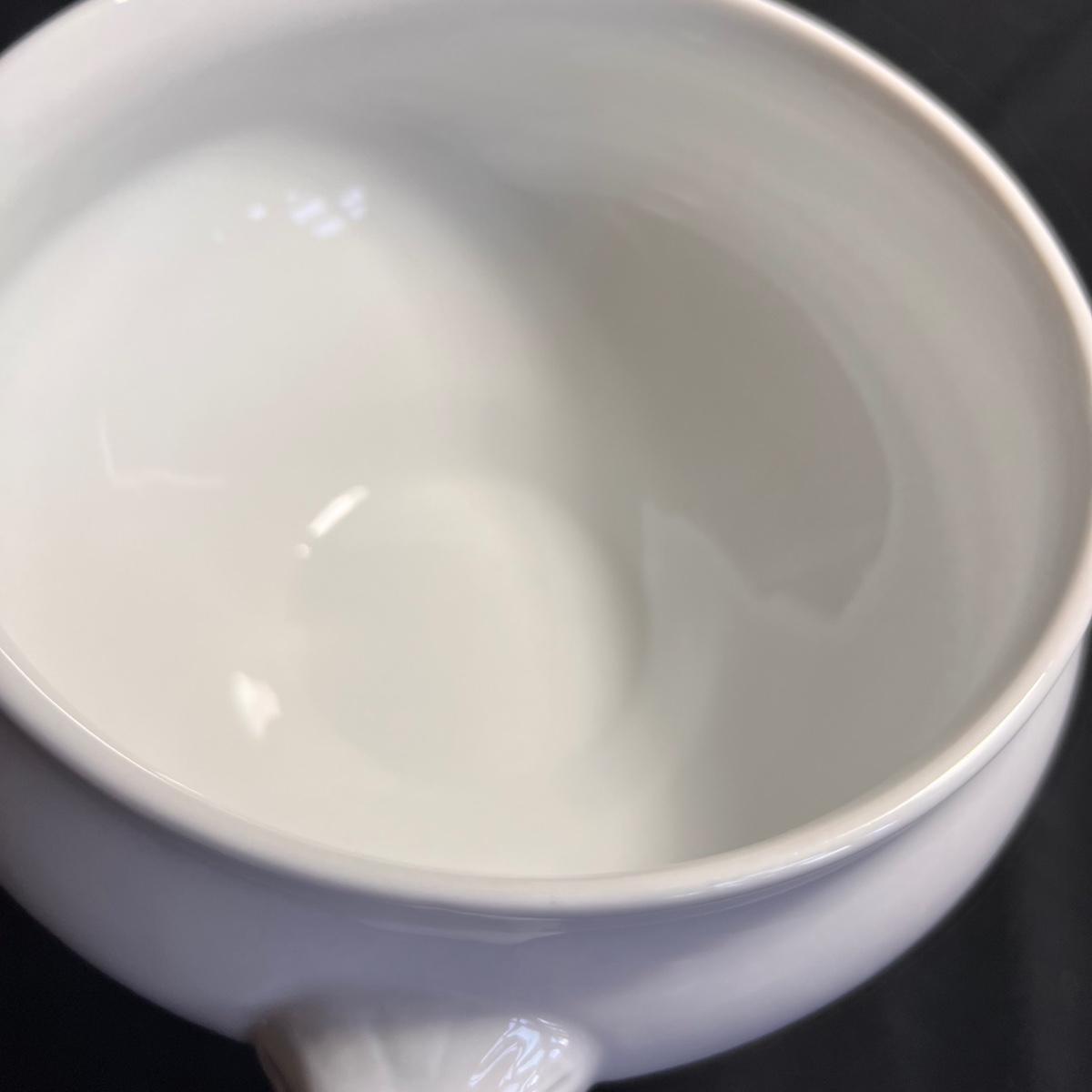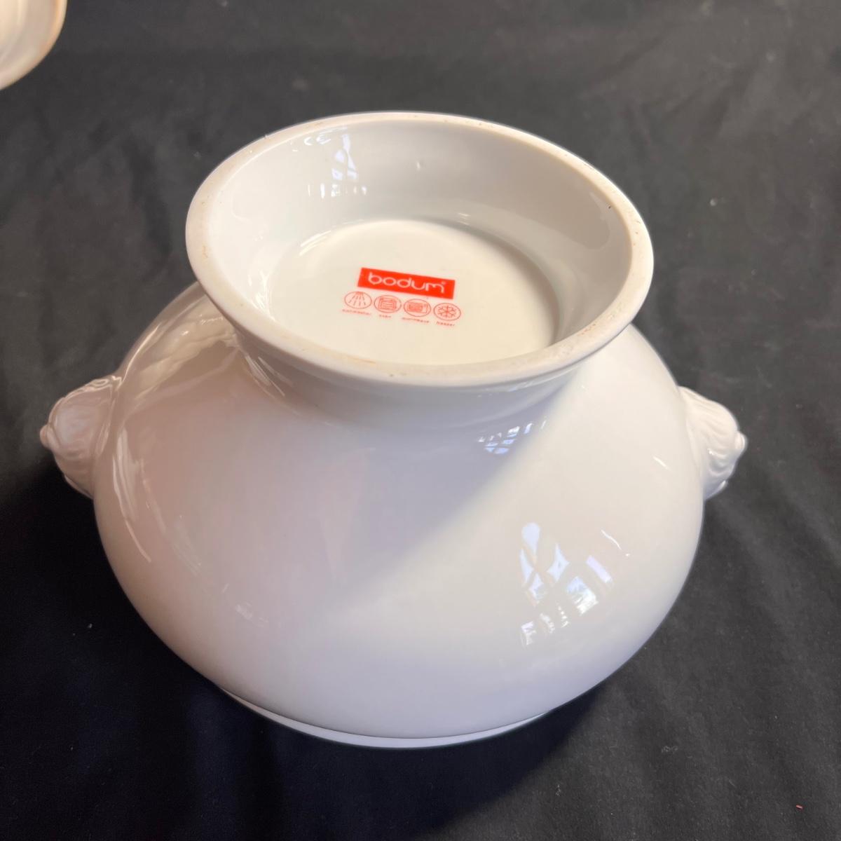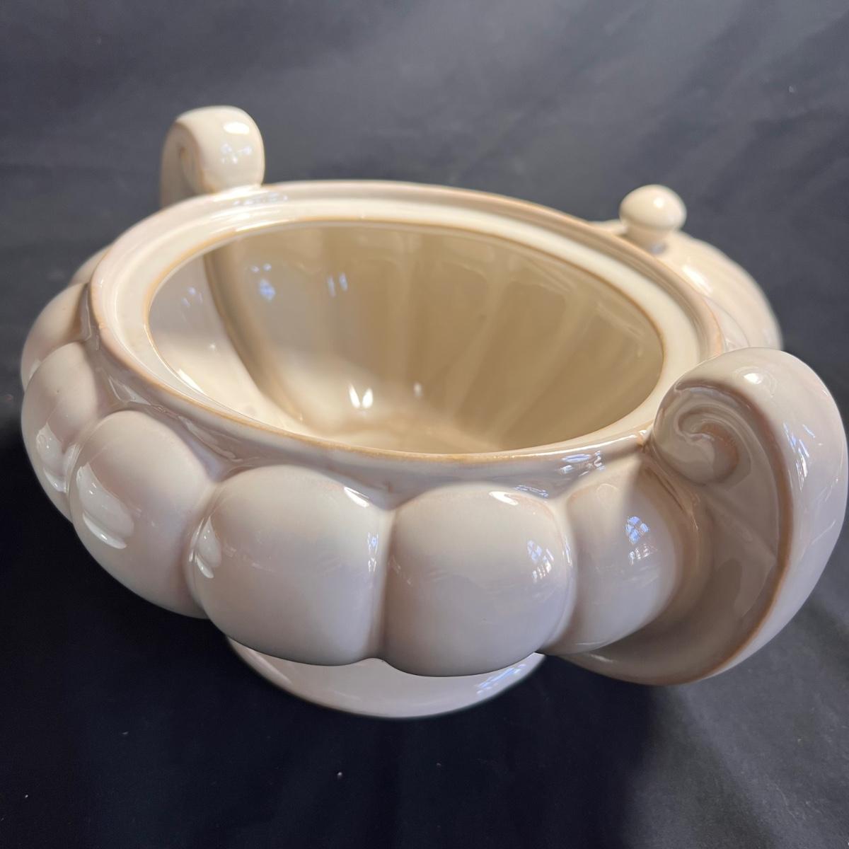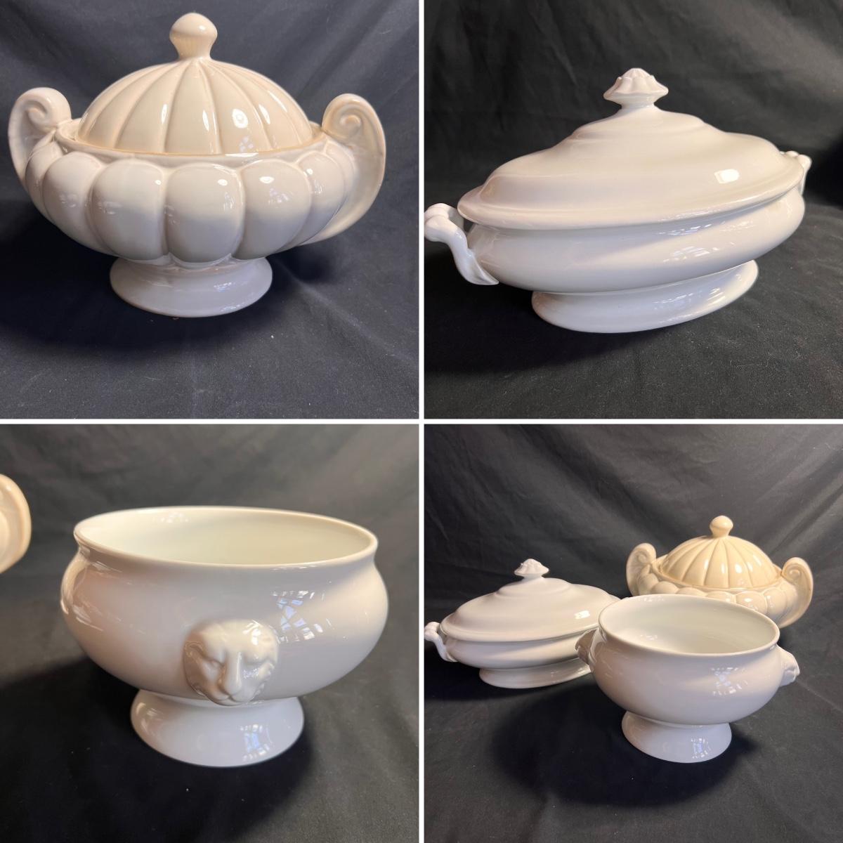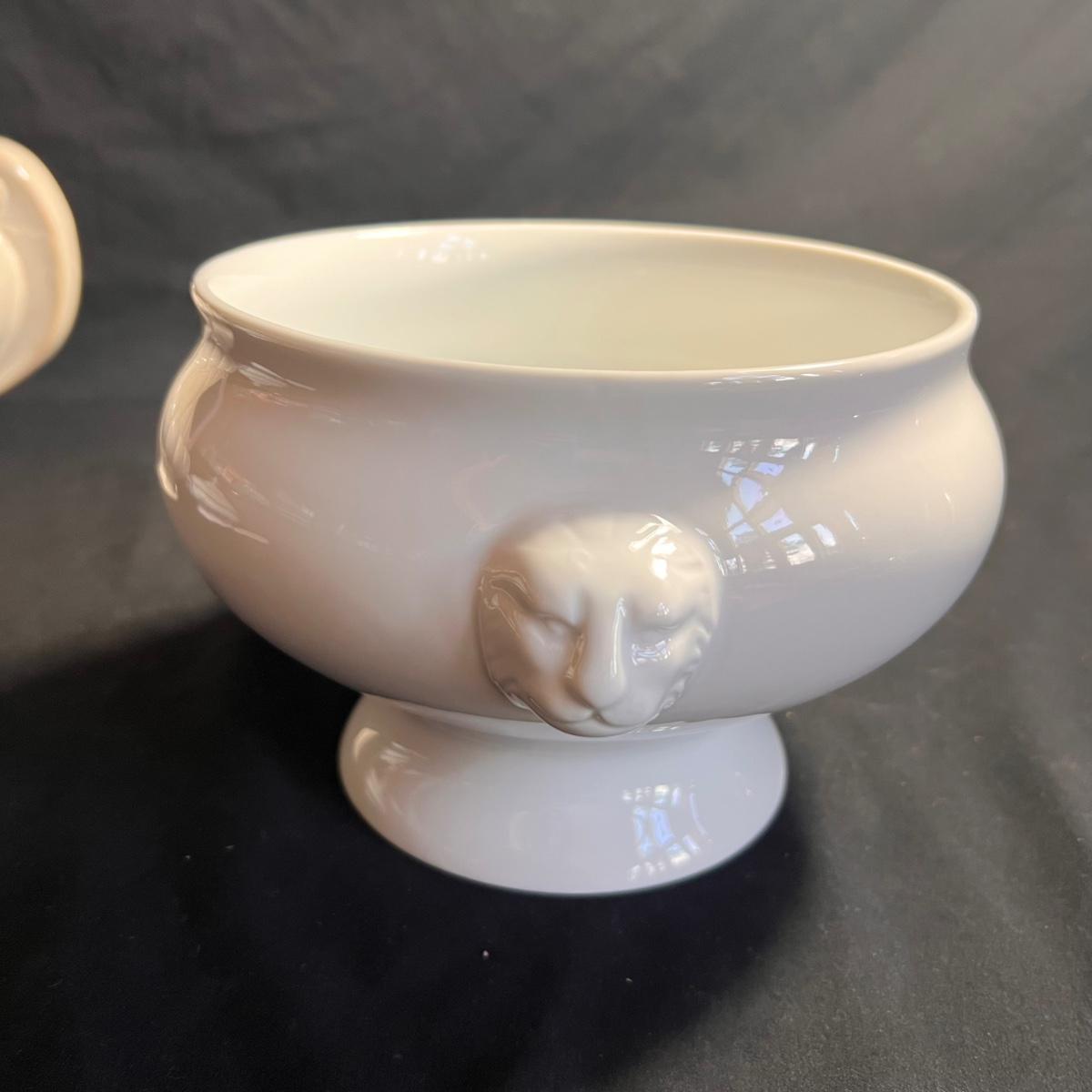 Three ceramic pieces includes two lidded tureens and a pedestal bowl with lion heads.