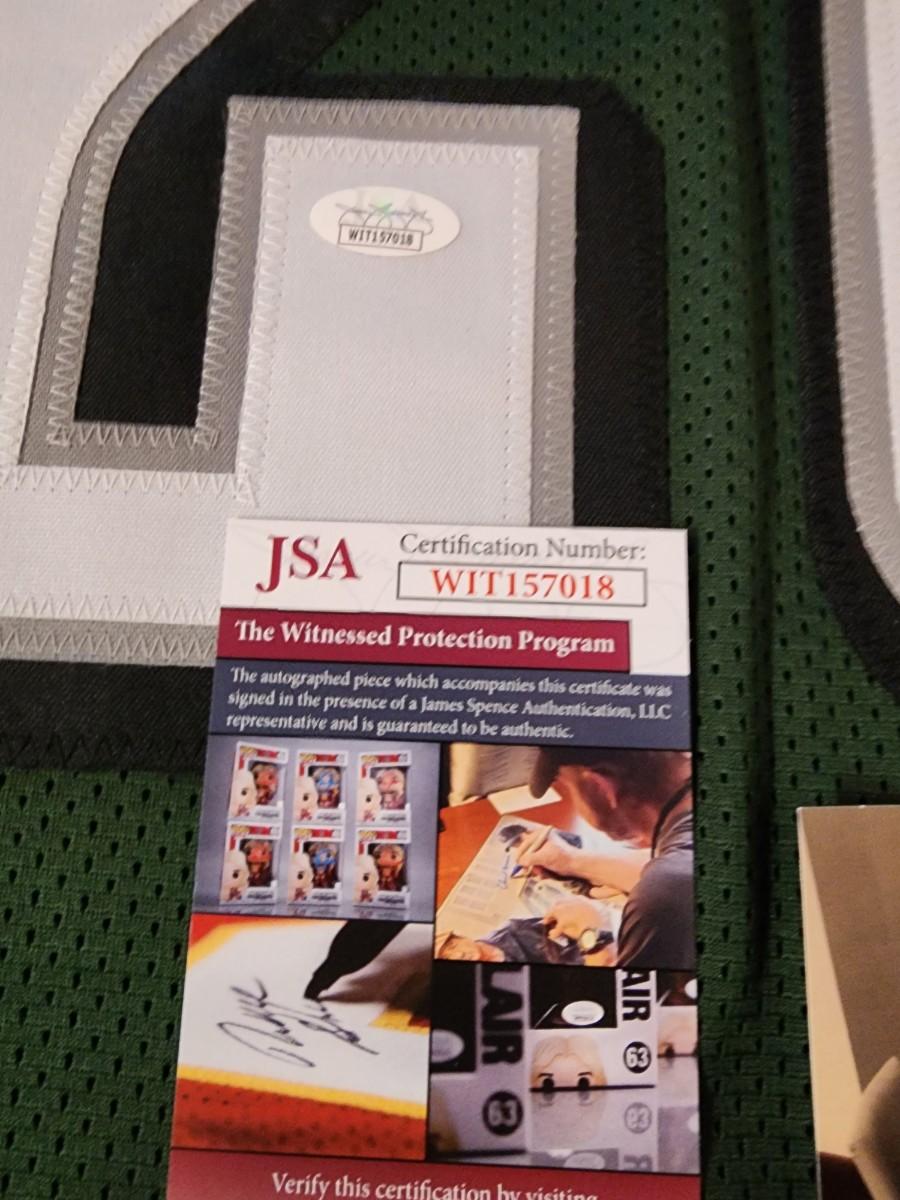 The product is a signed Miles Sanders Philadelphia Eagles jersey with authentication from James Spence Authentication (JSA). This original autographed jersey in size XL is a must-have for any Eagles fan looking to add a special piece to their collection. With the signature of the player and the authenticity guaranteed by JSA, this jersey is a unique and valuable item for any football enthusiast.