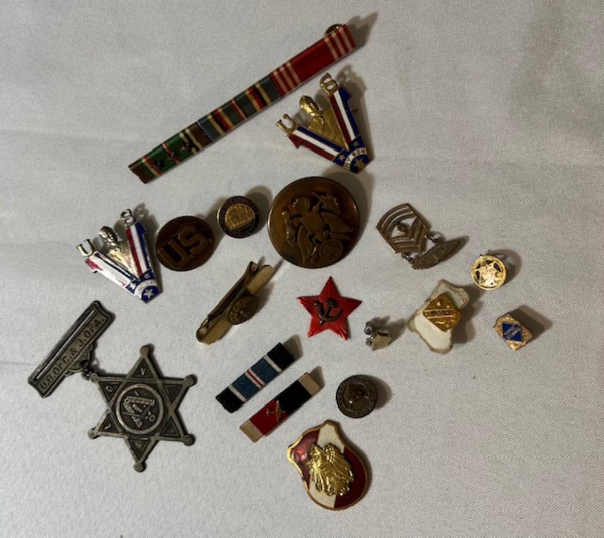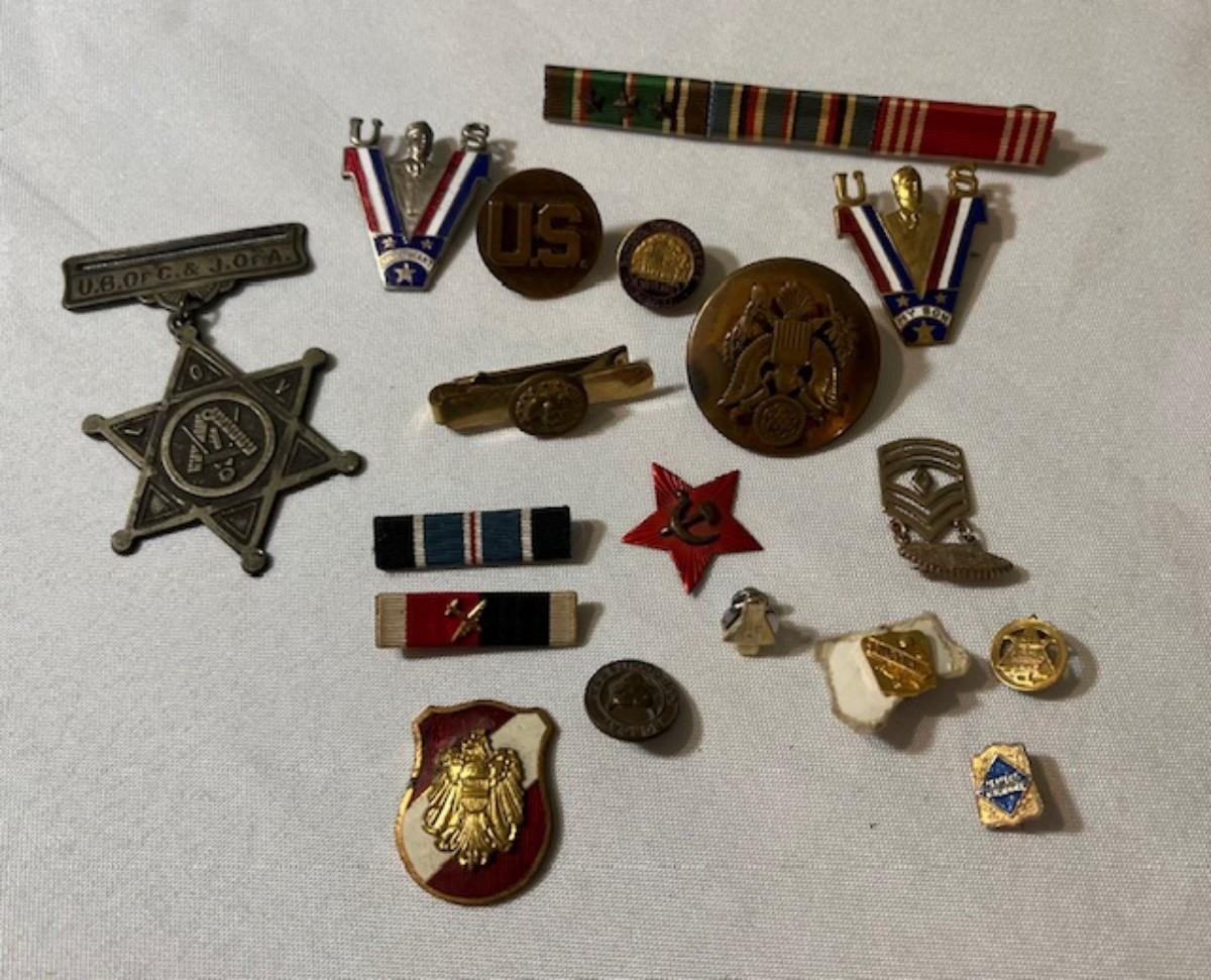 Includes U.S. military pins, a communist Russia star, a NASA tie tack, and more. Total of 18 pieces. Measurement of largest: 4.5"L.