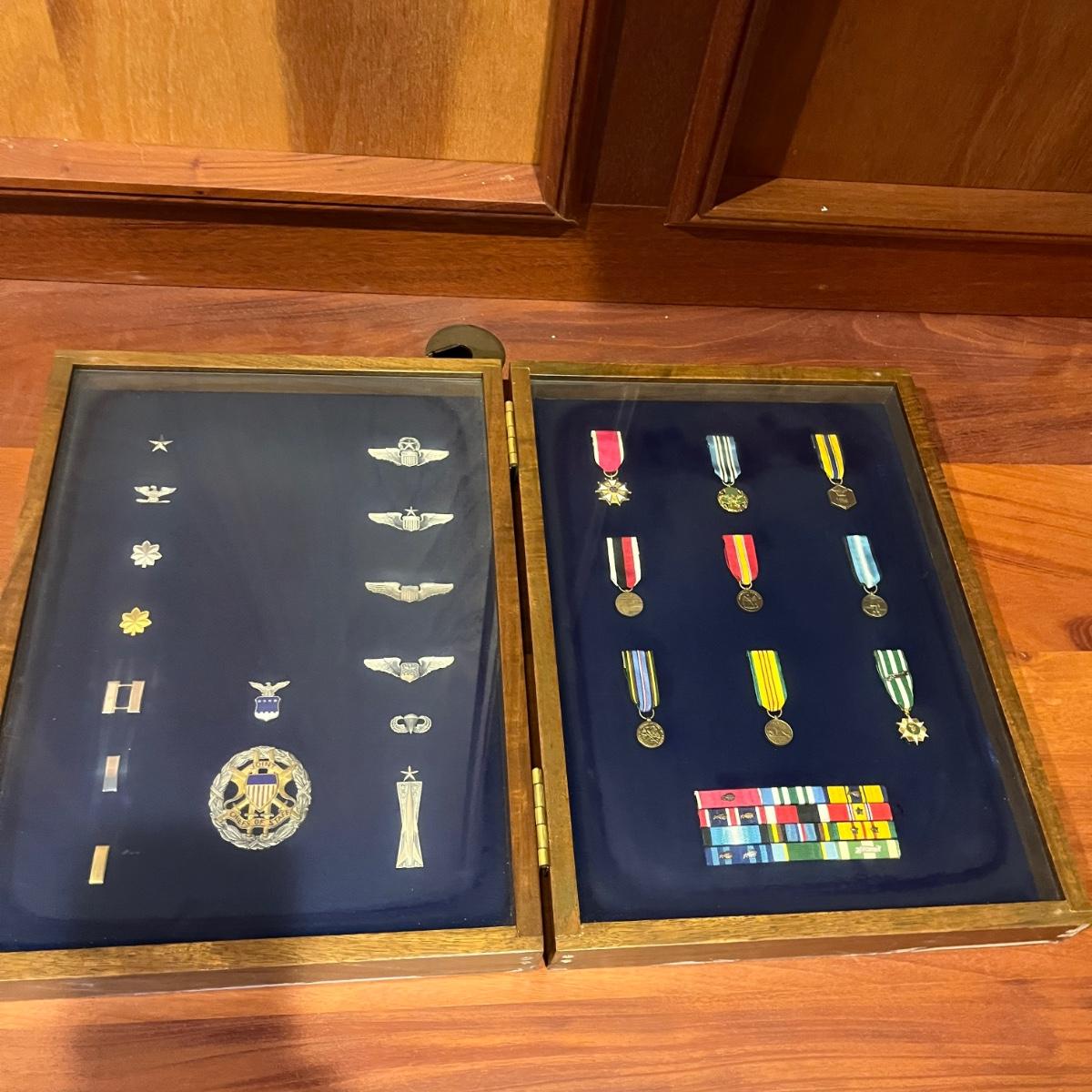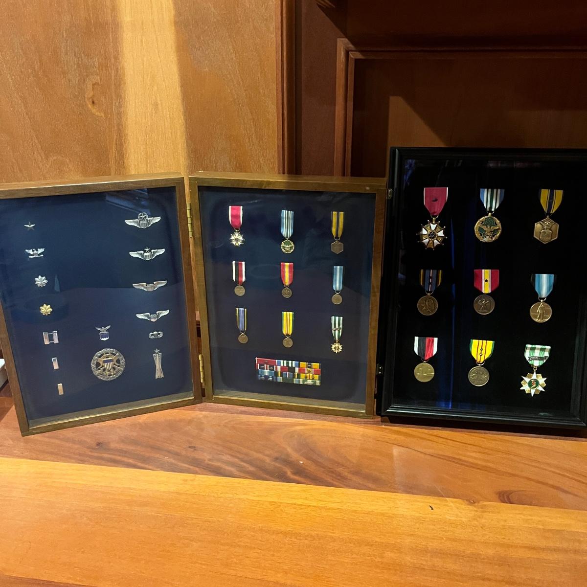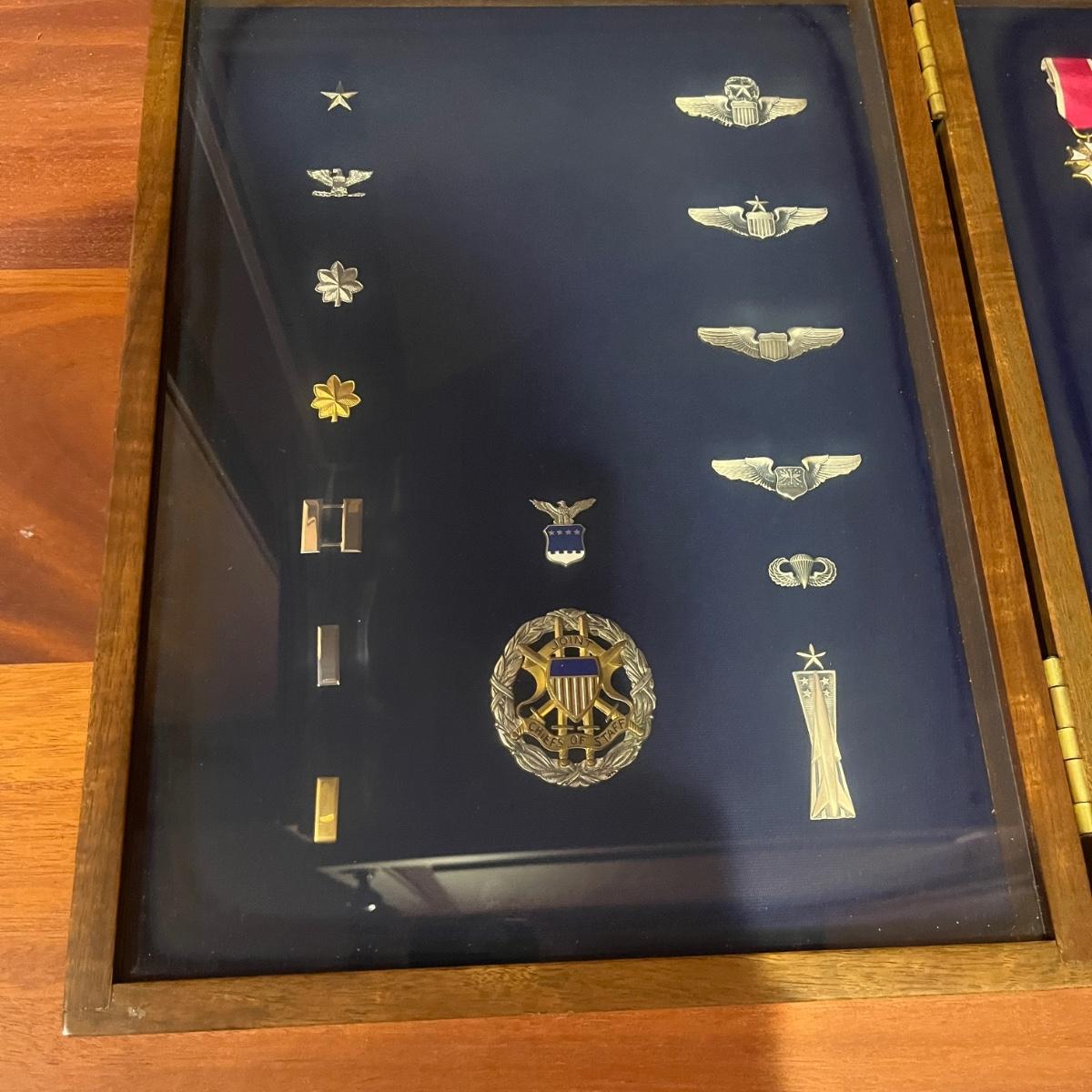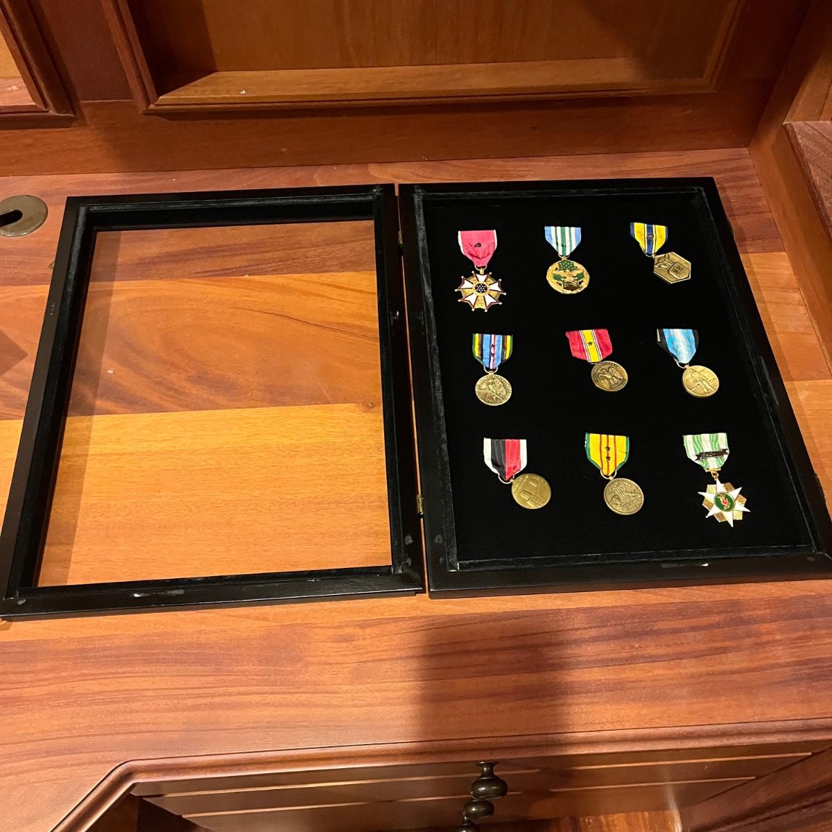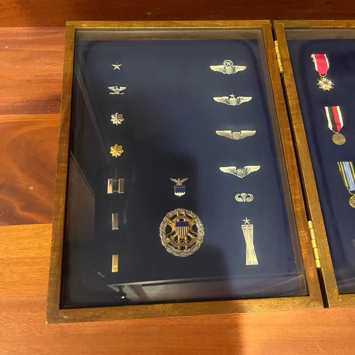 This collection of military medals, badges and pins includes Joint Chief of Staff badge, Vietnam medal, Antarctica medal and many more. All items are in wooden display frames and under glass. Folding frame measures 22.25” x 1.5” x 15”H when open and 11” x 3” x 15”H when closed.