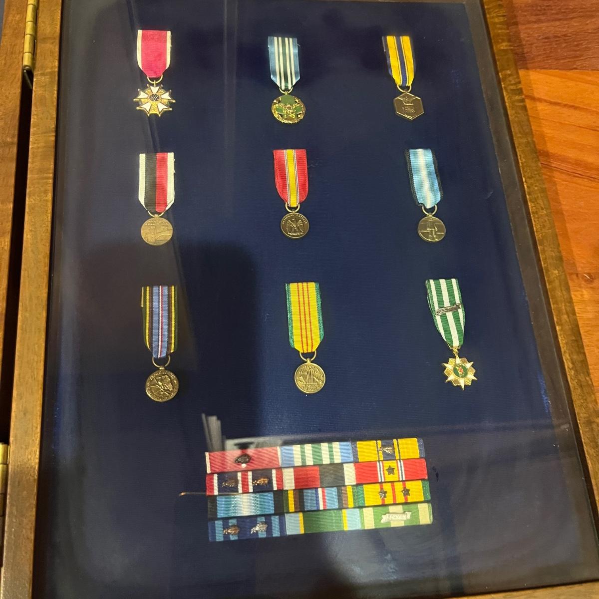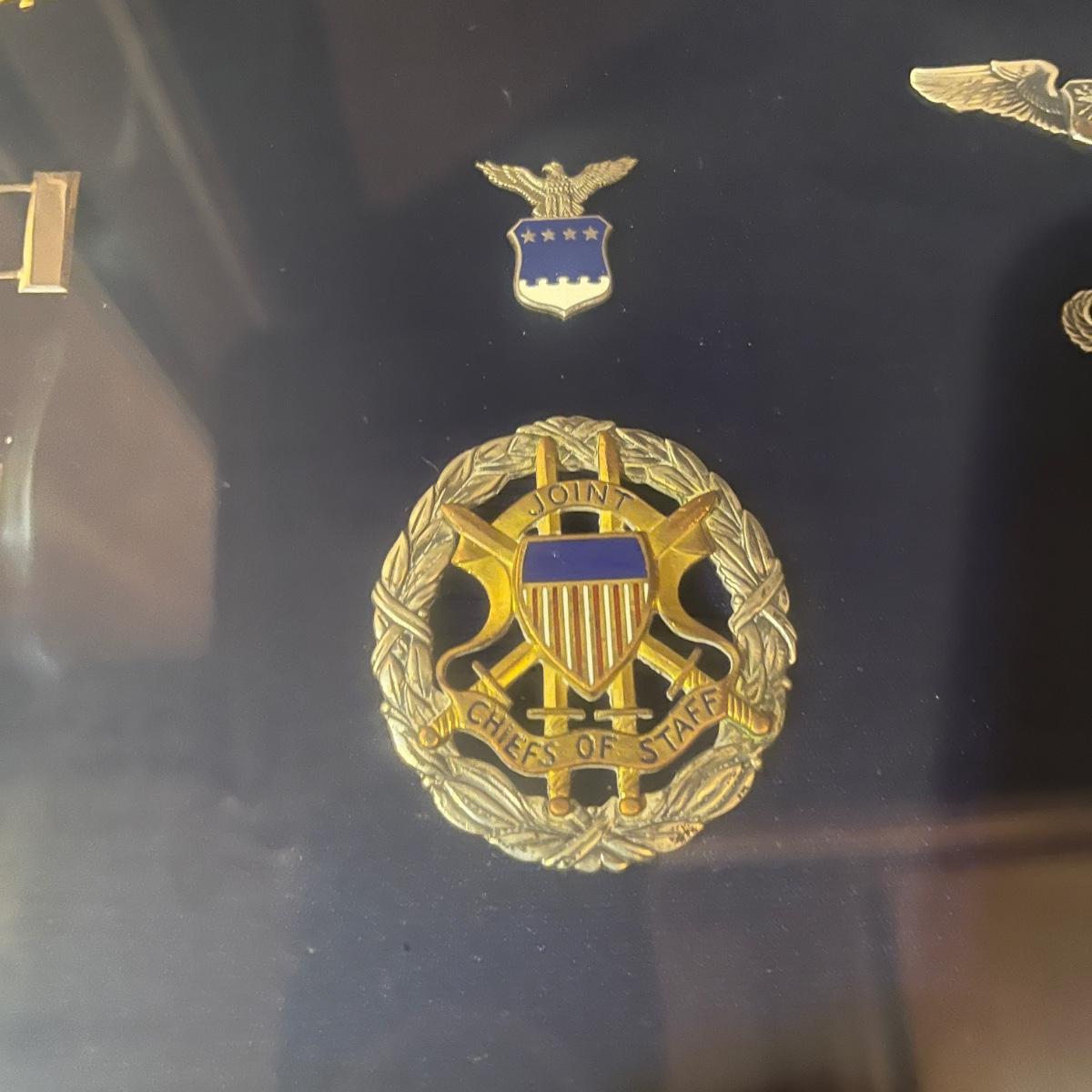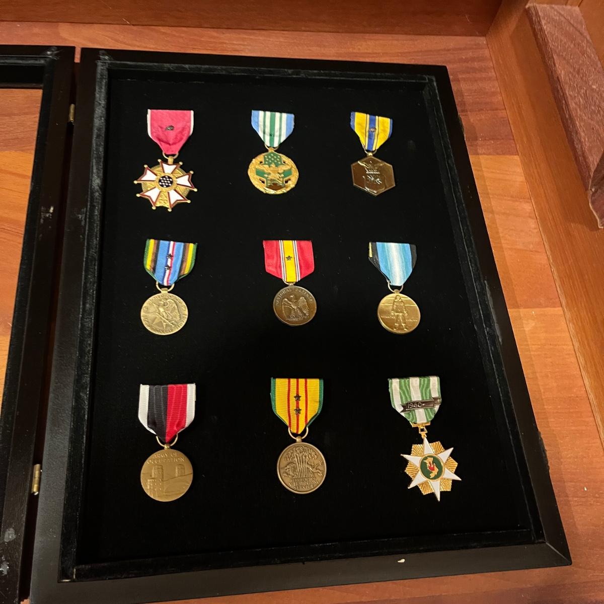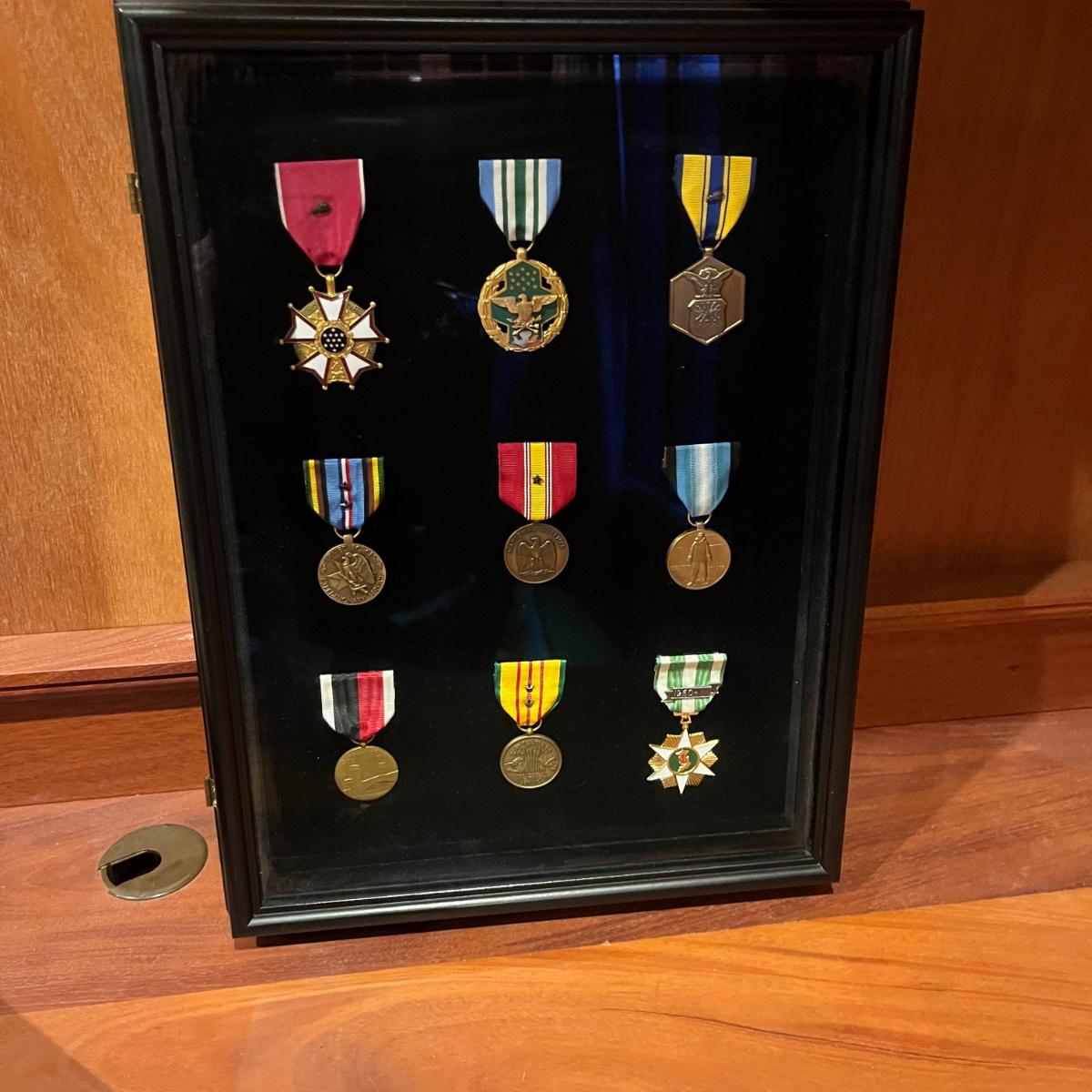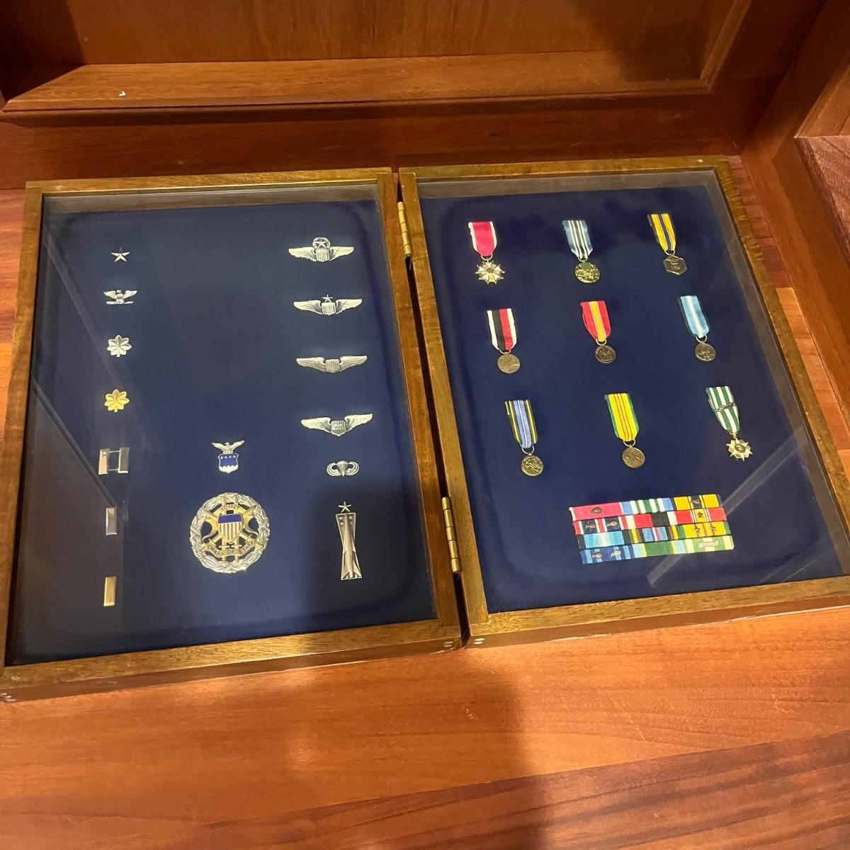 This collection of military medals, badges and pins includes Joint Chief of Staff badge, Vietnam medal, Antarctica medal and many more. All items are in wooden display frames and under glass. Folding frame measures 22.25” x 1.5” x 15”H when open and 11” x 3” x 15”H when closed.