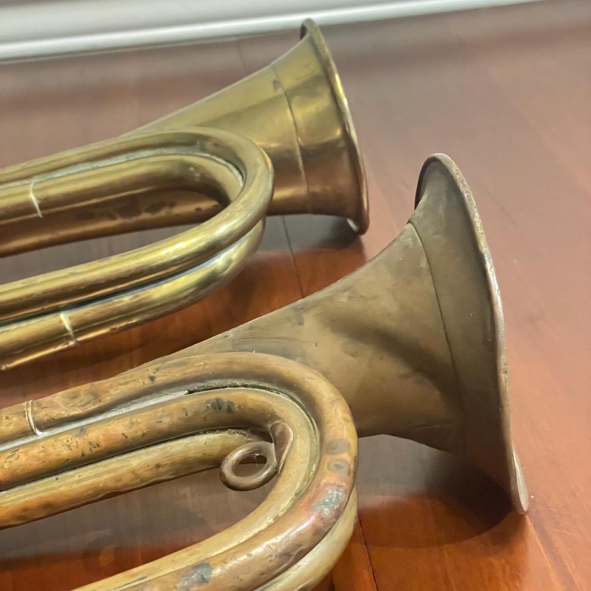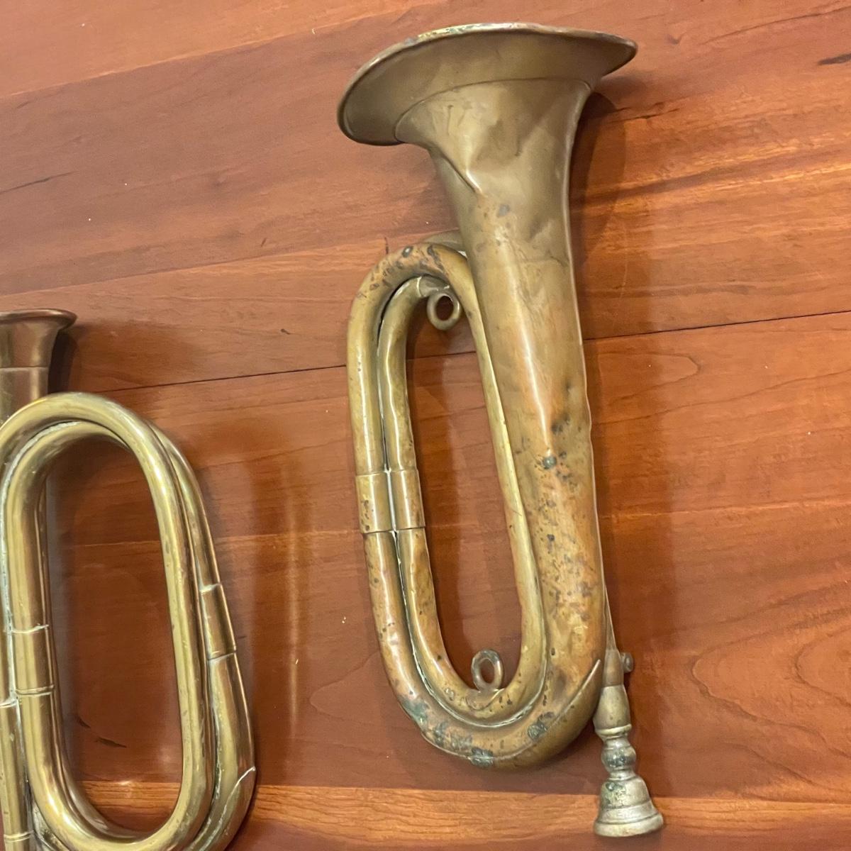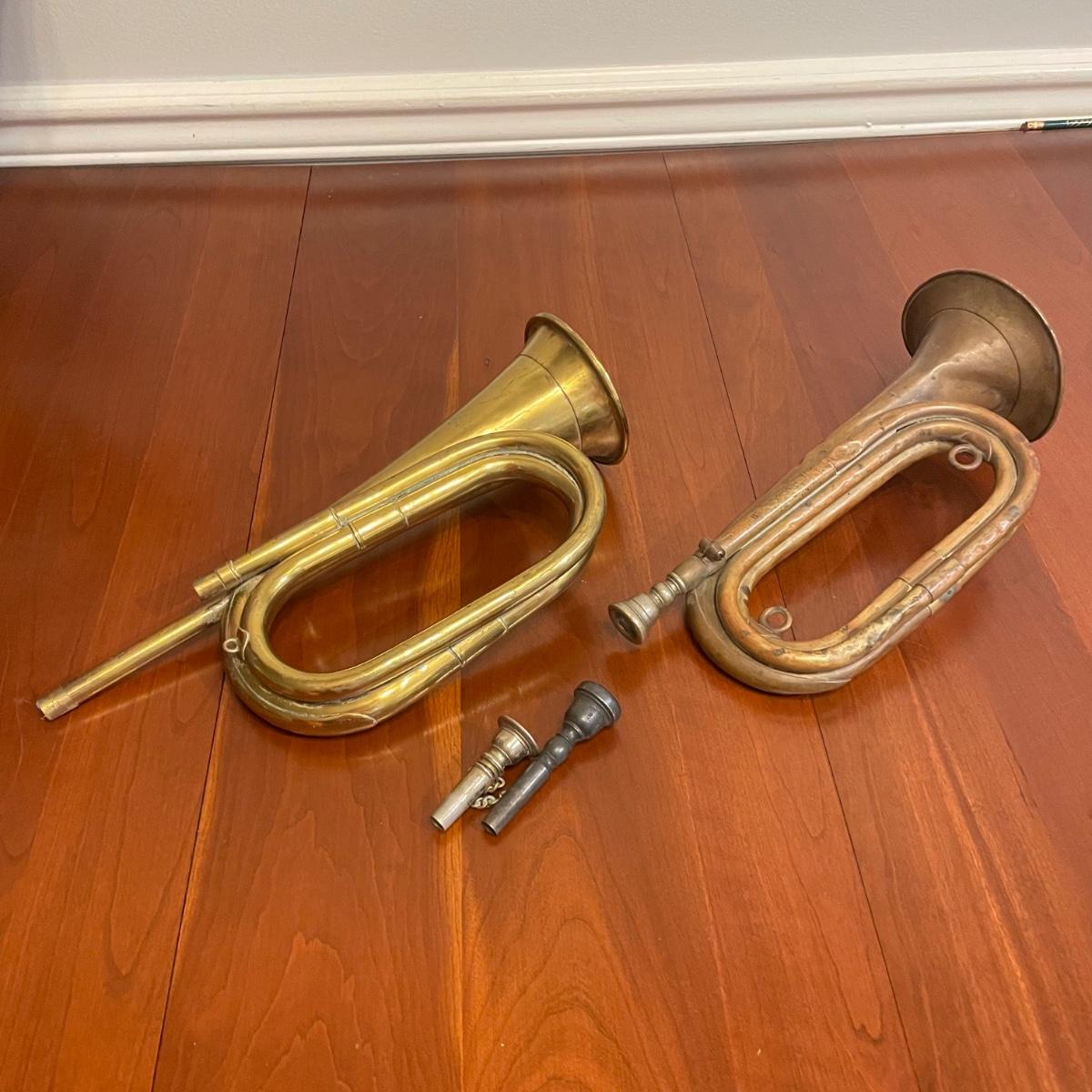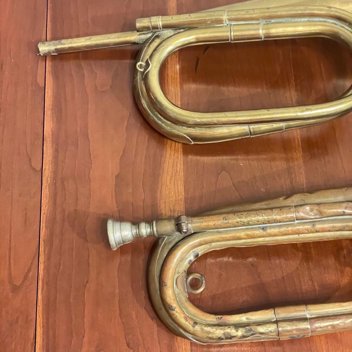 Two vintage, perhaps antique, bugles and two mouth pieces, one marked 6 CB. One bugle is dented and appears to be copper with a silver metal mouthpiece. The brass colored bugle has two openings See images. Shipping available.