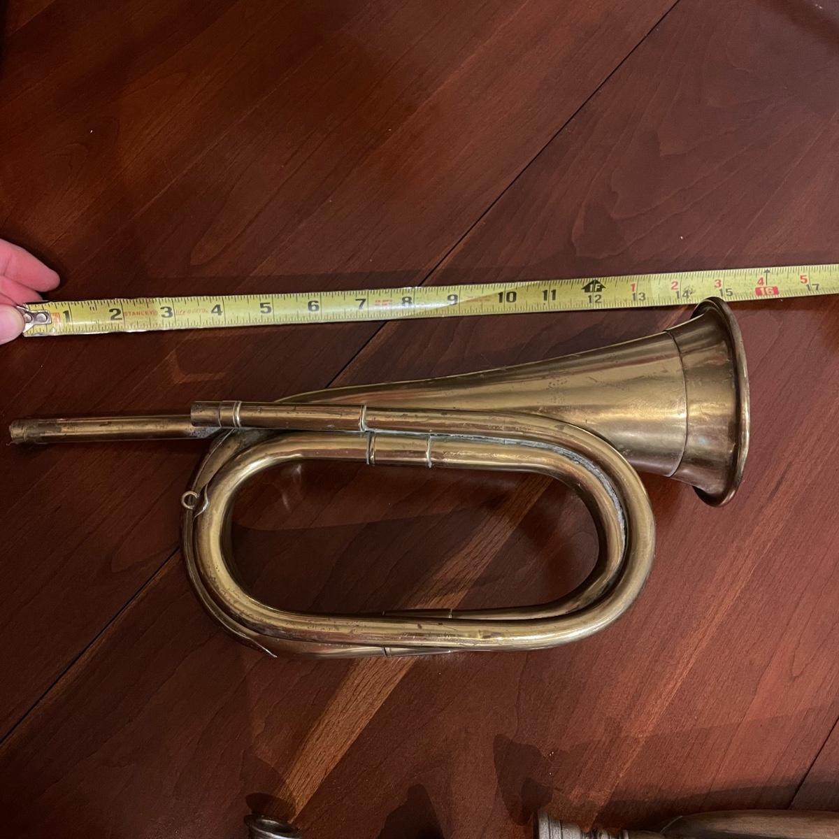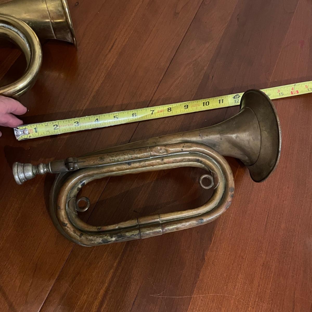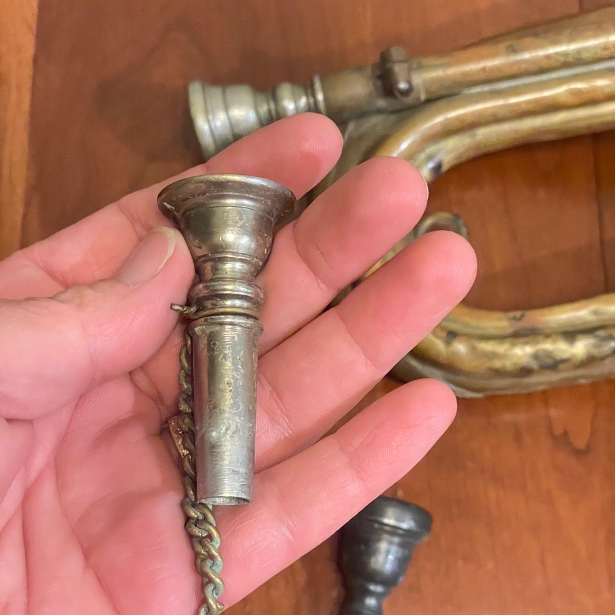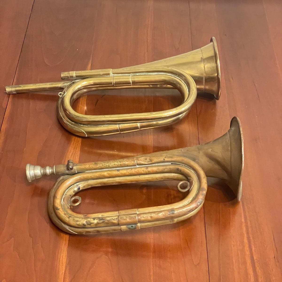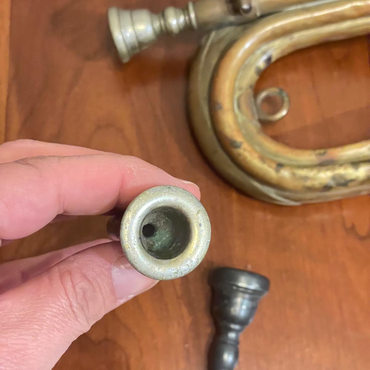 Two vintage, perhaps antique, bugles and two mouth pieces, one marked 6 CB. One bugle is dented and appears to be copper with a silver metal mouthpiece. The brass colored bugle has two openings See images. Shipping available.