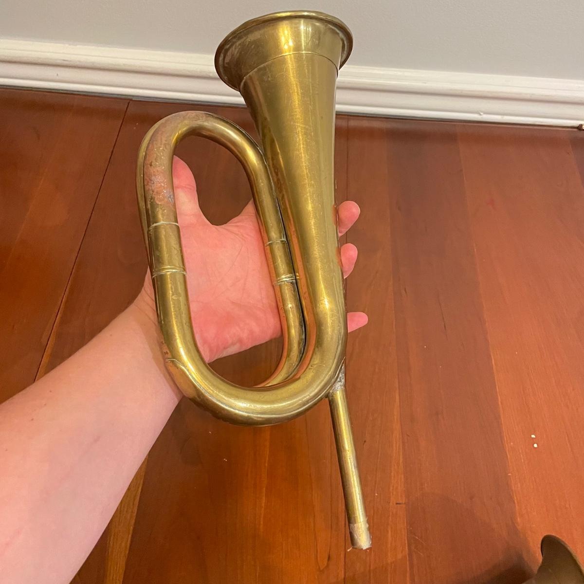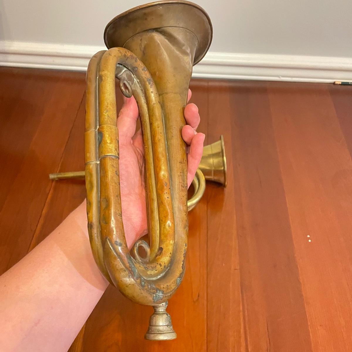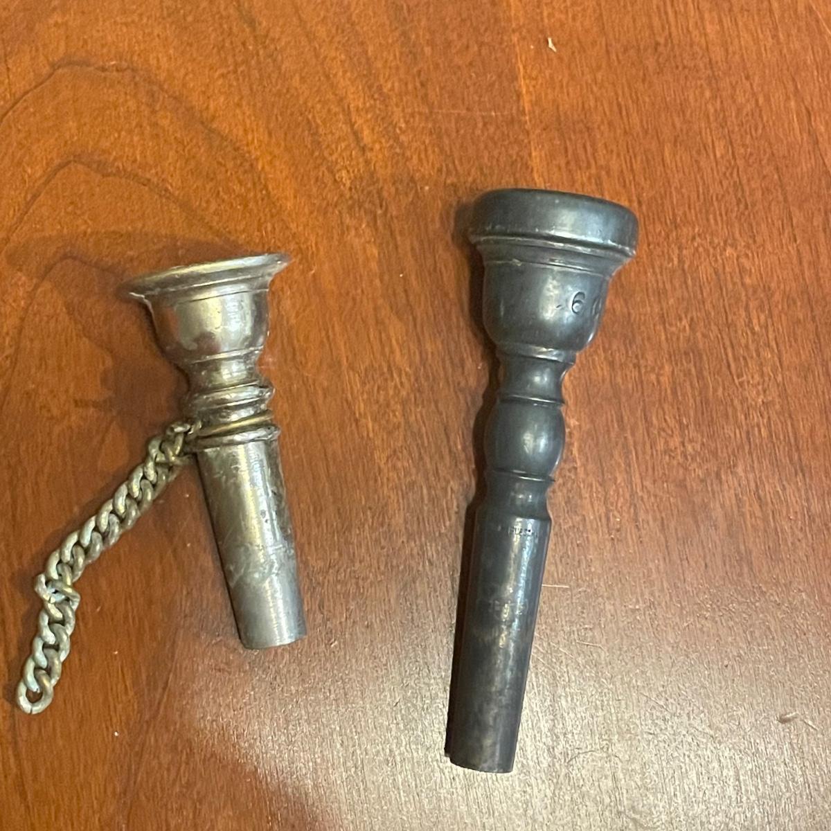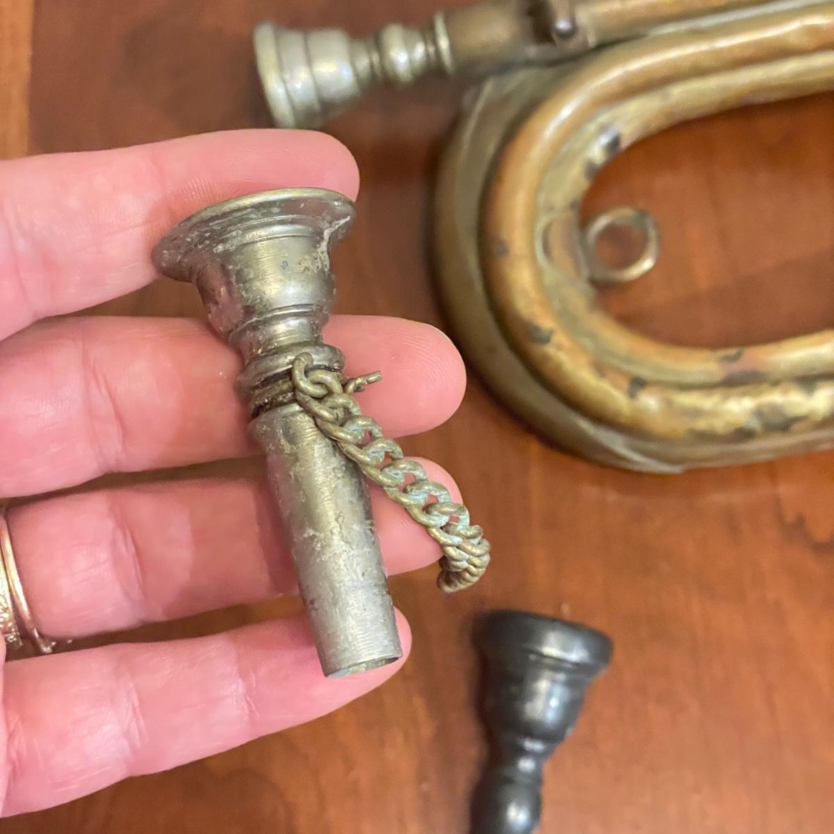 Two vintage, perhaps antique, bugles and two mouth pieces, one marked 6 CB. One bugle is dented and appears to be copper with a silver metal mouthpiece. The brass colored bugle has two openings See images. Shipping available.